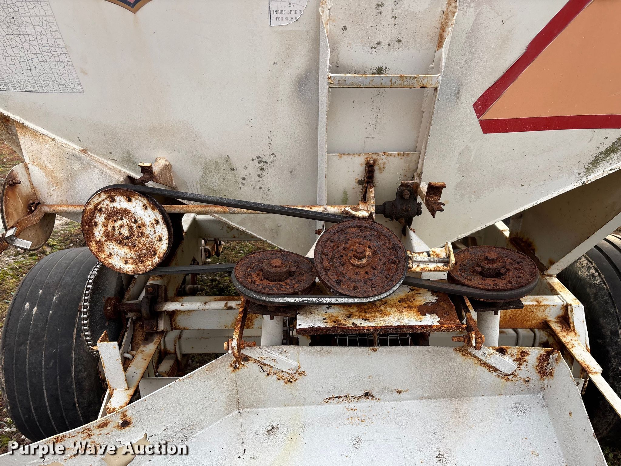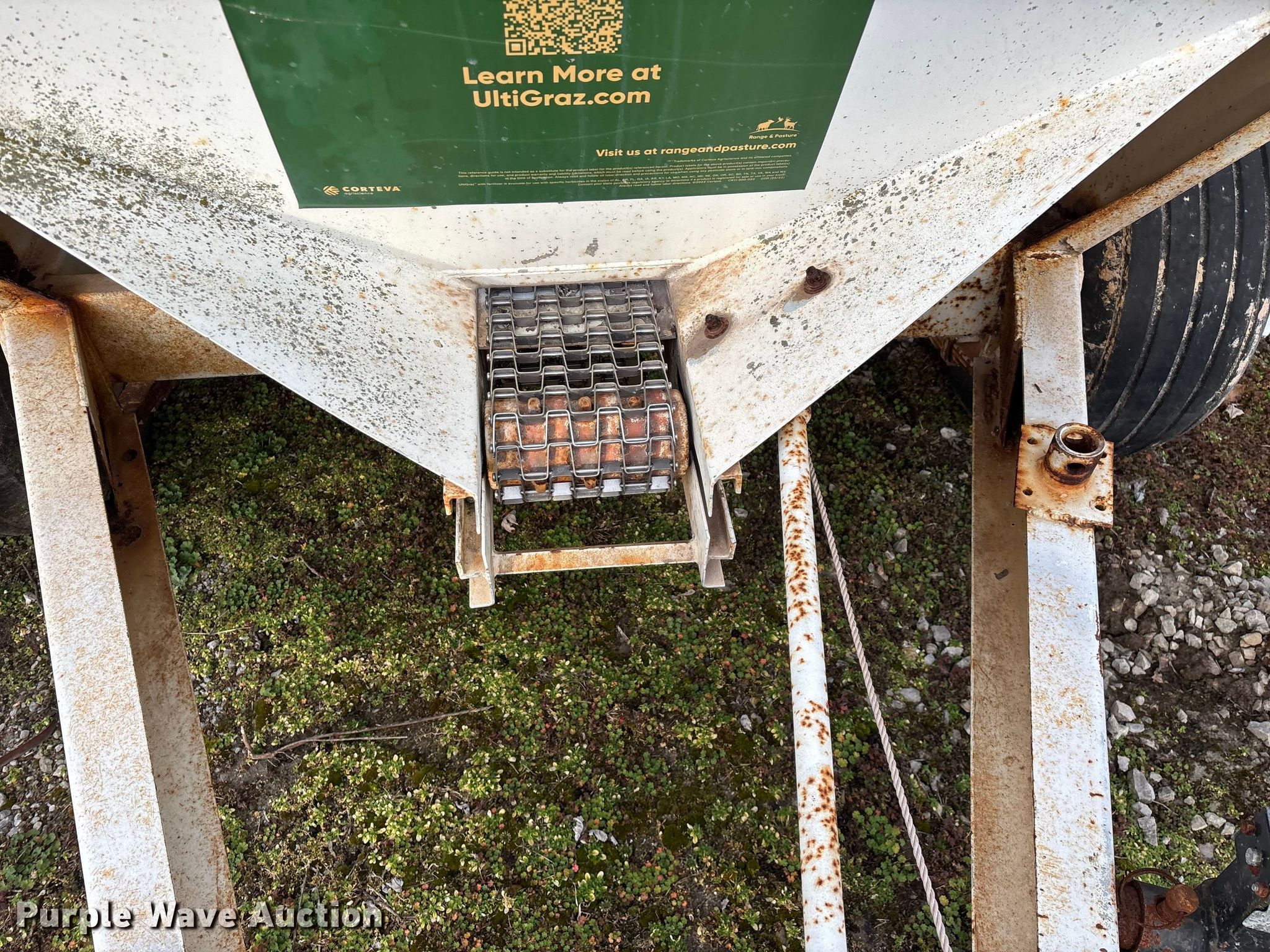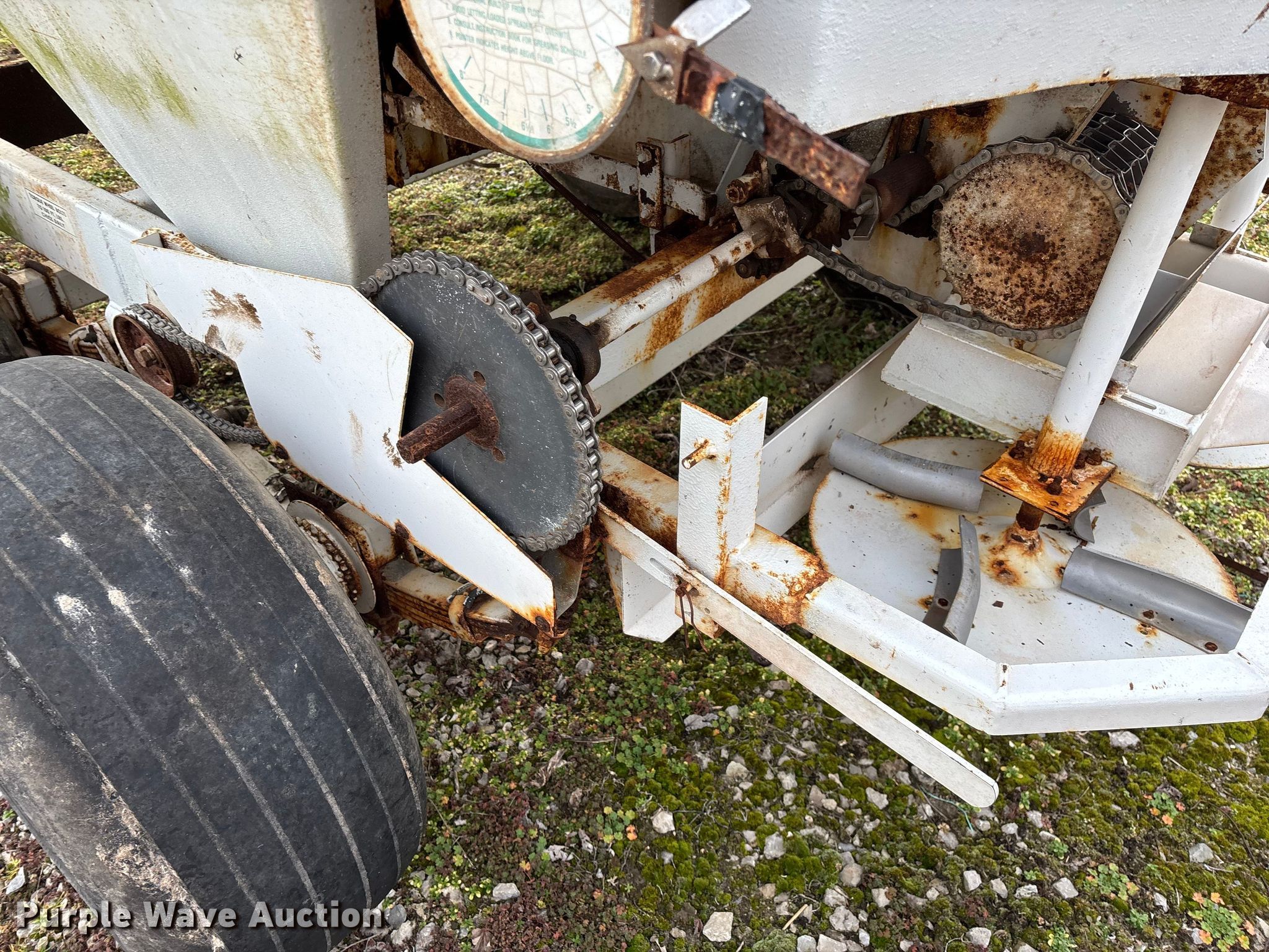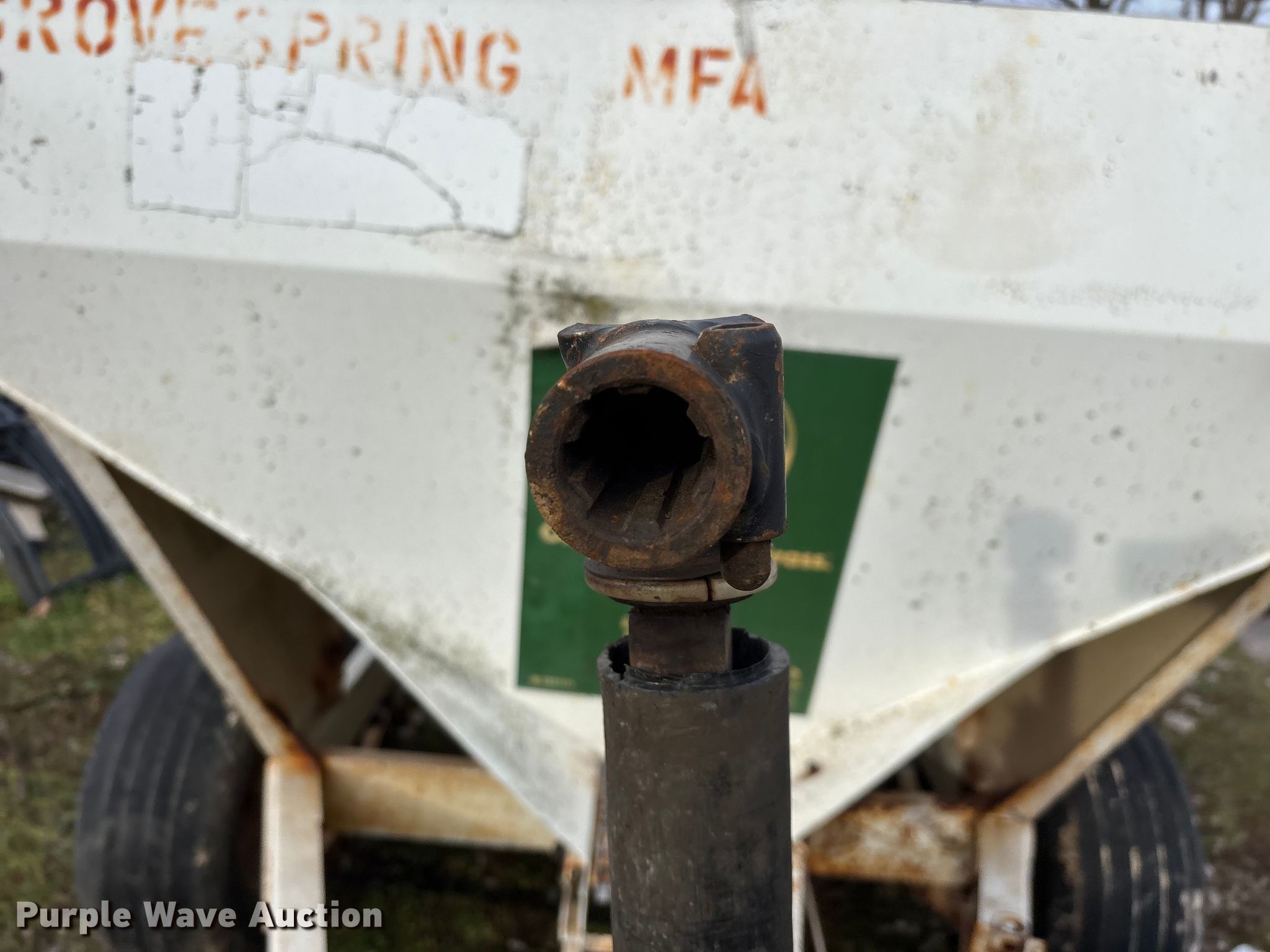 Willmar 500 spreader. Unit #: 1. Features PTO: 540, Dry fertilizer spreader Dual spinners, Ground driven, Conveyor/chain Width: 7".. Tires Size: 12.5L-15SL. Notes Frame rust damage, Decals will be removed prior to auction, Tire flat. MFA Farmers Produce Exchange. Grovespring, MO 65662