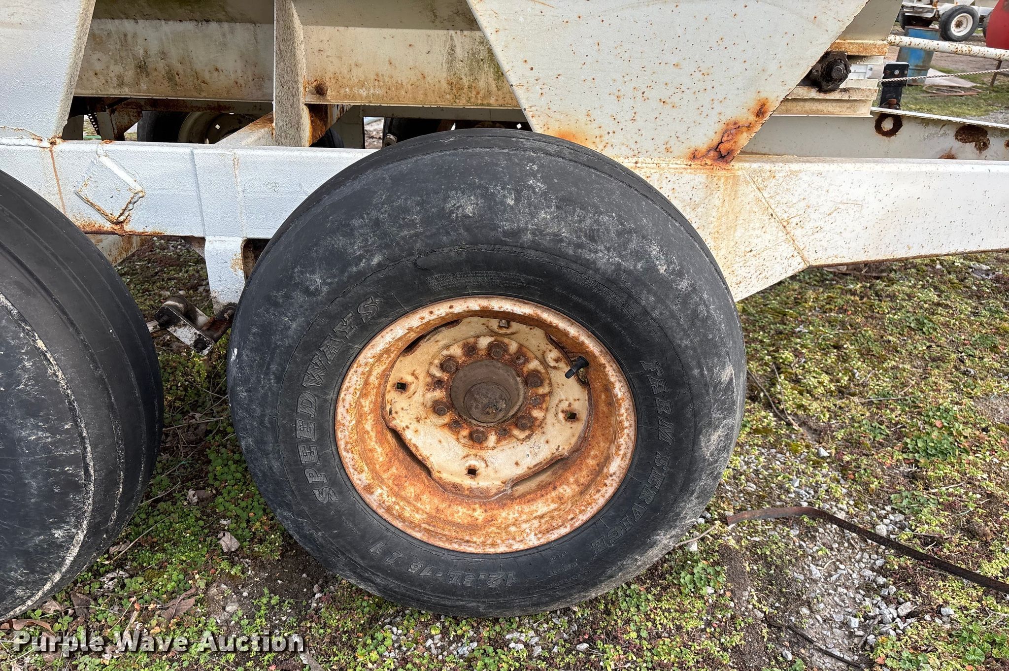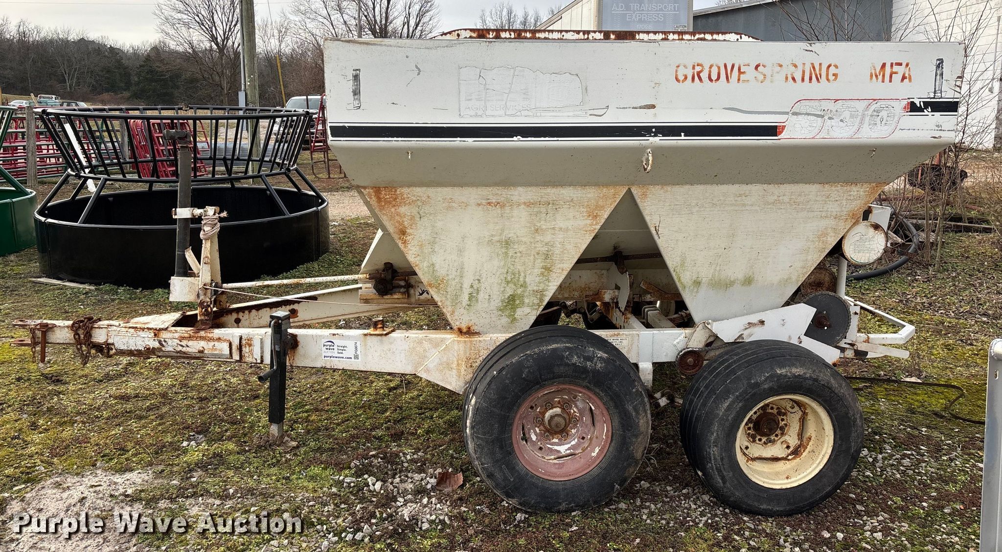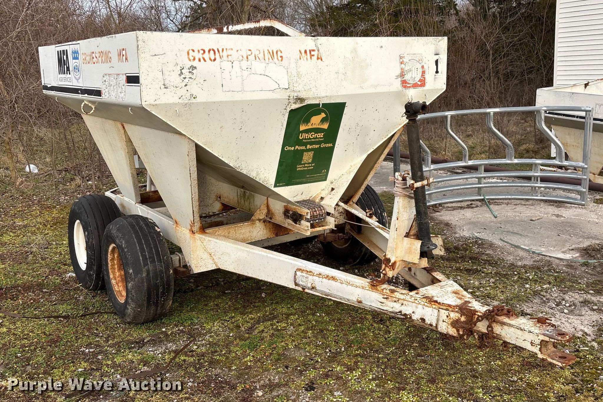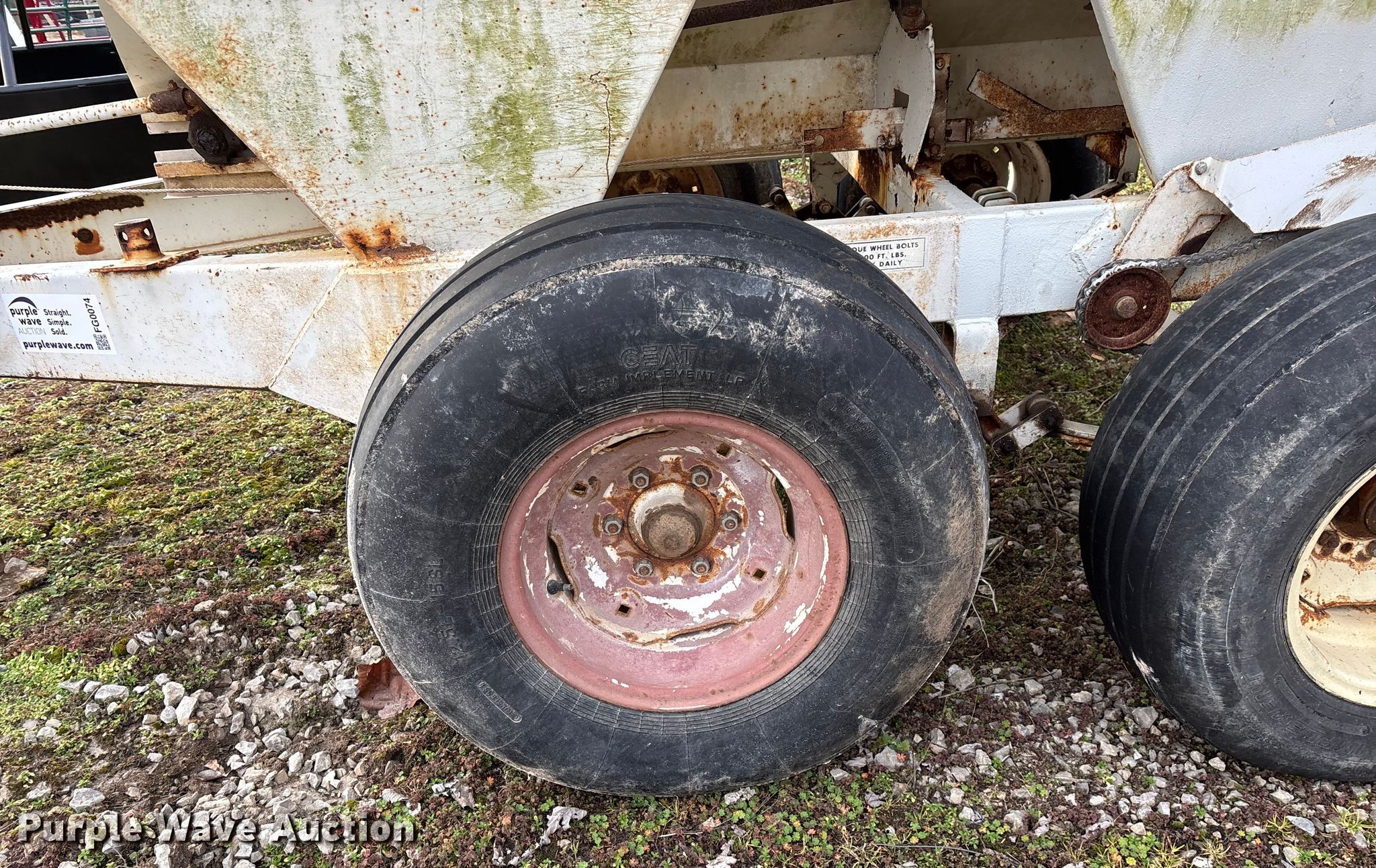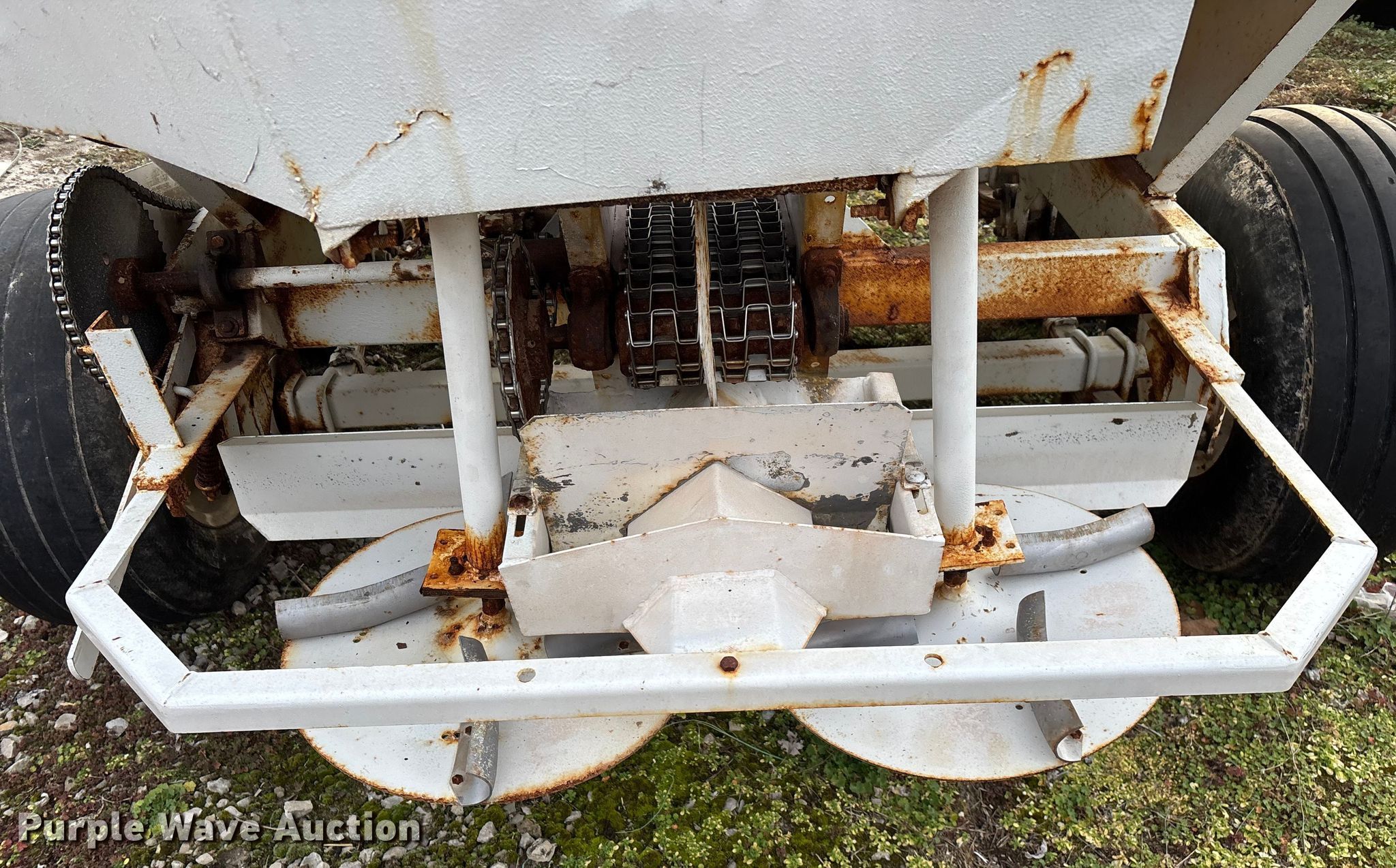 Willmar 500 spreader. Unit #: 1. Features PTO: 540, Dry fertilizer spreader Dual spinners, Ground driven, Conveyor/chain Width: 7".. Tires Size: 12.5L-15SL. Notes Frame rust damage, Decals will be removed prior to auction, Tire flat. MFA Farmers Produce Exchange. Grovespring, MO 65662
