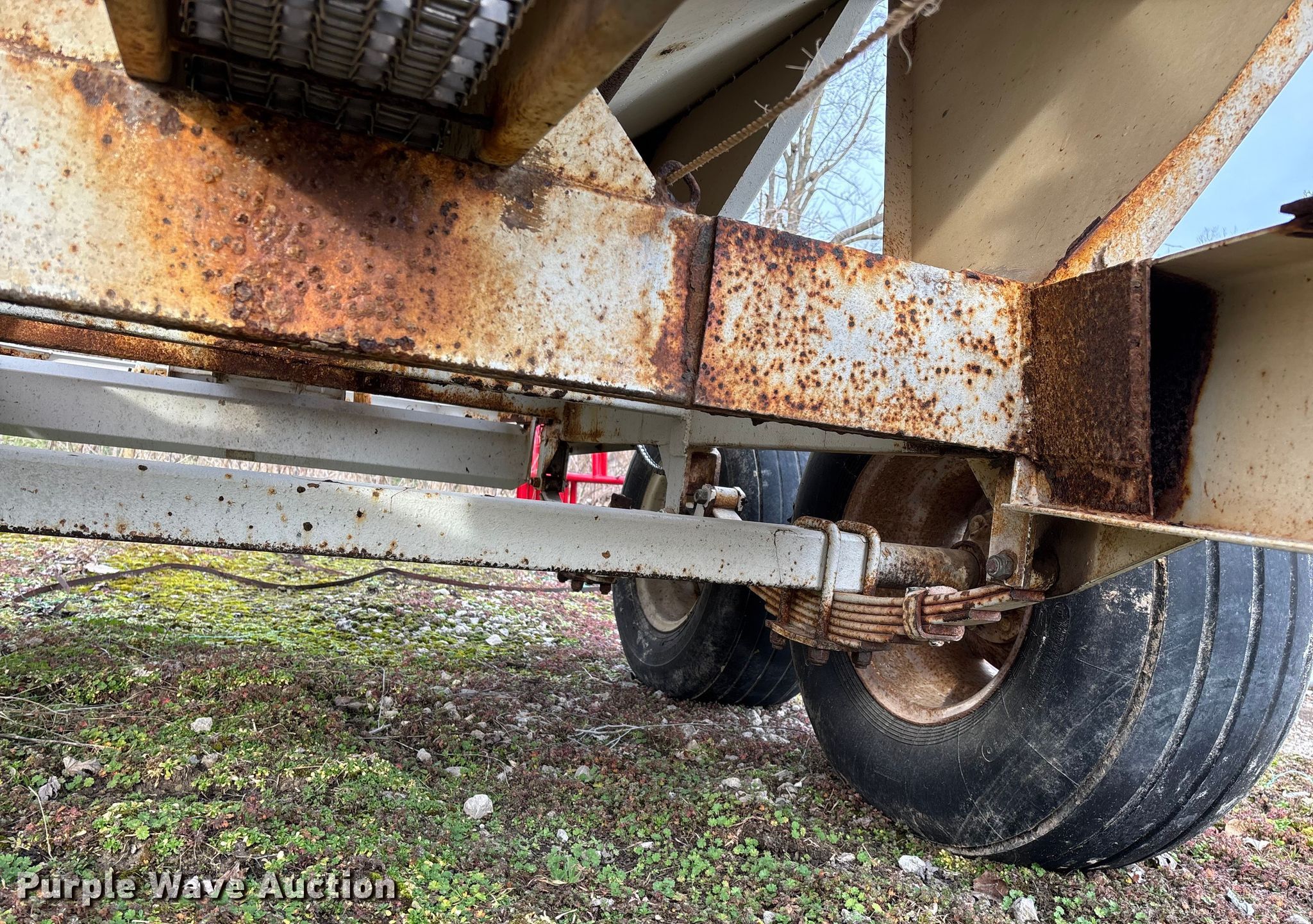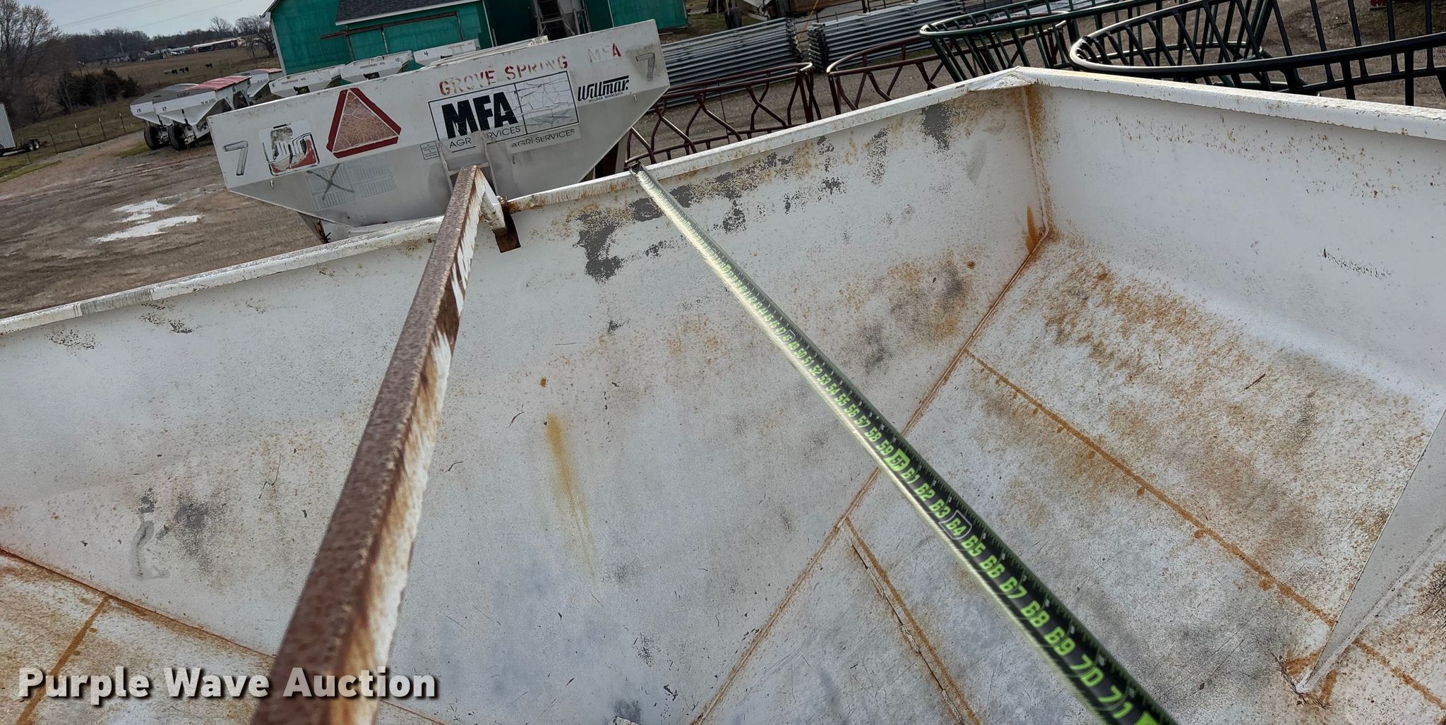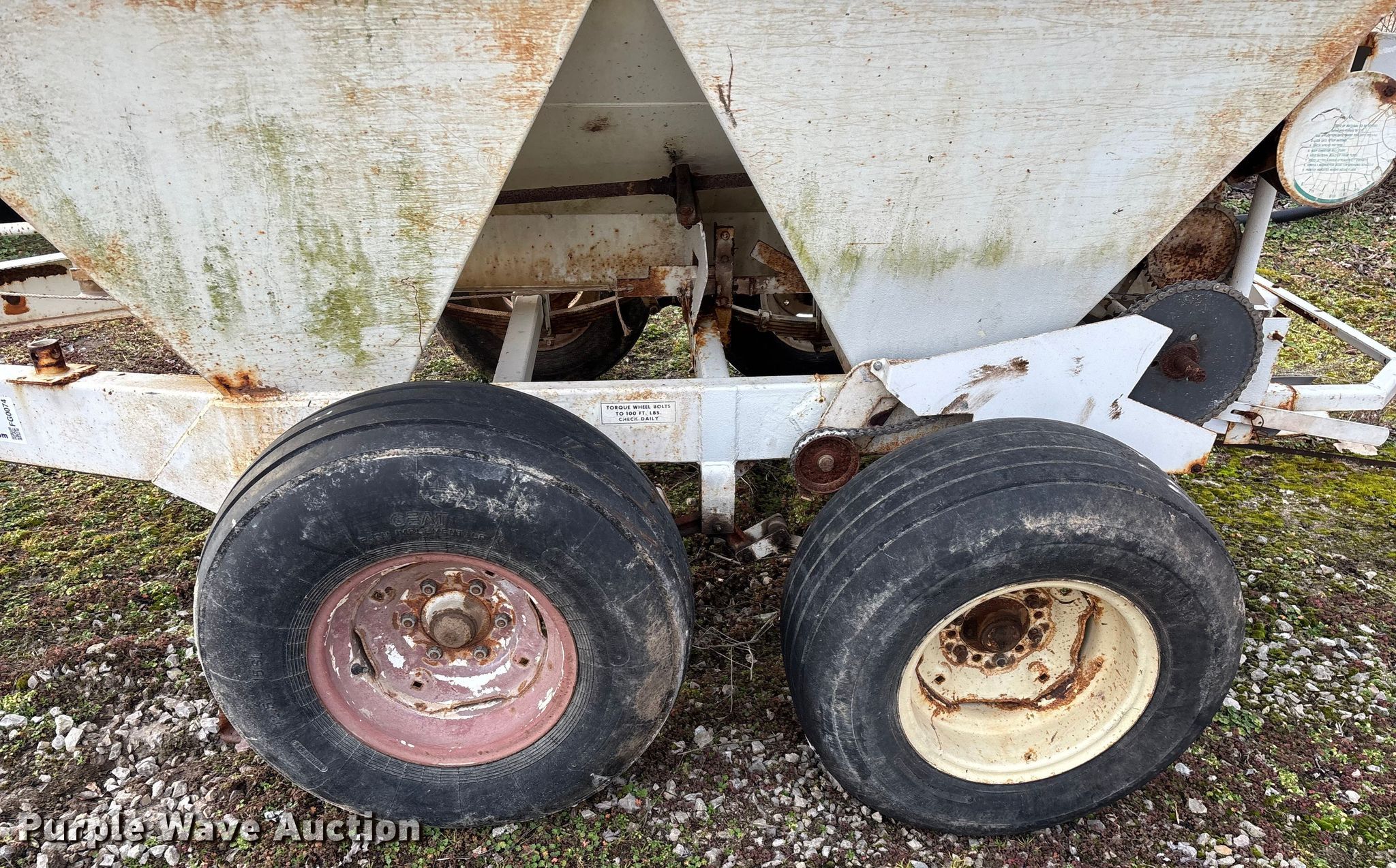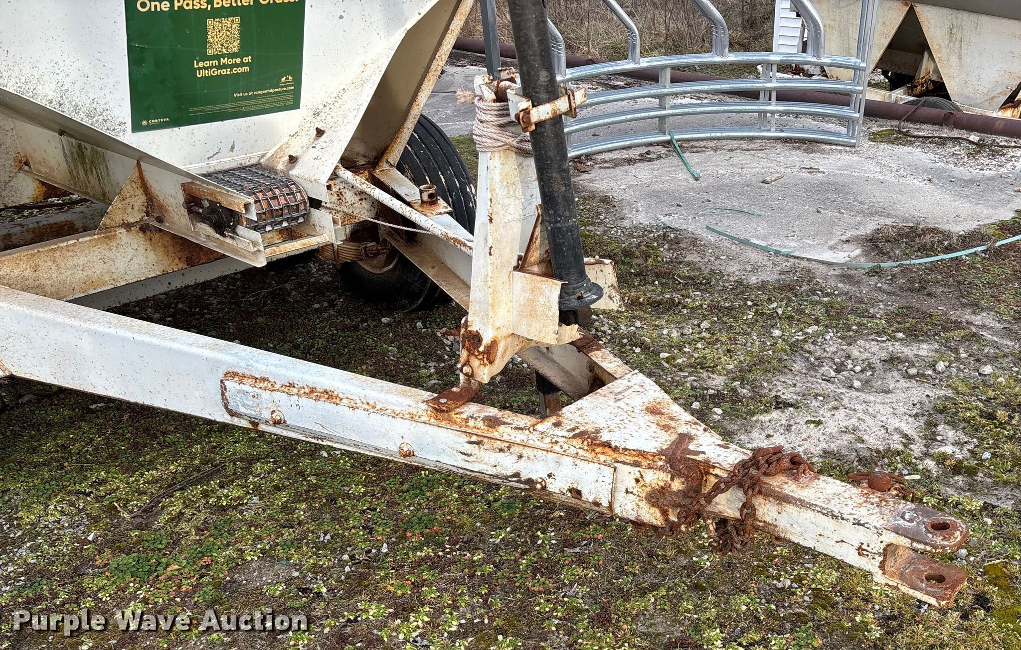 Willmar 500 spreader. Unit #: 1. Features PTO: 540, Dry fertilizer spreader Dual spinners, Ground driven, Conveyor/chain Width: 7".. Tires Size: 12.5L-15SL. Notes Frame rust damage, Decals will be removed prior to auction, Tire flat. MFA Farmers Produce Exchange. Grovespring, MO 65662