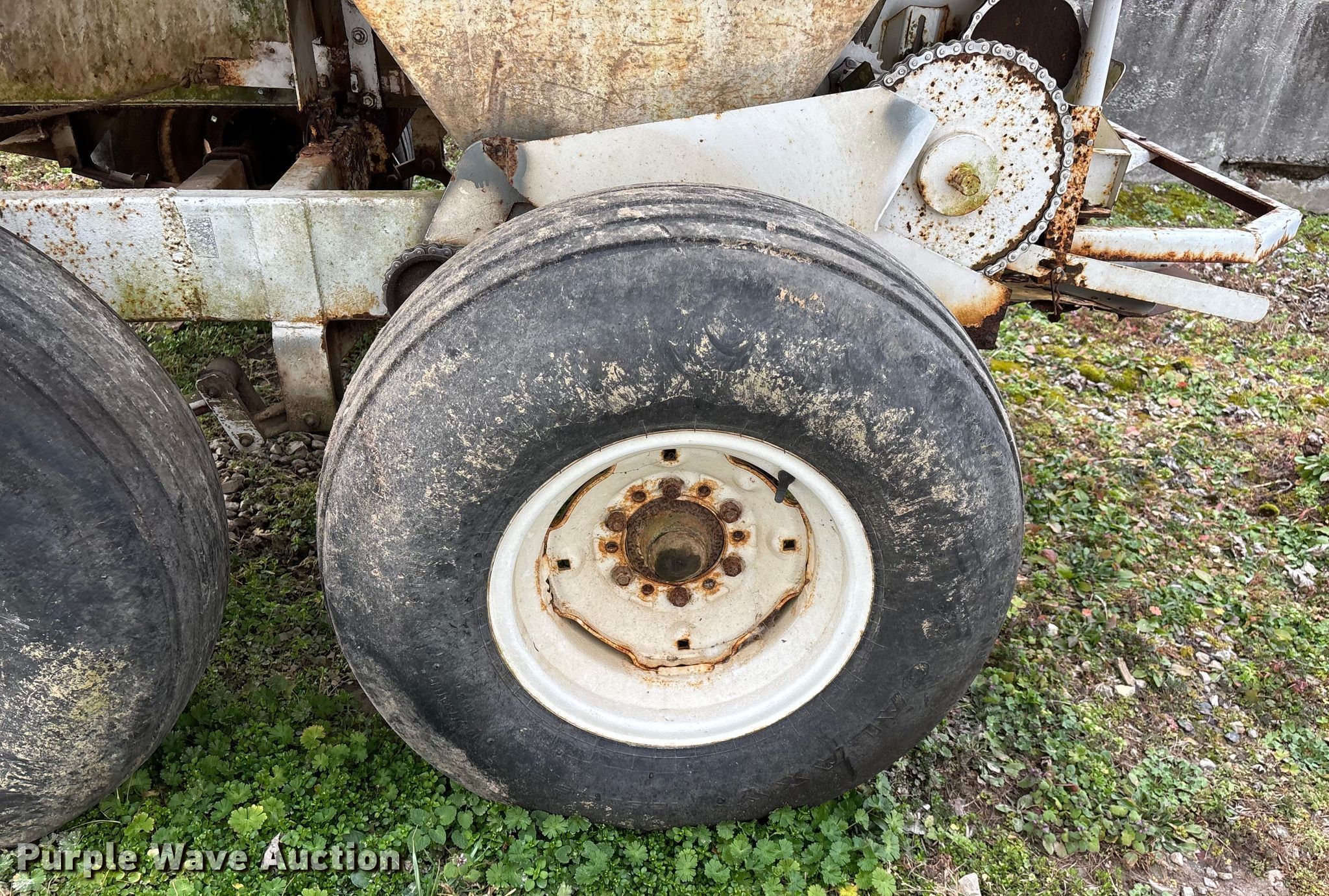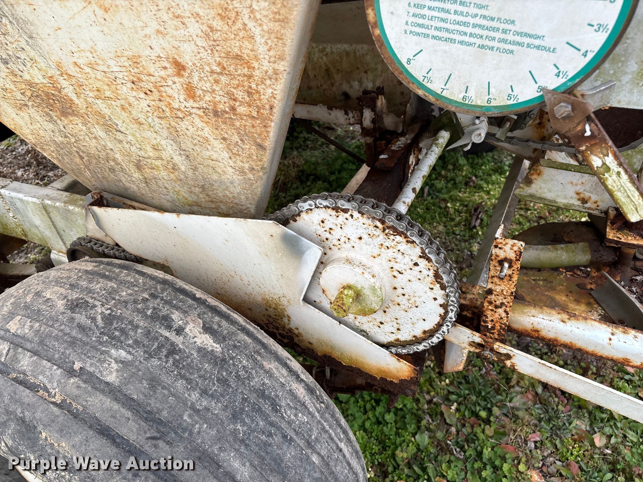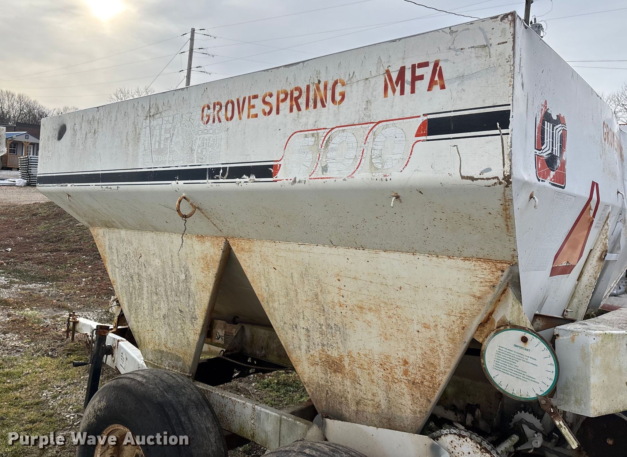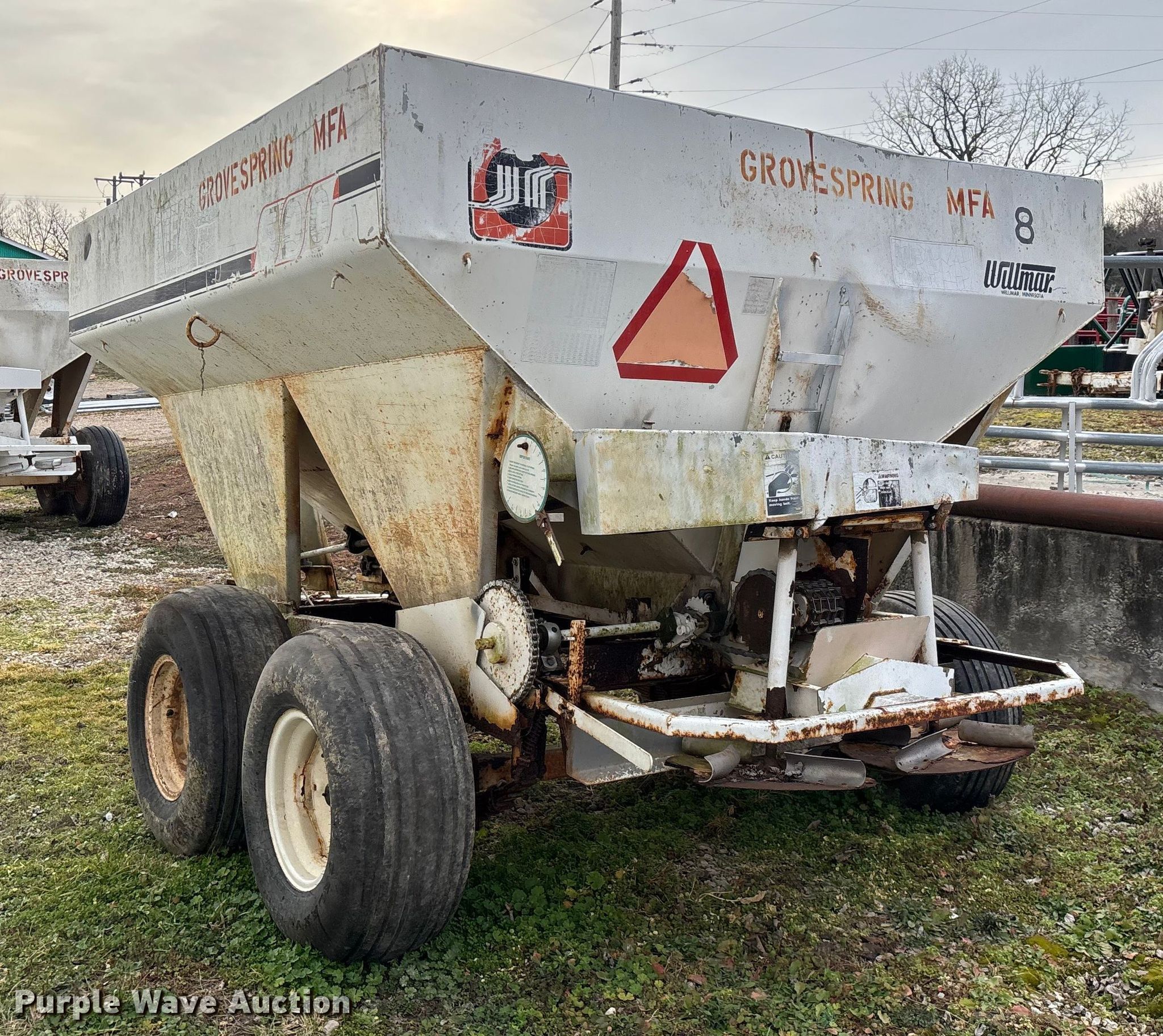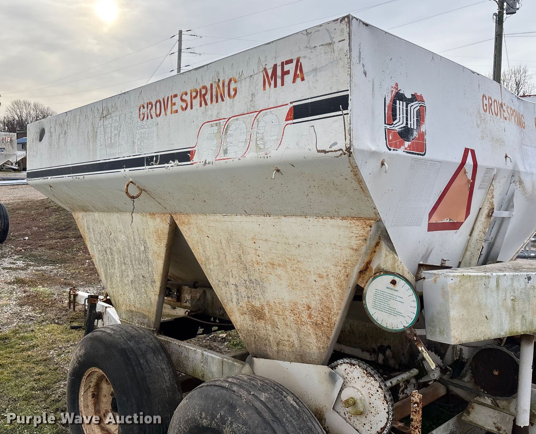 Willmar 500 spreader. Unit #: 8. Features Dry fertilizer spreader Dual spinners, Ground driven, Conveyor/chain Width: 7".. Tires Size: 12.5L-15SL. Notes Decals will be removed prior to auction, PTO half shaft missing, Flat tire. MFA Farmers Produce Exchange. Grovespring, MO 65662