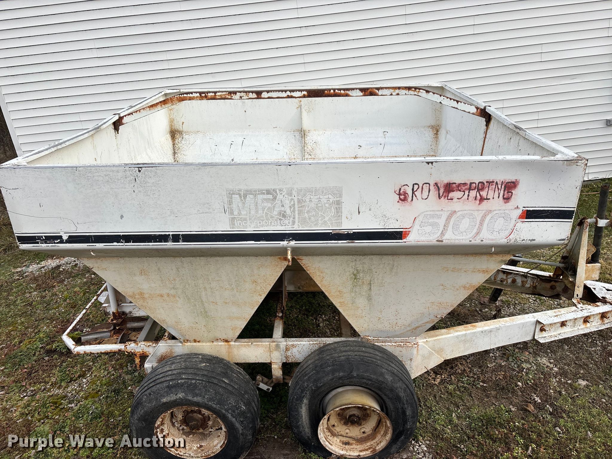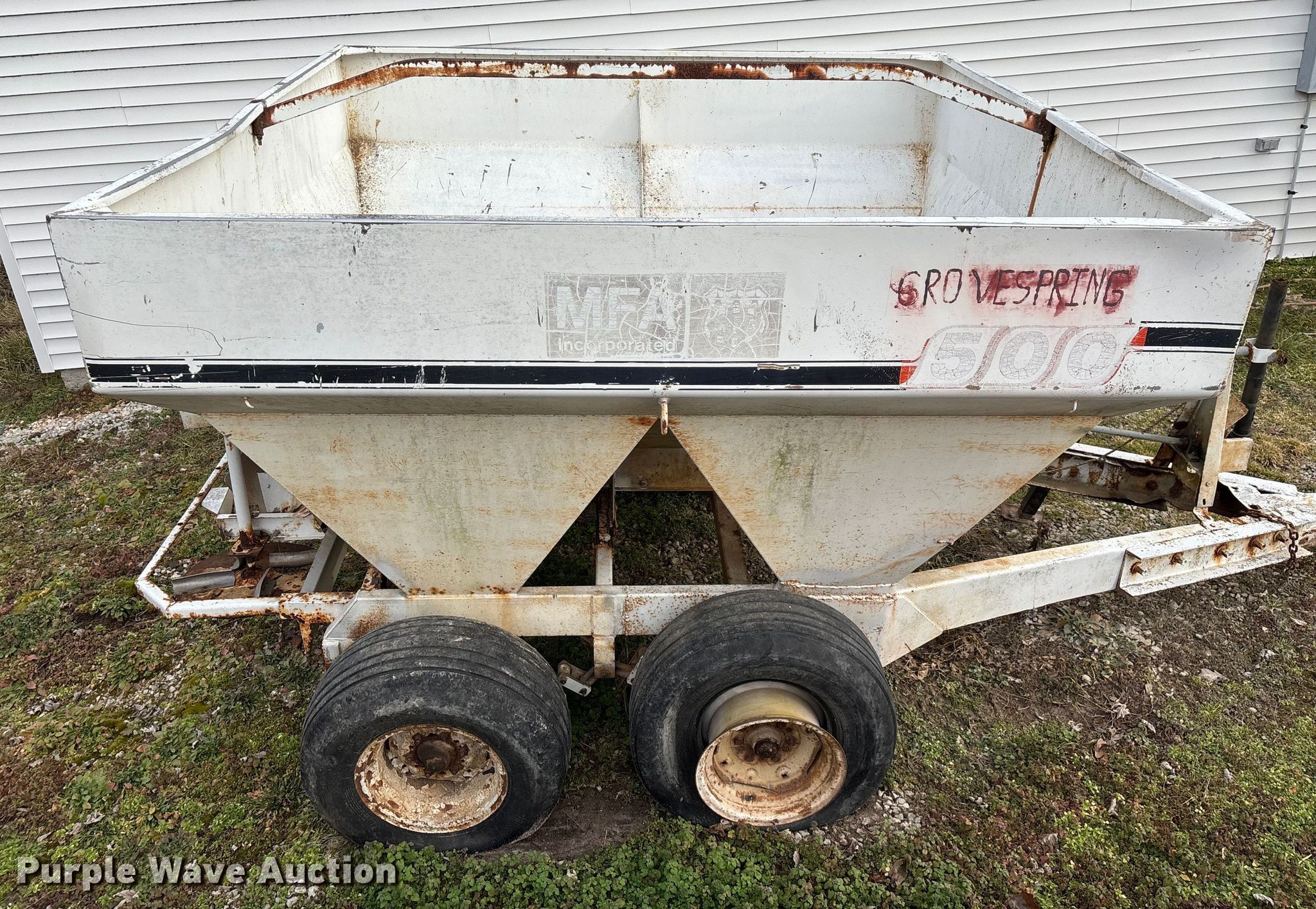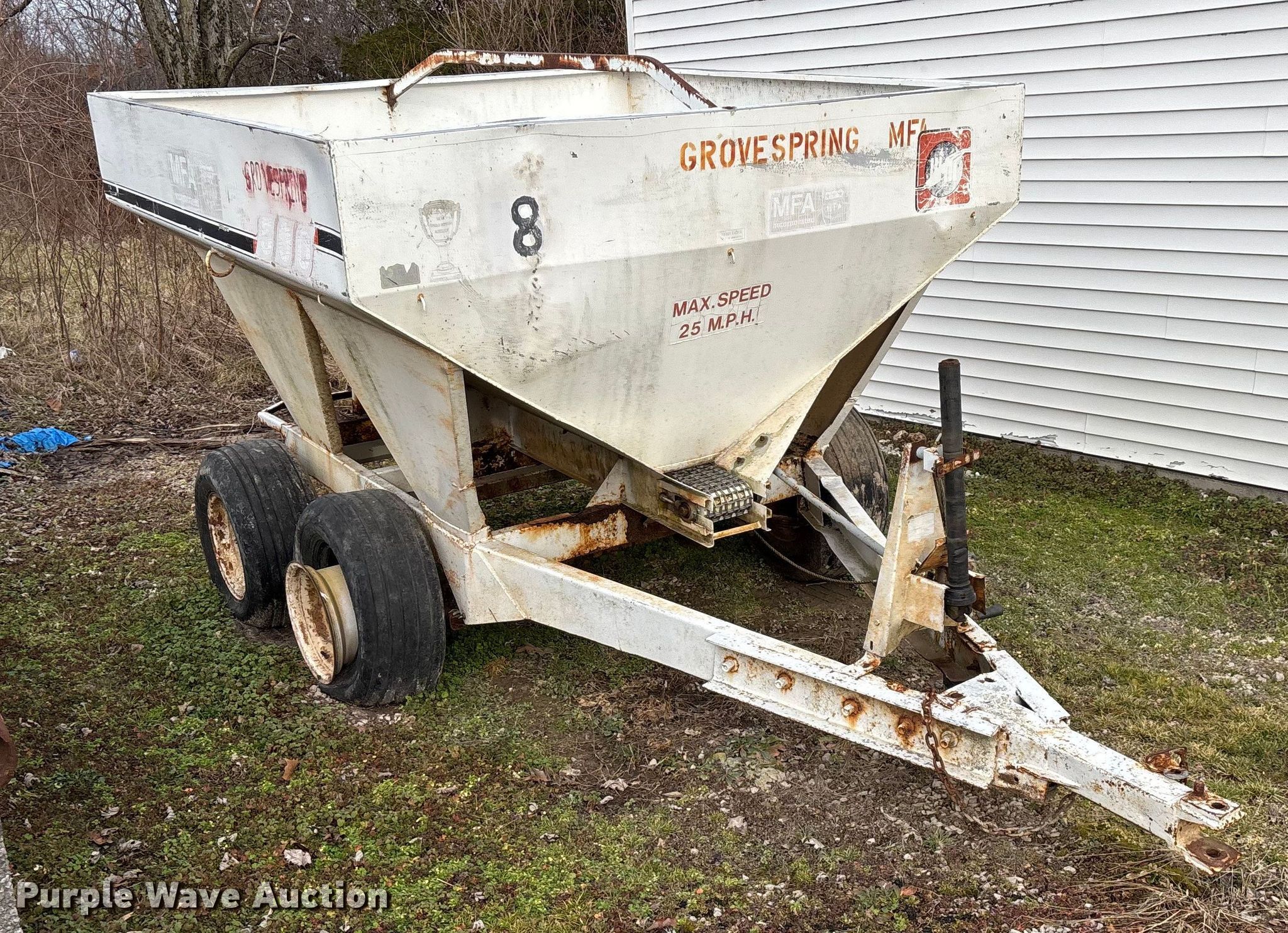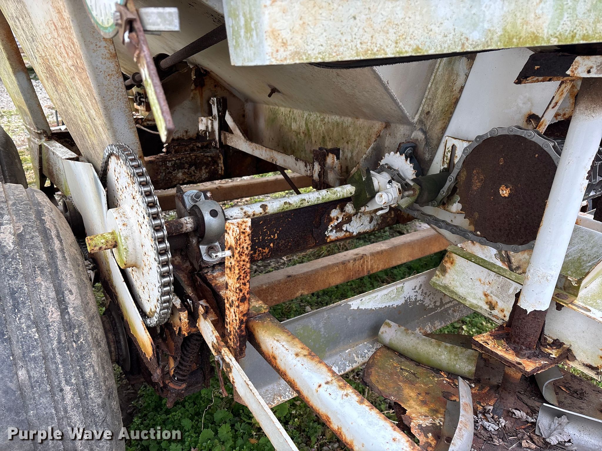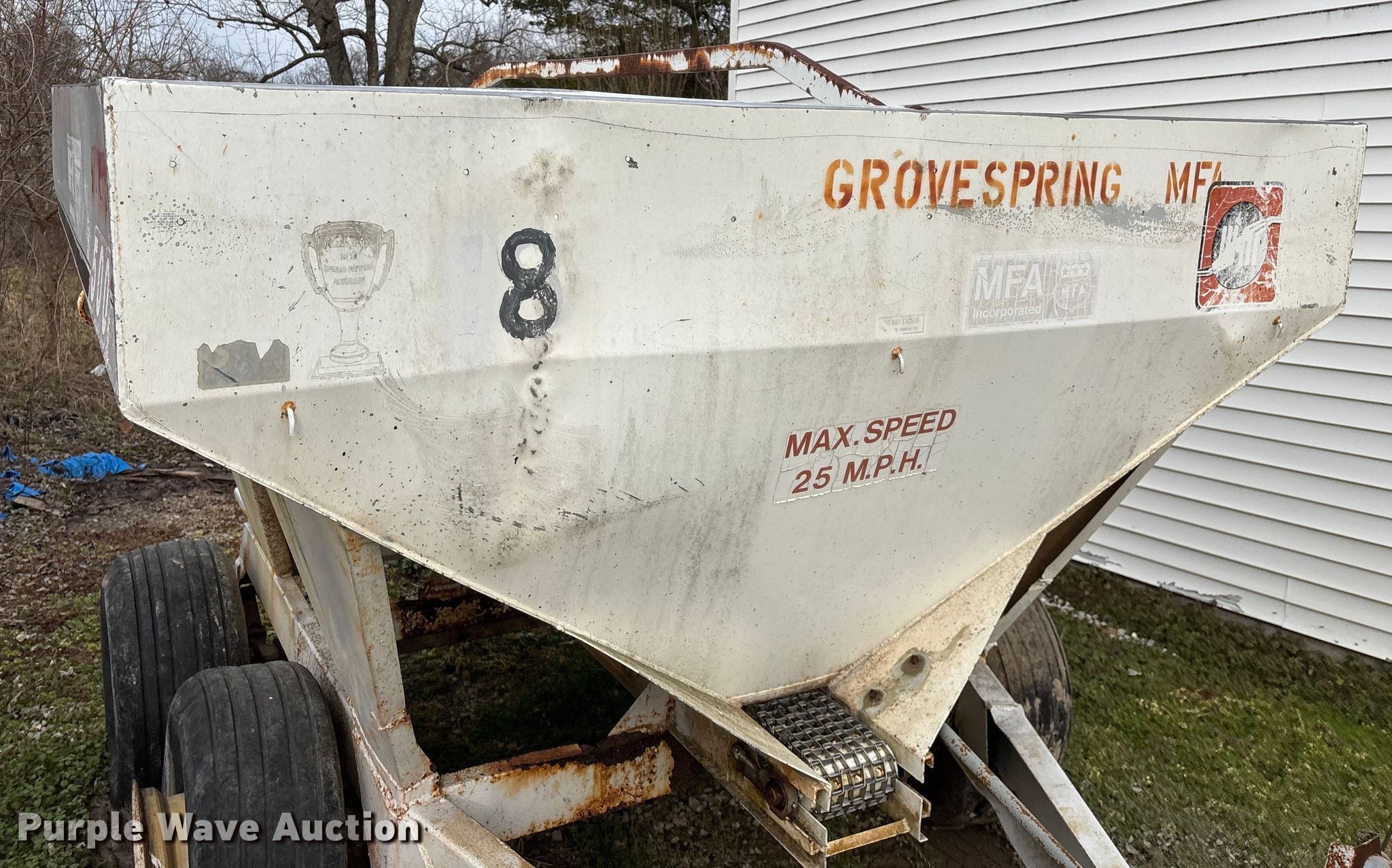 Willmar 500 spreader. Unit #: 8. Features Dry fertilizer spreader Dual spinners, Ground driven, Conveyor/chain Width: 7".. Tires Size: 12.5L-15SL. Notes Decals will be removed prior to auction, PTO half shaft missing, Flat tire. MFA Farmers Produce Exchange. Grovespring, MO 65662