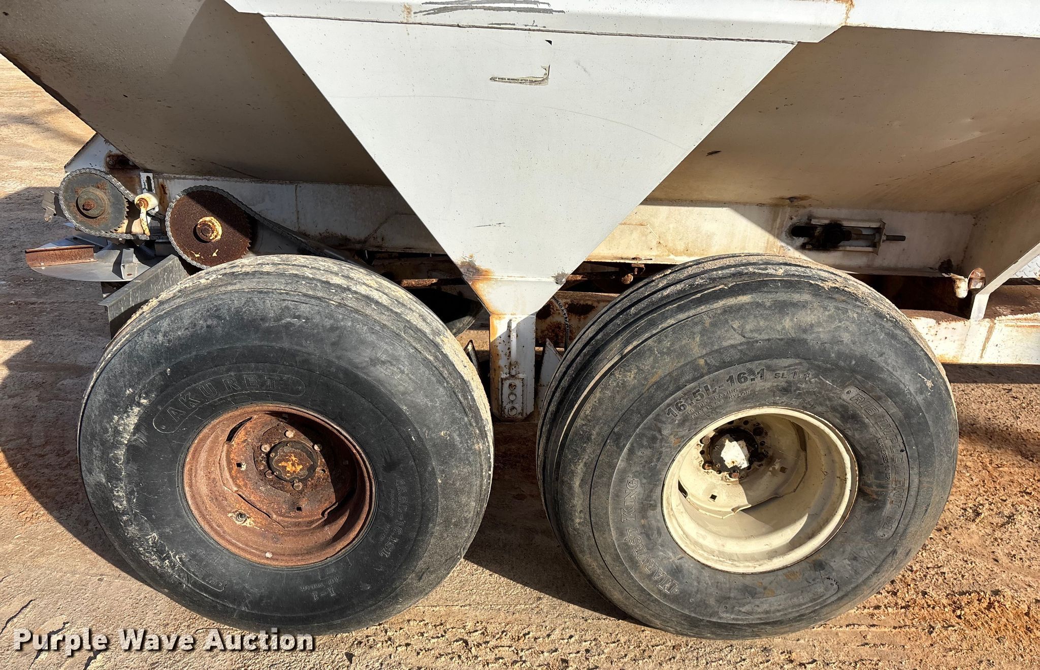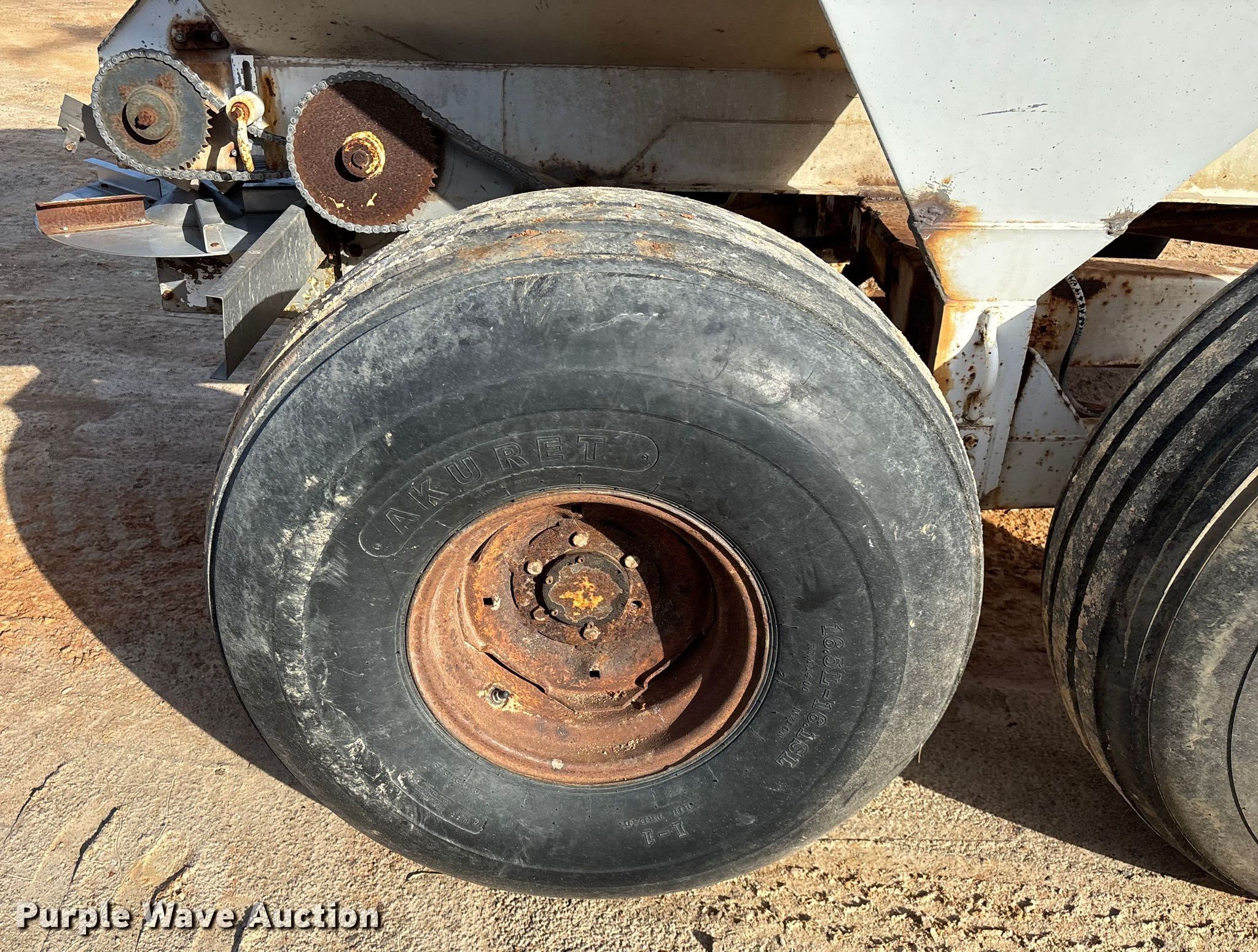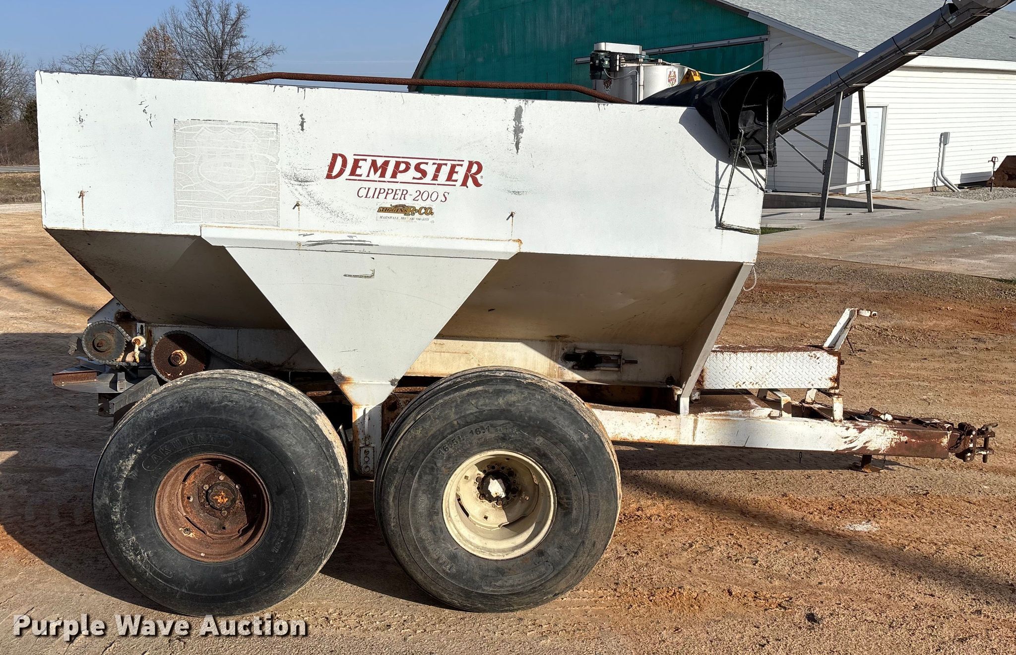 Dempster Clipper-200S spreader. Unit #: 3. Features Dry fertilizer spreader Stainless steel, Roll tarp, Ground driven, Conveyor/chain Width: 10".. Tires Size: 16.5L-16.1SL. Notes PTO half shaft missing, Non-operational brakes, parts missing, Contents not included, Decals will be removed prior to auction. MFA Farmers Produce Exchange. Lebanon, MO 65536