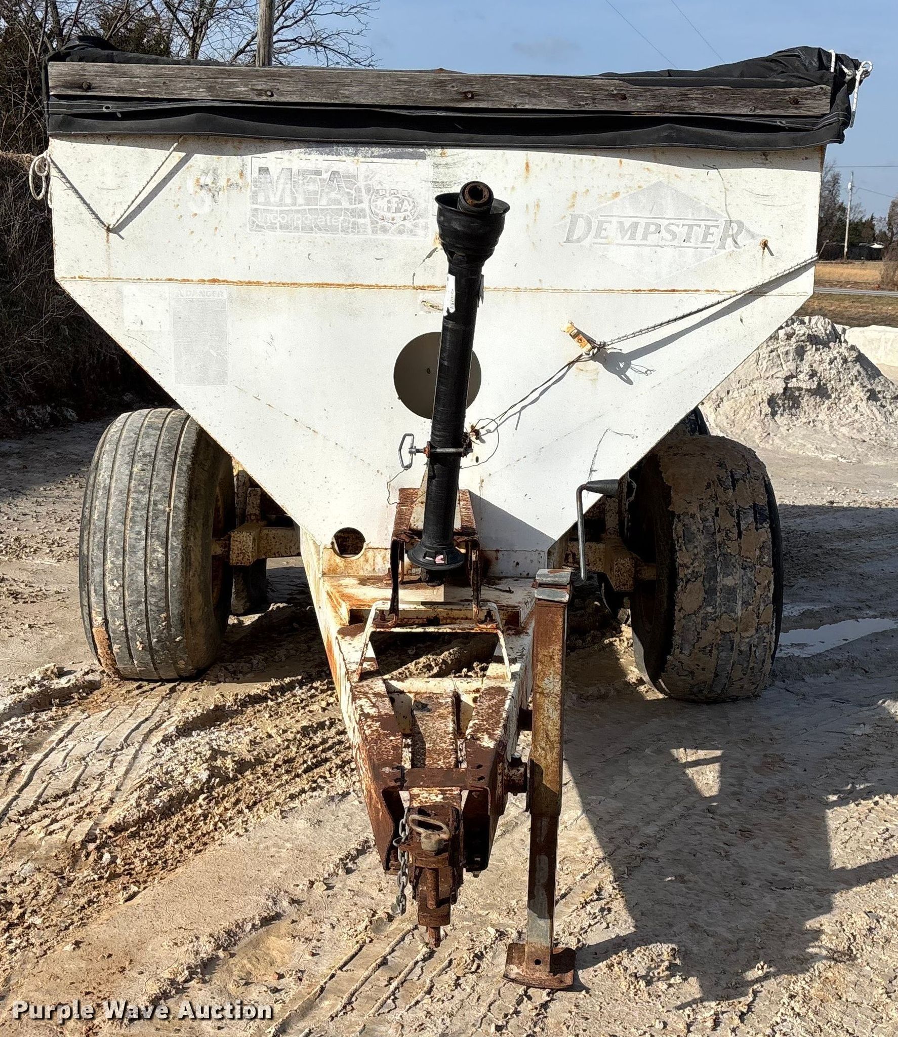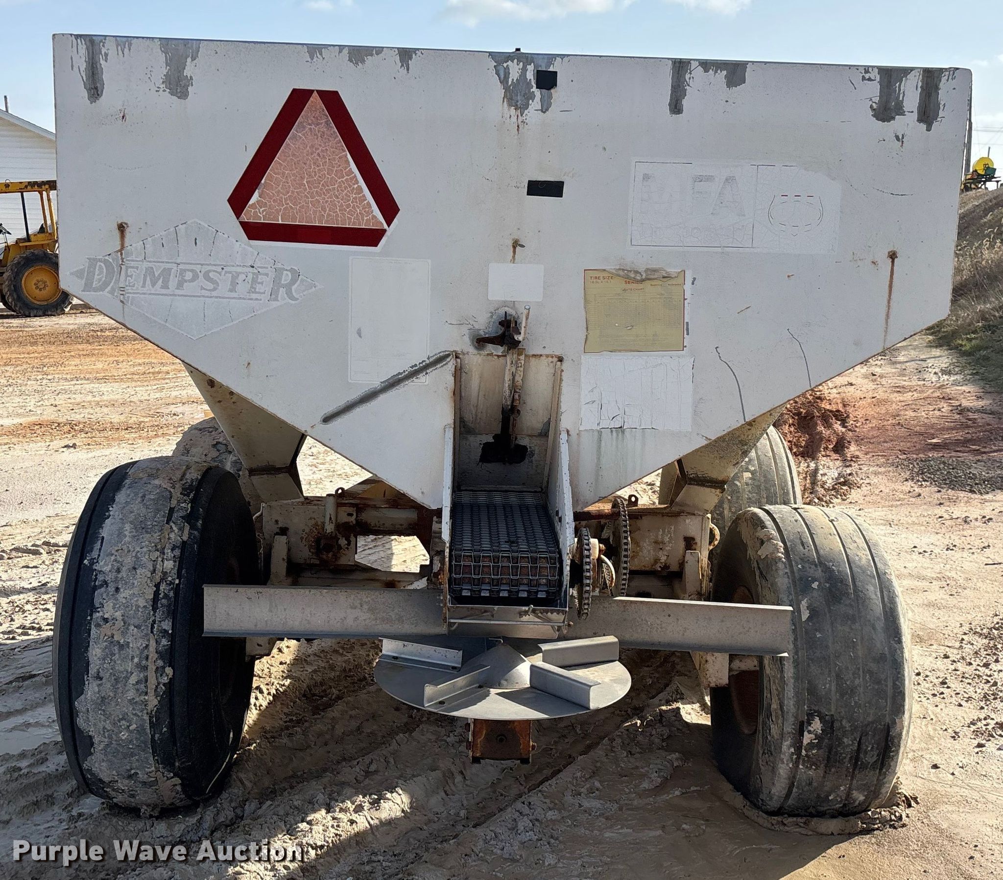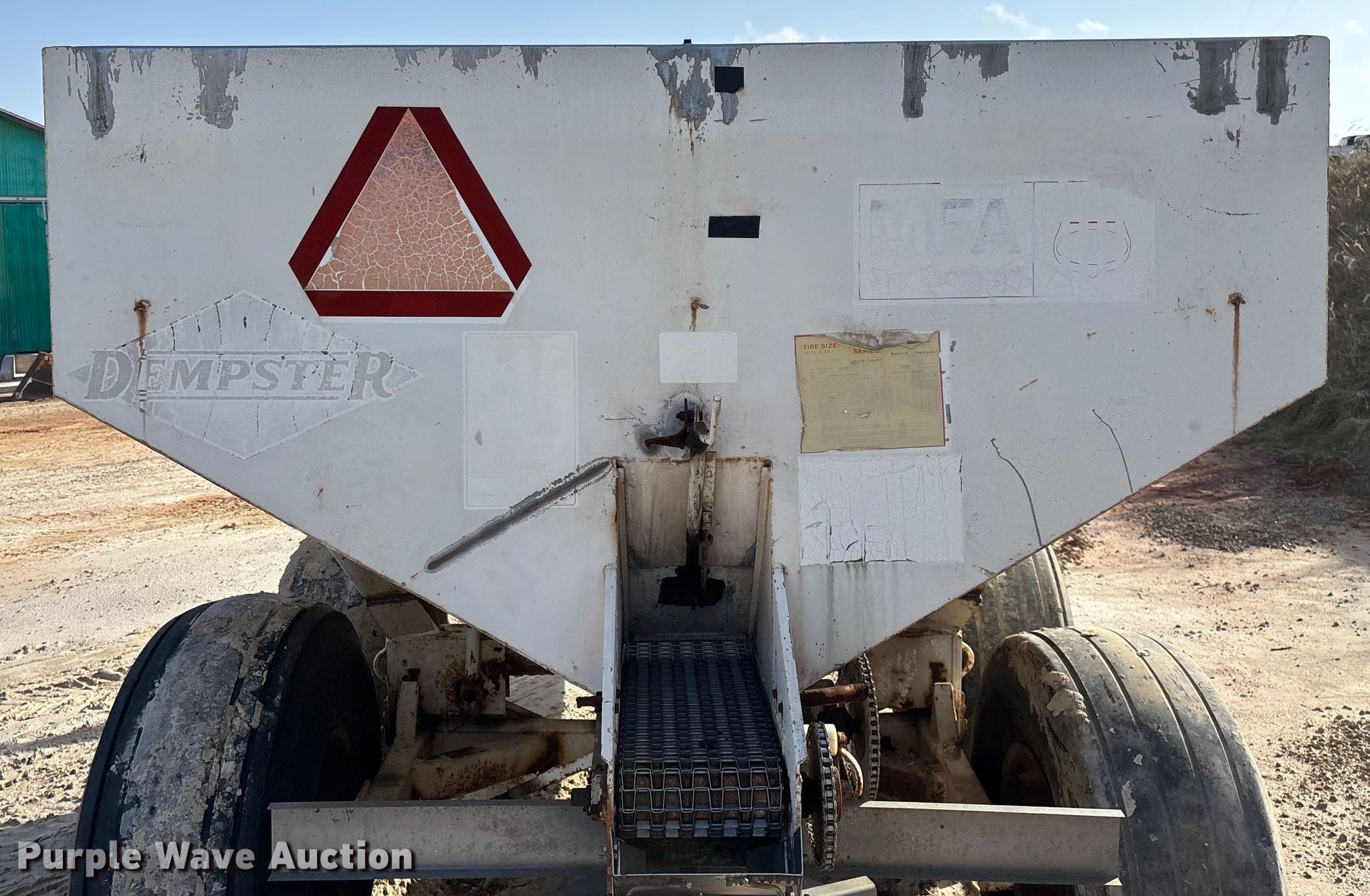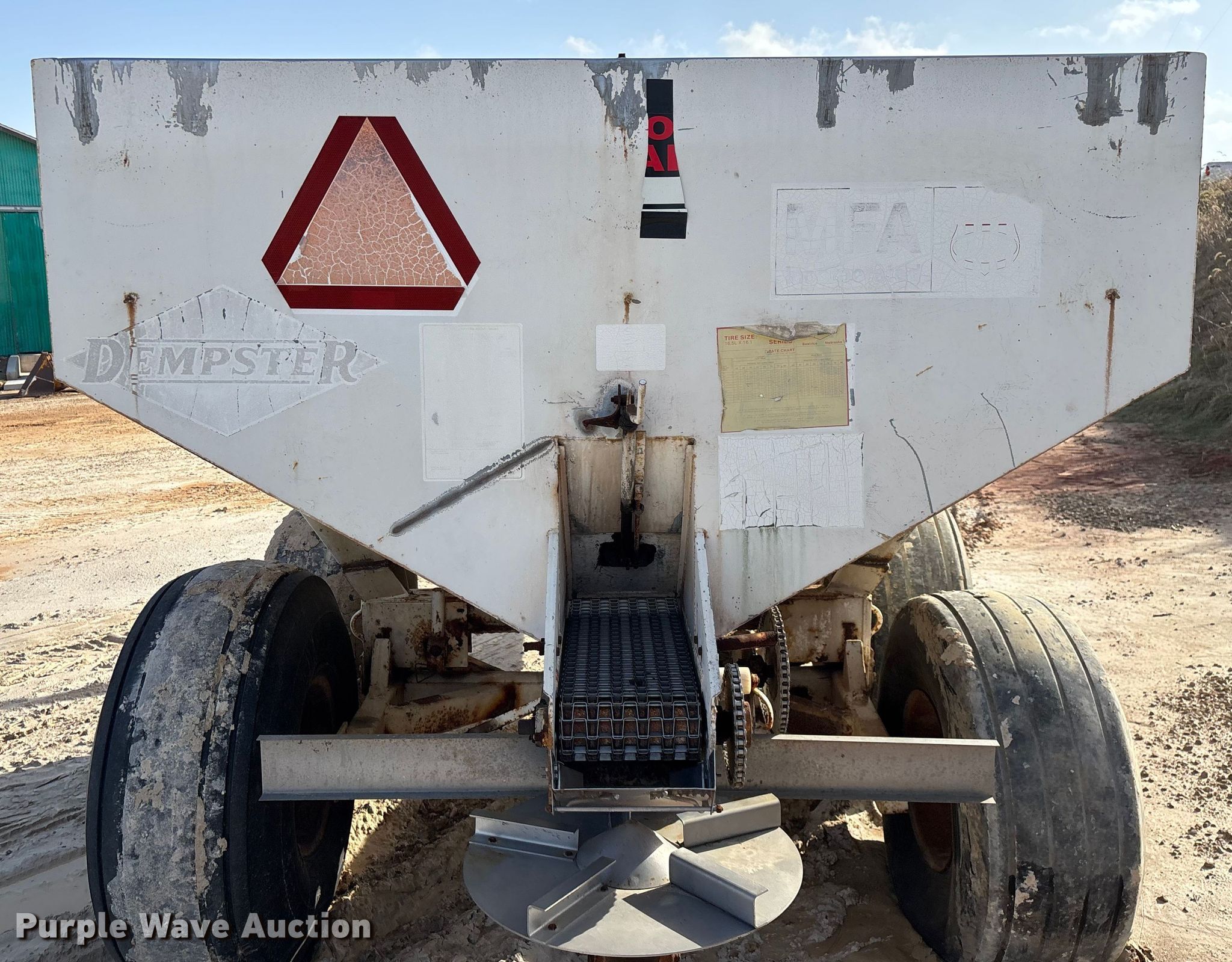 Dempster Clipper - 200S spreader. Features. PTO: 540, Dry fertilizer spreader Stainless steel, Roll tarp, Ground driven, Conveyor/chain Width: 10".. Tires Size: 16.5L-16.1SL. Notes Decals will be removed prior to auction, Frame rust damage. MFA Farmers Produce Exchange. Lebanon, MO 65536