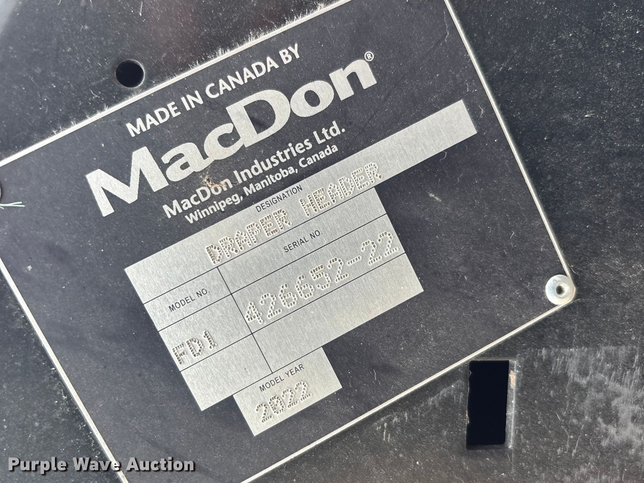 Purple Wave is selling a used Platform or Stripper Head in Illinois. This item is a 2022 MacDon FD140 flex draper head with the following: Serial: 426652, Unit #: 79450845