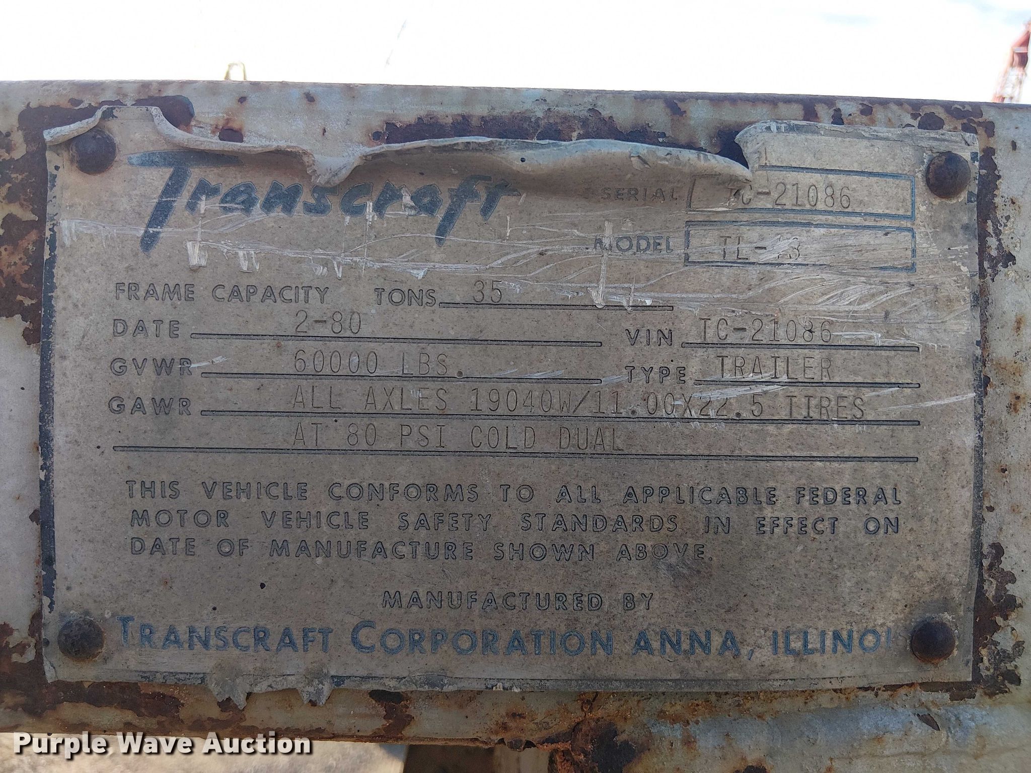 Purple Wave is selling a used Flat or Drop Deck Trailer in Texas. This item is a 1980 Transcraft TL-13 flatbed trailer with the following: VIN: TC21086, Unit #: 13085