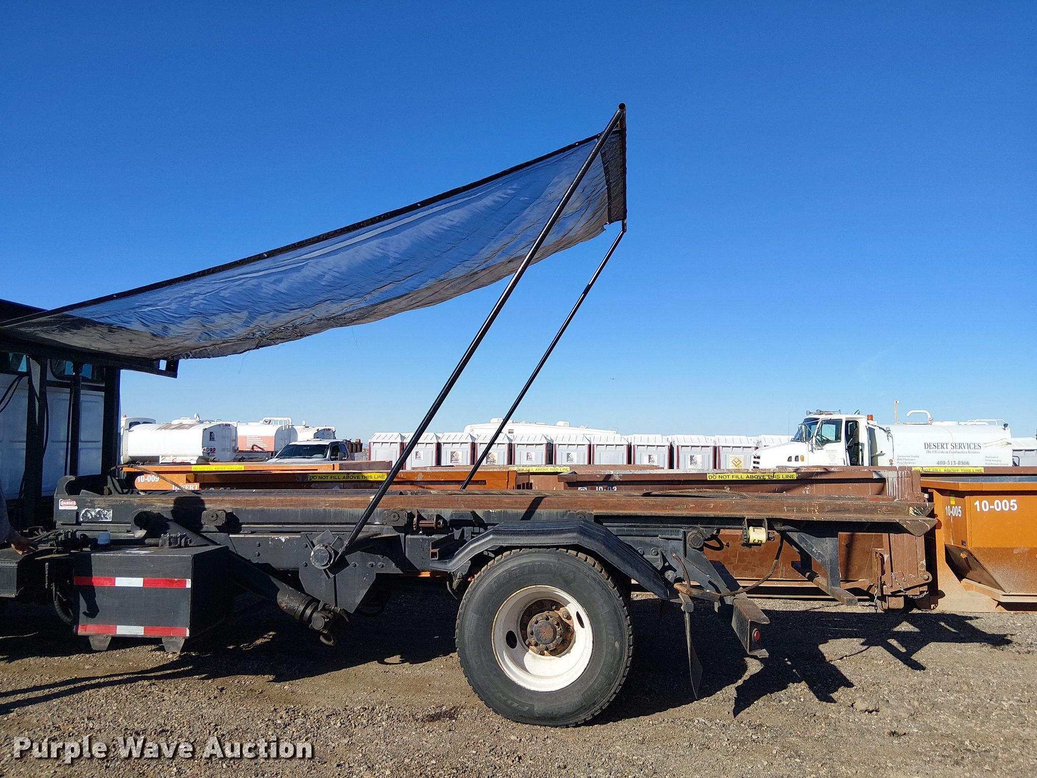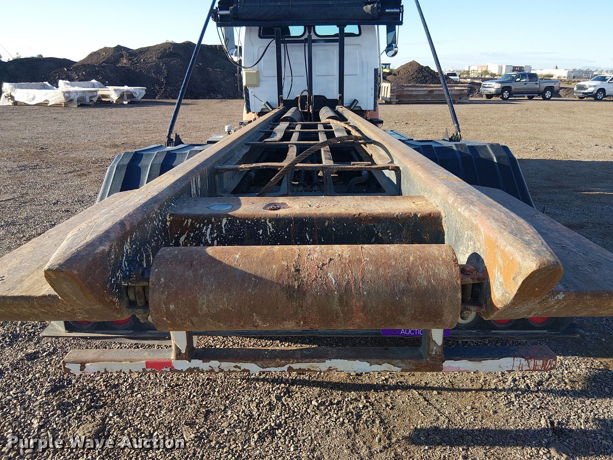 2000 Sterling L7500 roll-off container truck. Miles: 383,319 on odometer, VIN: 2FZHAJAA7YAG99999, Unit #: 32. Engine Caterpillar, Serial: BYL50626, Fuel type: Diesel. Transmission Automatic. Chassis Axles: Single, Suspension: Spring, Brakes: Air, PTO, GVWR: 33,000 lbs. Interior AC, Heat, Cruise control. Features Bed Roll-off bed, Length: 245", Width: 36", Ram: Dual, Roll tarp, Winch, Rolling tailboard. Tires Size: 11R22.5. Notes Windshield chipped or cracked. Arizona title. Title distribution may be delayed up to 14 days from verification of funds. Desert Services. Mesa, AZ 85201