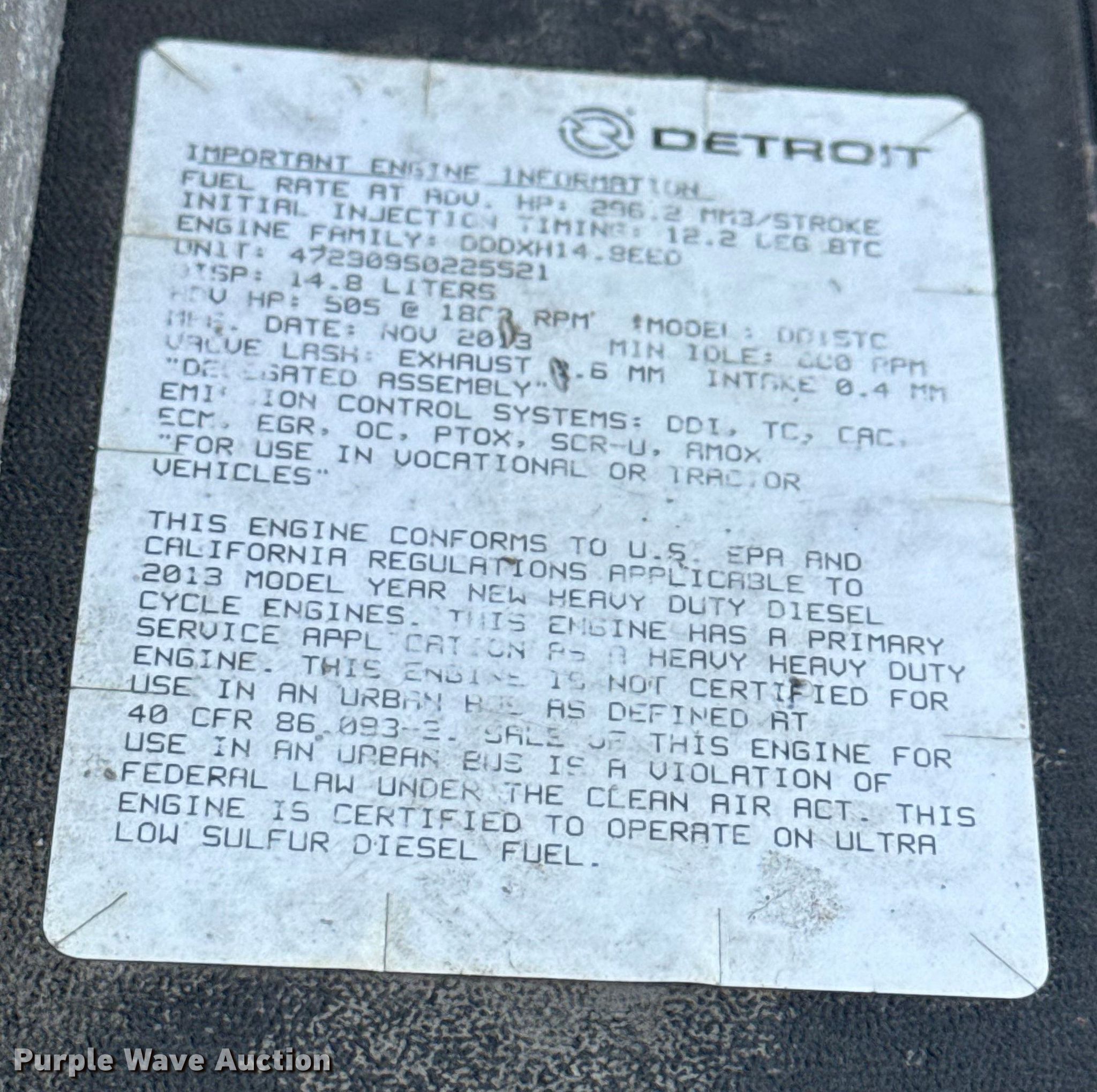 2014 Freightliner Coronado semi truck. Miles: 801,114 on odometer, VIN: 3AKJGND66EDGA2077. Engine Detroit Diesel DD15, Displacement: 14.8L, Cylinders: 6, Fuel type: Diesel, Engine brake. Transmission Eaton Fuller, Manual, Speed: 13. Chassis Axles: Tandem, Differential lock: Inter-axle, Suspension: Air, Brakes: Air, GVWR: 57,220 lbs FAWR: 13,220 lbs, IAWR: 22,000 lbs, RAWR: 22,000 lbs. Interior AC, Heat, Heated mirrors, Power windows, Cruise control, Air ride cab. Features Deck plate: Aluminum, Fifth wheel type: Fixed, Fuel tank: Dual, Fruitland vacuum pump. Tires Size: 11R24.5. Notes Windshield chipped or cracked. Oklahoma title. Seller is an Oklahoma licensed motor vehicle dealer. Buyers may be required to provide identification to the licensed dealer to comply with state laws. Title will be assigned and distributed by the dealer. Please contact the seller for distribution questions. Title distribution may be delayed up to 30 days from verification of funds. Collinsville, OK 74021