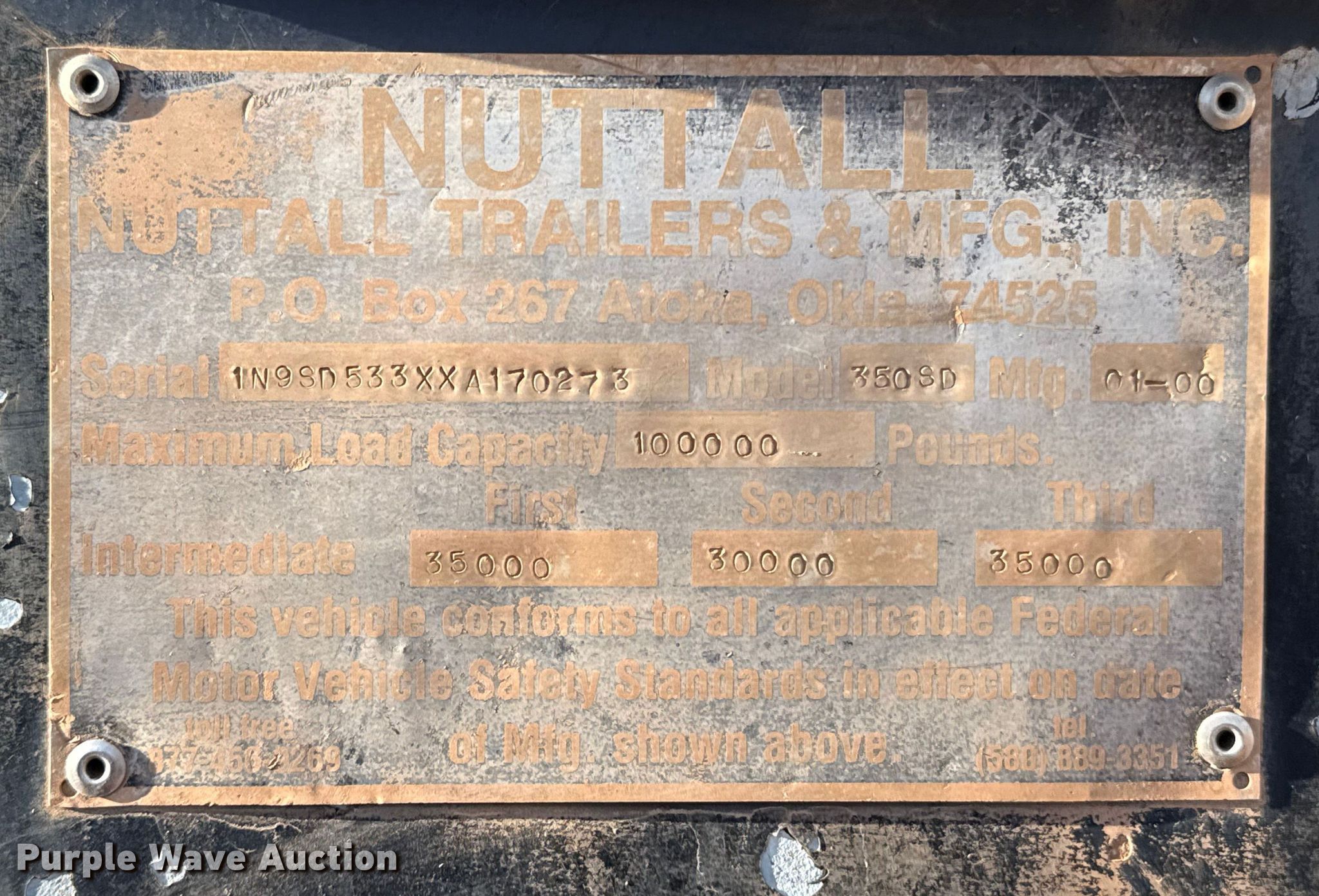2000 Nuttall 350SD drop deck equipment trailer. VIN: 1N9SD533XXA170273. Dimensions Overall Length: 52' 5", Width: 102", Deck Length: 35' 6", Width: 94", Top deck length: 11', Deck height: 1' 7", Tail length: 6', Ramps: Manual Length: 6'. Features Deck type: Steel, Wood. Chassis Landing gear: Dual, Suspension: Spring, Brakes: Air, Axles: Triple, Tax axle, GVWR: 100,000 lbs. Tires Aluminum wheels, Size: 255/70R22.5. Oklahoma title. Title distribution may be delayed up to 14 days from verification of funds. Carrier Ditching & Excavating. Stillwater, OK 74074