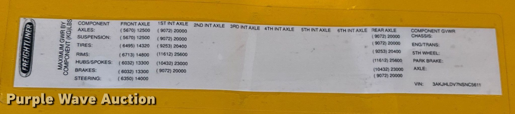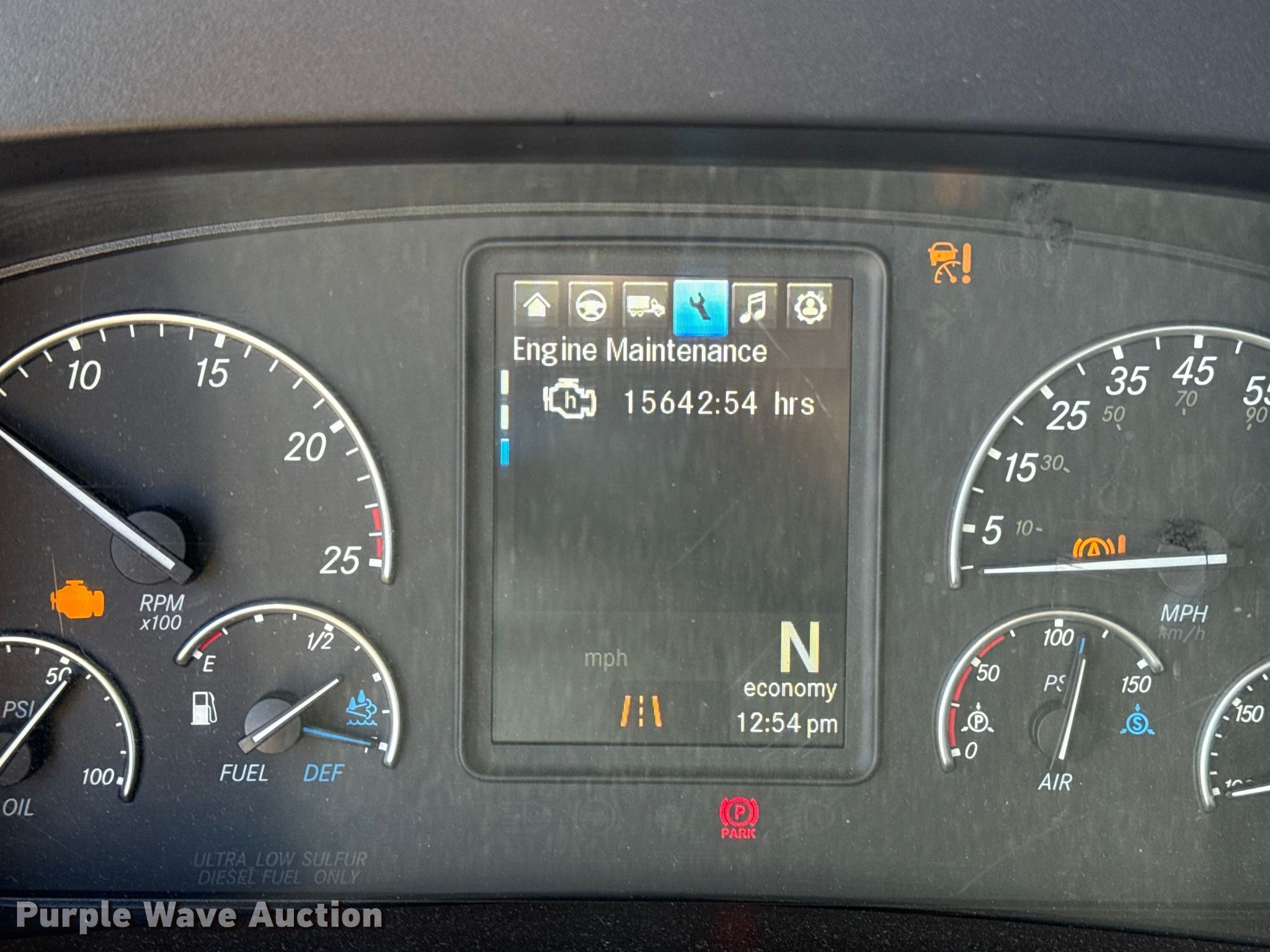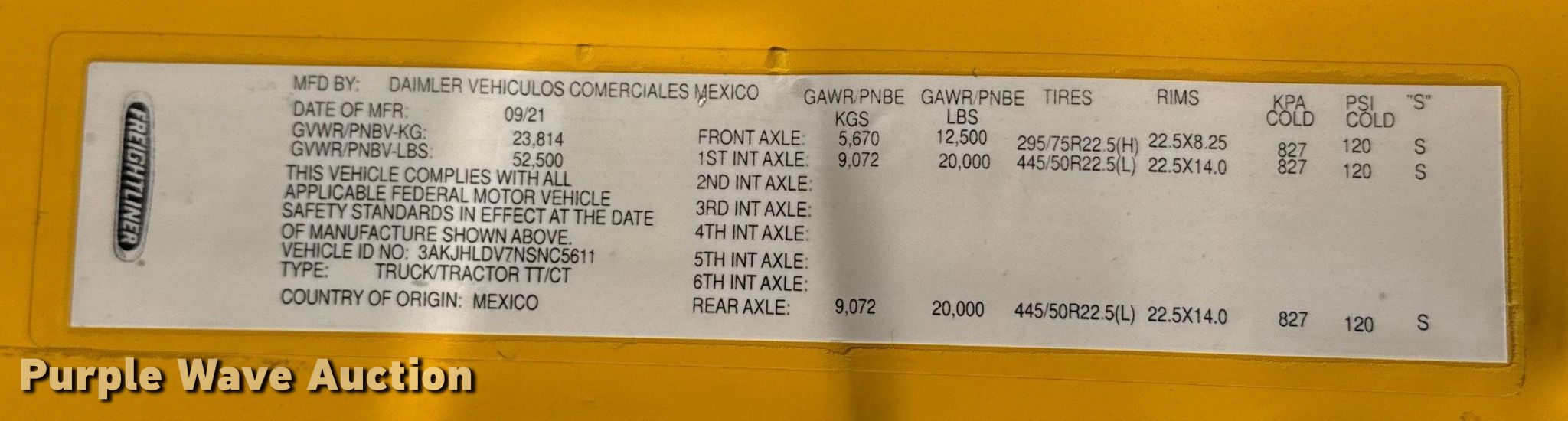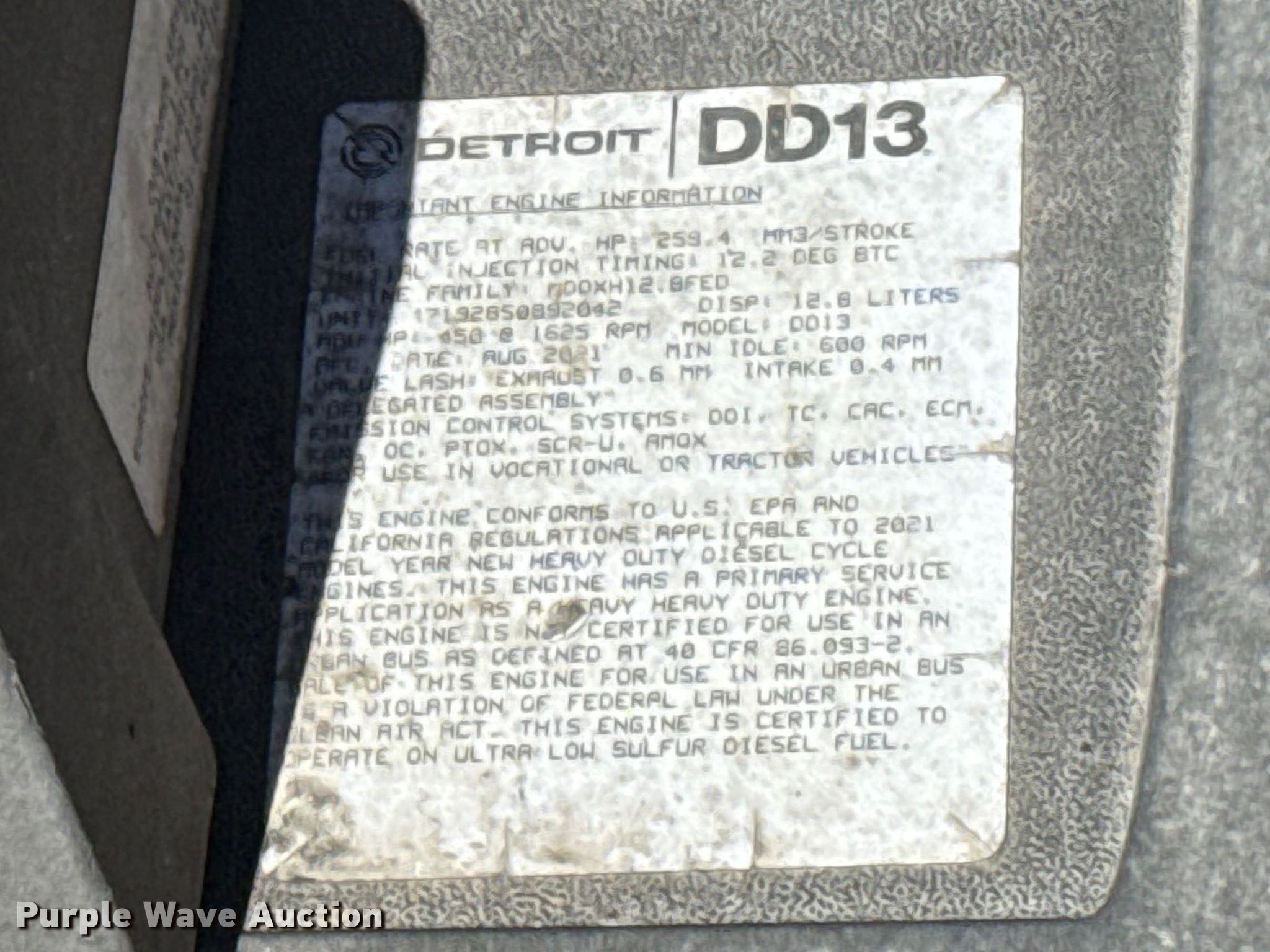 2022 Freightliner Cascadia 126 semi truck. Miles: 622,858 on odometer, Hours: 15,643 on meter, VIN: 3AKJHLDV7NSNC5611, Unit #: 22024. Engine Detroit Diesel DD13, Serial: 471928S0892042, Displacement: 12.8L, Cylinders: 6, Fuel type: Diesel, HP: 450, Engine brake. Transmission Automated manual. Chassis Axles: Tandem, Differential lock: Inter-axle, Suspension: Air Dump valves, Brakes: Air, GVWR: 52,500 lbs FAWR: 12,500 lbs, IAWR: 20,000 lbs, RAWR: 20,000 lbs, Wheelbase: 180". Interior AC, Heat, Heated mirrors, Power windows, Power locks, Cruise control, Air ride cab. Features Deck plate: Aluminum, Fifth wheel type: Fixed, Fuel tank: Single. Tires Front: 295/75R22.5, Rear: 445/50R22.5. Notes Dash warning indicator: Check engine, Adaptive cruise control unavailable, Active brake assist, Jump start required during on-site data collection. Oklahoma title. Title distribution may be delayed up to 30 days from verification of funds. Gemini Motor Transport. Oklahoma City, OK 73127