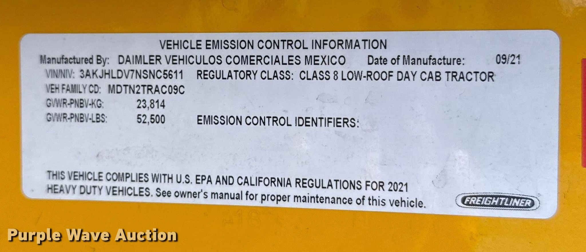 Purple Wave is selling a used Truck Tractor in Oklahoma. This item is a 2022 Freightliner Cascadia 126 semi truck with the following: Miles: 622,858 on odometer, Hours: 15,643 on meter, VIN: 3AKJHLDV7NSNC5611, Unit #: 22024