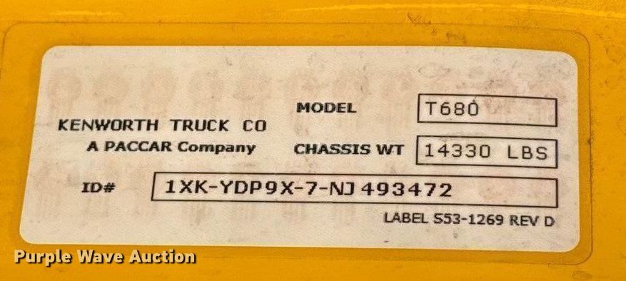 Purple Wave is selling a used Truck Tractor in Oklahoma. This item is a 2022 Kenworth T680 semi truck with the following: Miles: 399,127 on odometer, Hours: 8,146 on meter, VIN: 1XKYDP9X7NJ493472, Unit #: 22553