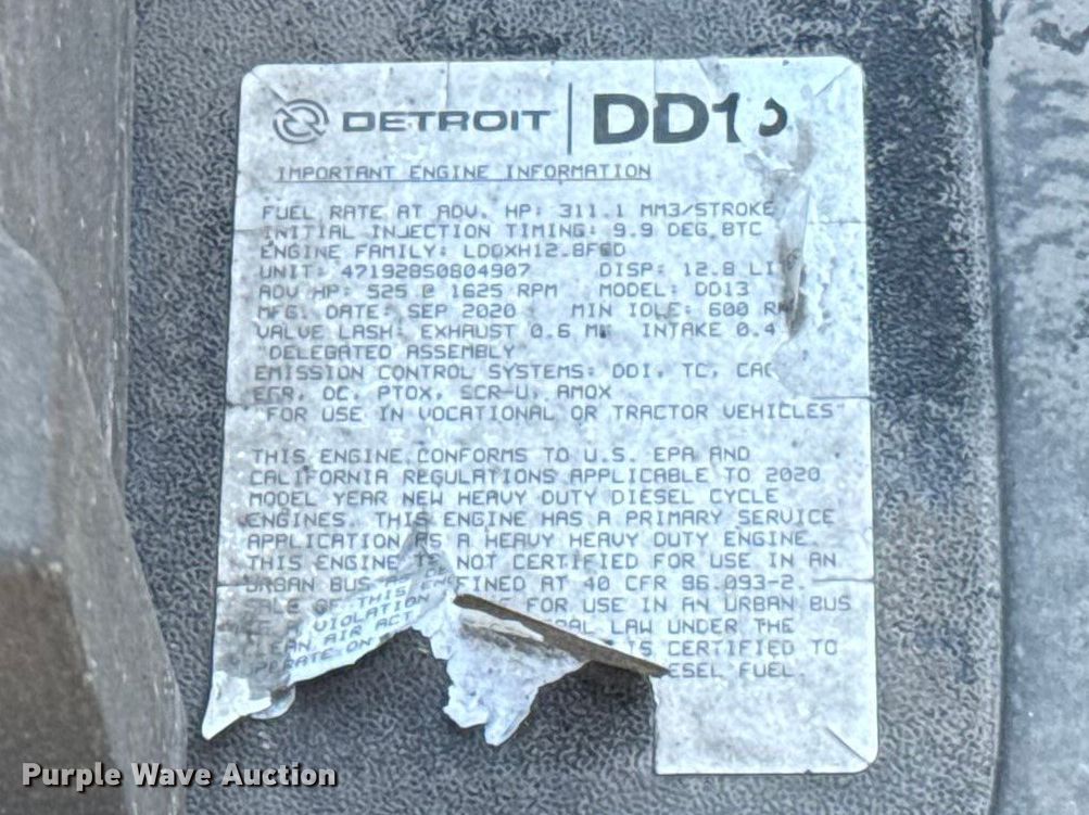 2021 Freightliner Cascadia 126 semi truck. Miles: 553,183 on odometer, Hours: 20,517 on meter, VIN: 3AKJHHDVXMSMK9875, Unit #: 21136. Engine Detroit Diesel DD13, Serial: 471928S0804907, Displacement: 12.8L, Cylinders: 6, Fuel type: Diesel, HP: 450, Engine brake. Transmission Automated manual. Chassis Axles: Tandem, Differential lock: Inter-axle, Suspension: Air Dump valves, Brakes: Air, GVWR: 52,500 lbs FAWR: 12,500 lbs, IAWR: 20,000 lbs, RAWR: 20,000 lbs, Wheelbase: 229". Interior AC, Heat, Heated mirrors, Power windows, Power locks, Cruise control, Air ride cab, Sleeper Sleeper length: 64", Beds: Single, Refrigerator, Rear climate control. Features Deck plate: Aluminum, Fifth wheel type: Fixed, Fuel tank: Dual. Tires Front: 295/75R22.5, Rear: 445/50R22.5. Oklahoma title. Title distribution may be delayed up to 30 days from verification of funds. Gemini Motor Transport. Oklahoma City, OK 73127