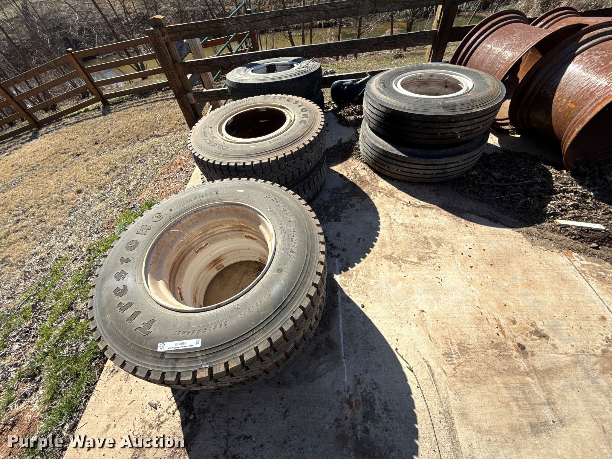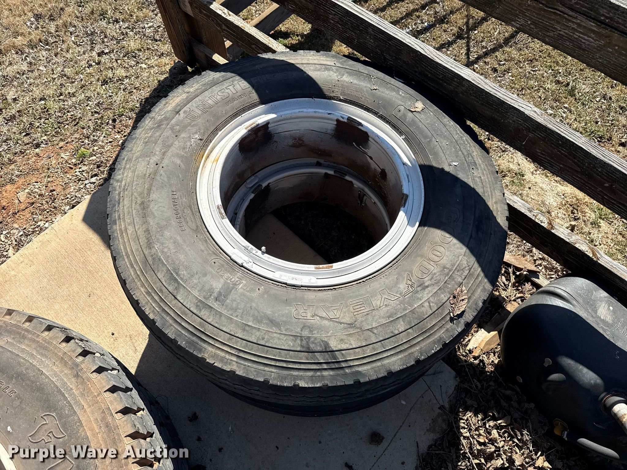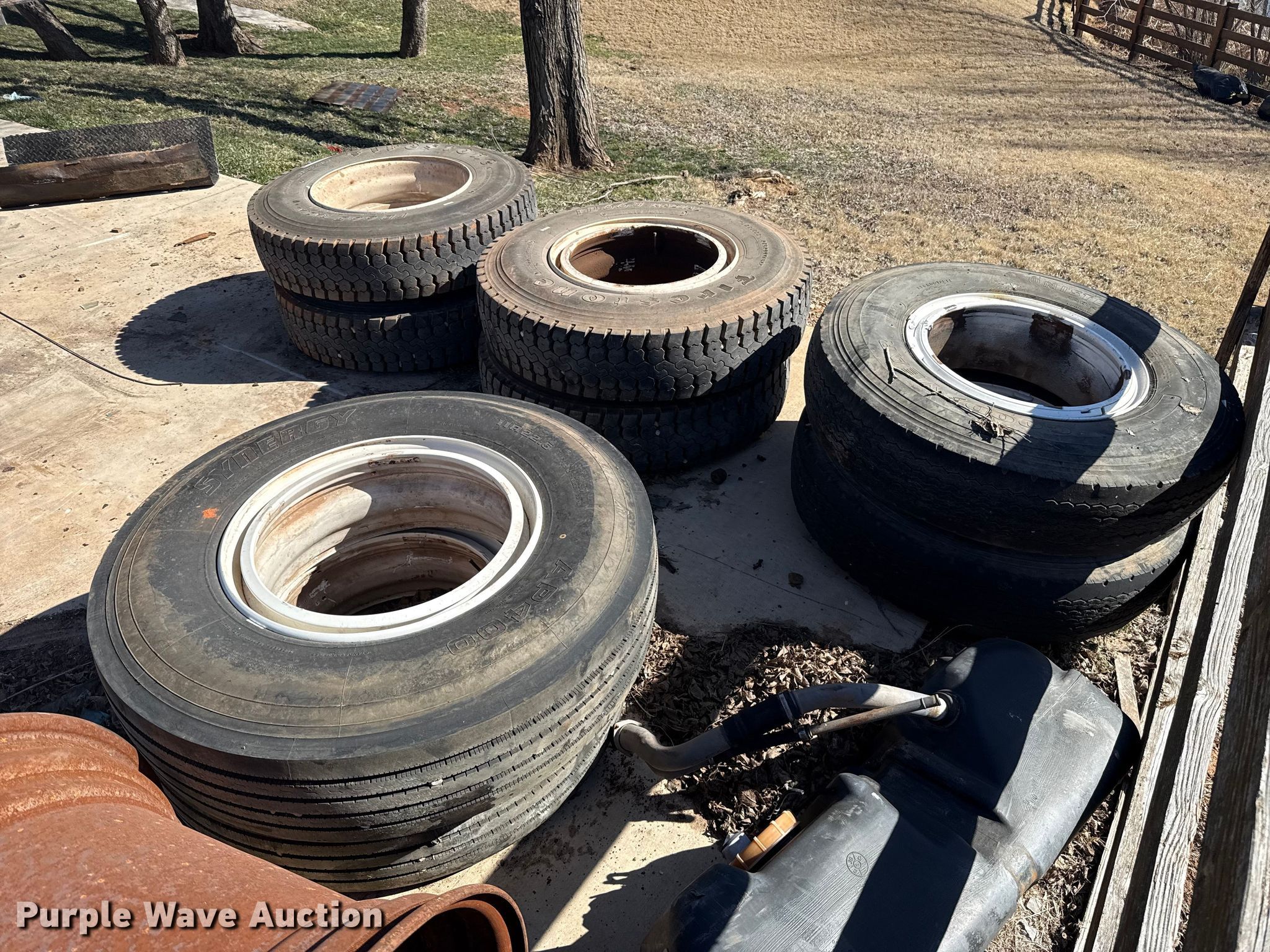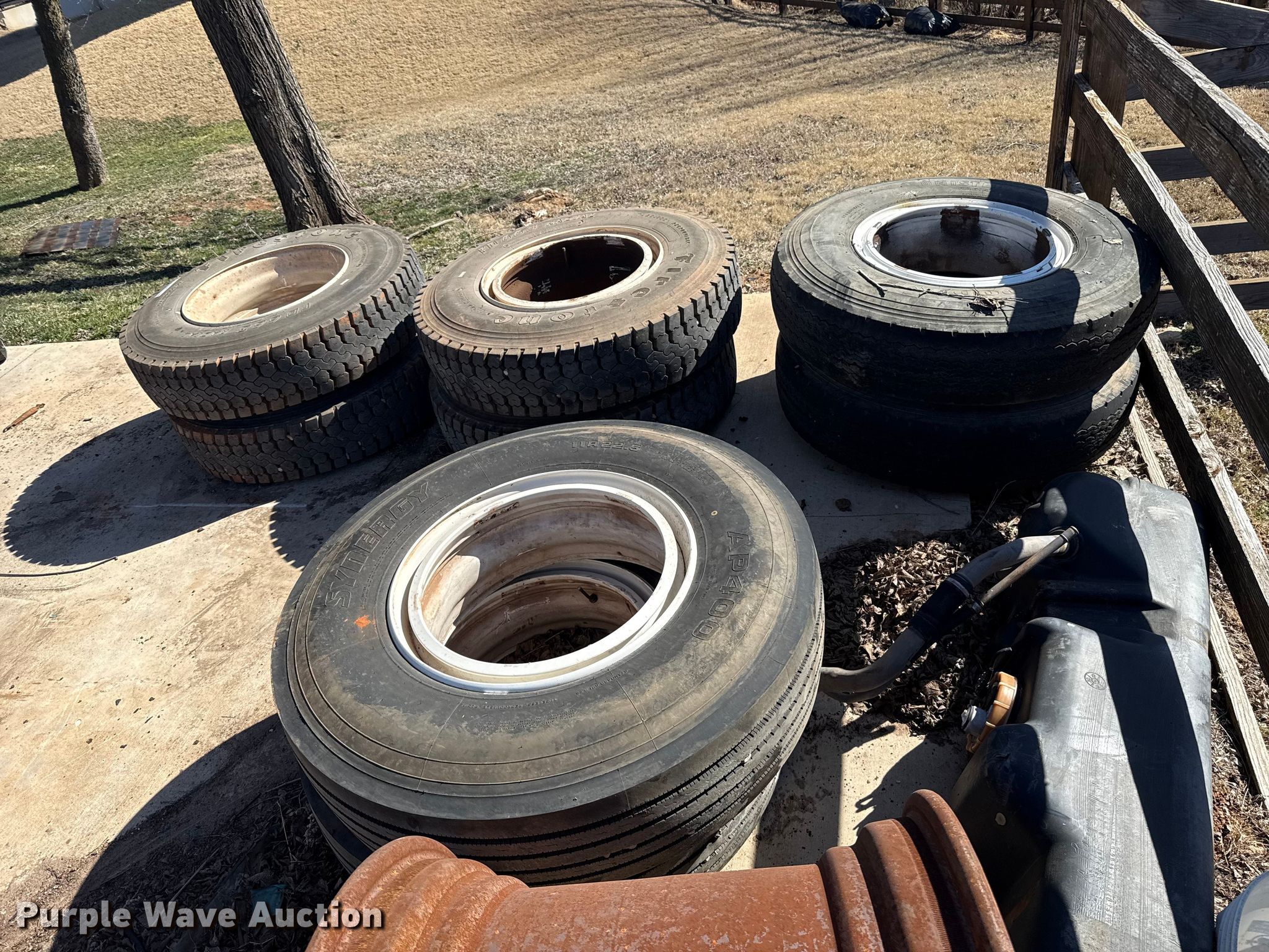 Purple Wave is selling a used Fleet Tires in Oklahoma. This item is a (8) wheels and tires with the following: (4) Firestone FD663, Size: 11R22.5, (2) Good Year Unisteel II, Size: 10.00R20, (2) Synergy AP400, Size: 11R22.5
