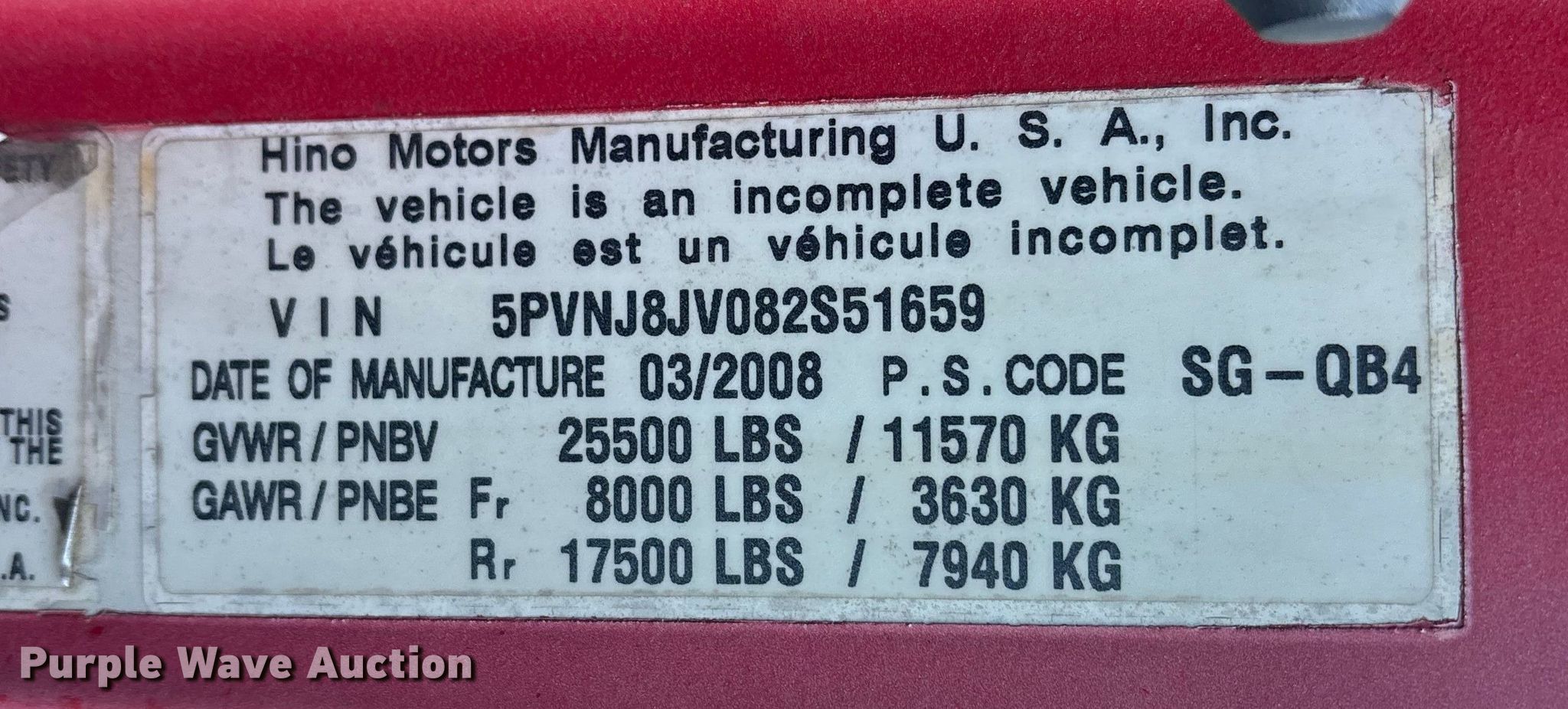 Purple Wave is selling a used Box Truck in Delaware. This item is a 2008 Hino 268 box truck with the following: Miles: 287,498 on odometer, VIN: 5PVNJ8JV082S51659