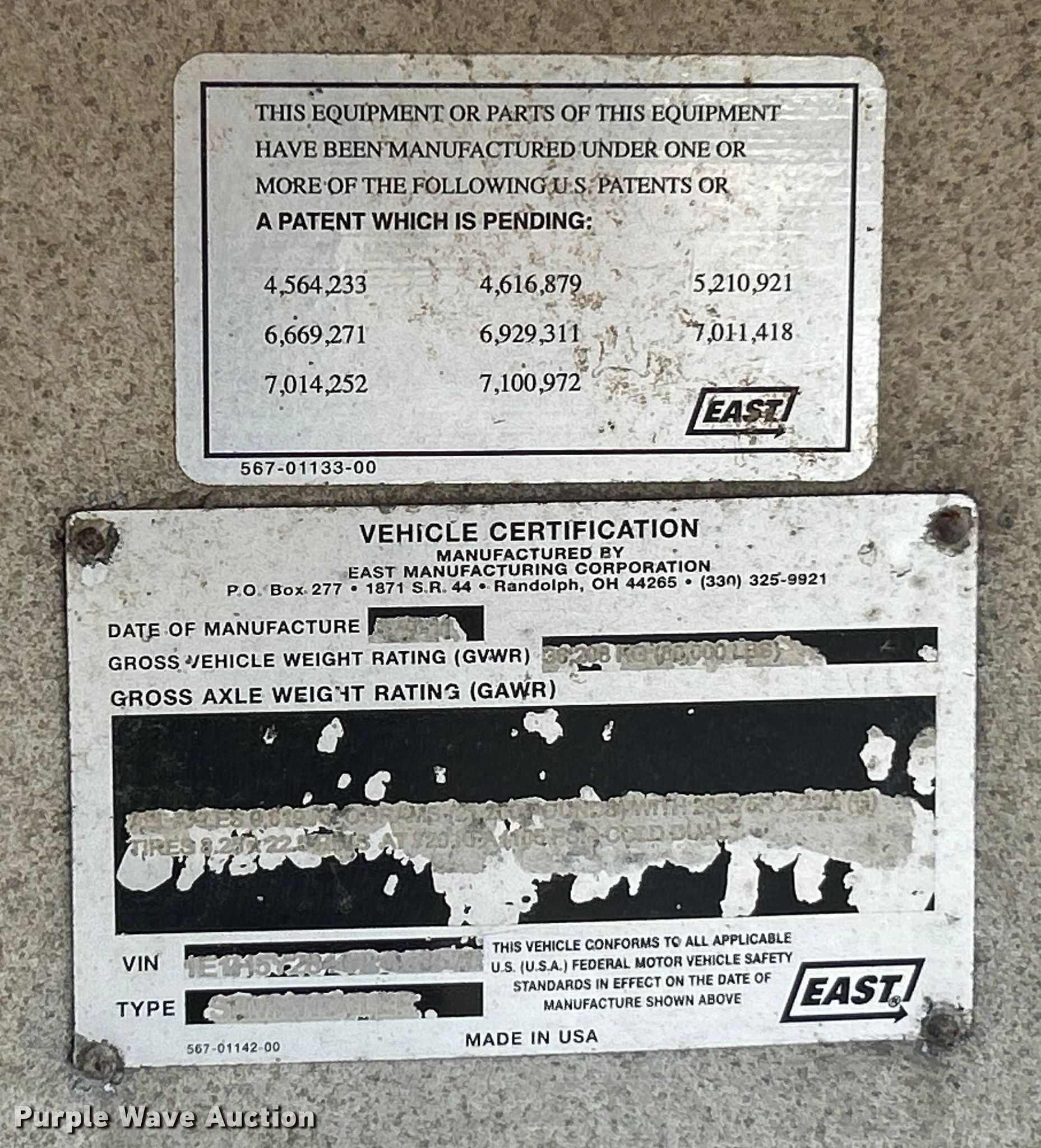 2012 East flatbed trailer. VIN: 1E1H5Y284CRG46525. Dimensions Overall Length: 48', Width: 102", Deck Length: 48', Width: 97". Features Deck type: Aluminum. Chassis Landing gear: Dual, Suspension: Air, Brakes: Air, Axles: Spread, GVWR: 80,000 lbs. Tires Aluminum wheels, Size: 295/75R22.5. Missouri title. Title distribution may be delayed up to 14 days from verification of funds. Bourbon, MO 65441