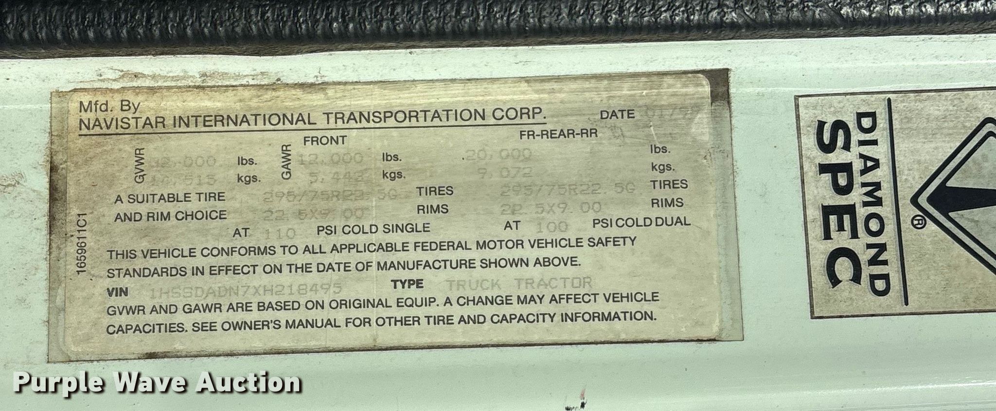 Purple Wave is selling a used Truck Tractor in Oklahoma. This item is a 1999 International 4900 semi truck with the following: Miles: 106,953 on odometer, Hours: 6,809 on meter, VIN: 1HSSDADN7XH218495