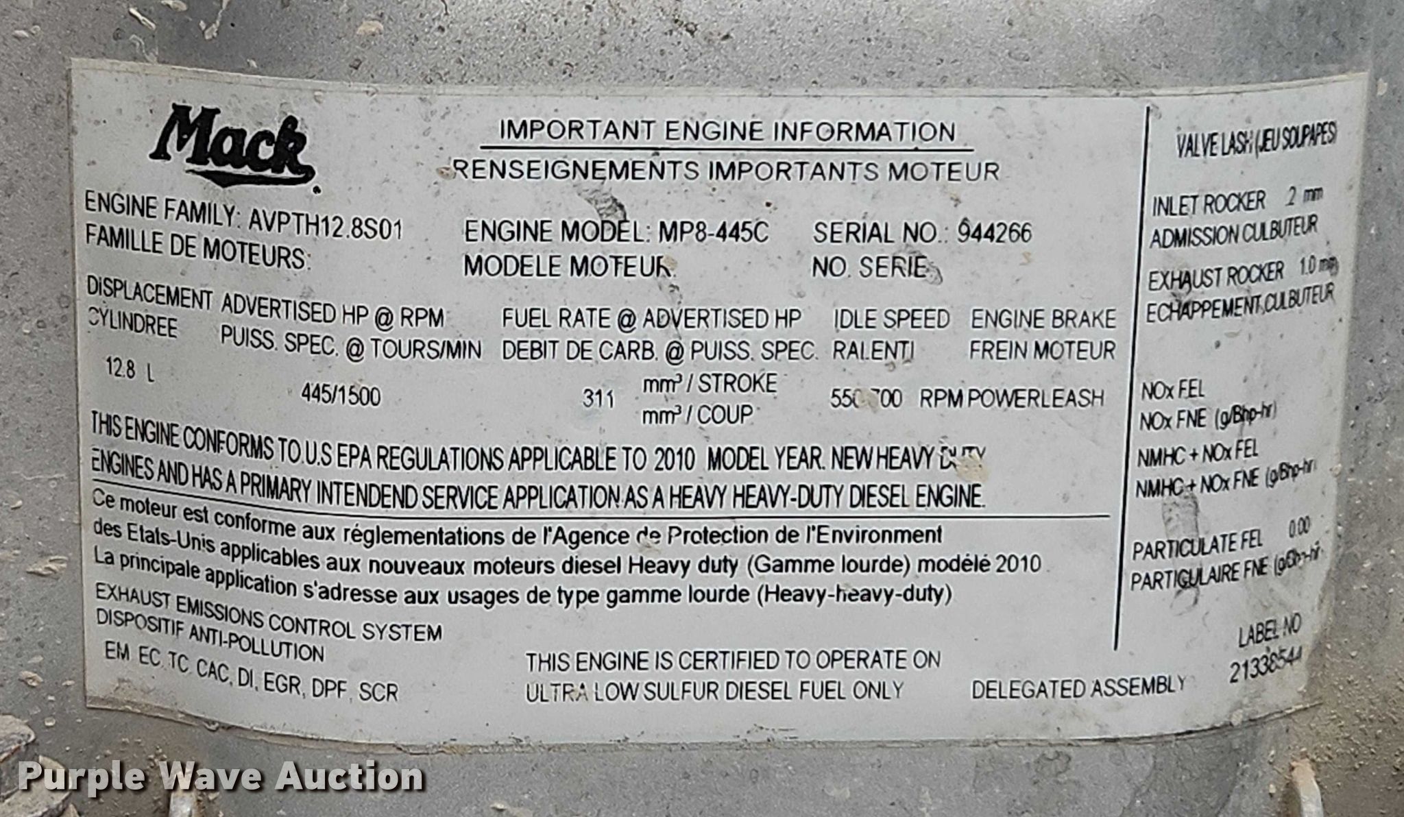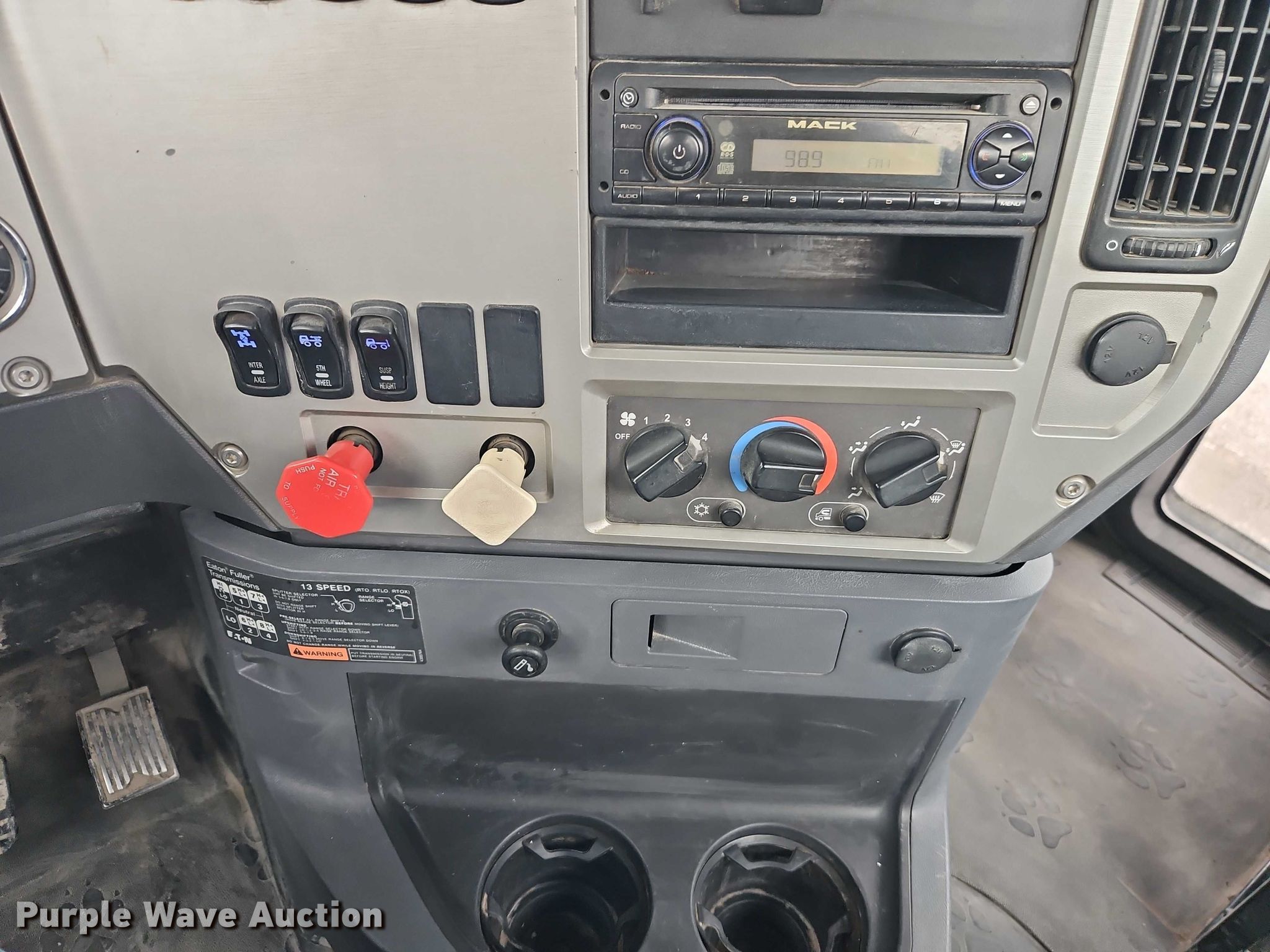 2011 Mack CHU613 semi truck. Miles: 317,541 on odometer, VIN: 1M1AN13Y9BM007473. Engine Mack MP8-445C, Displacement: 12.7L, Cylinders: 6, Fuel type: Diesel, HP: 435. Transmission Eaton Fuller, Speed: 13. Chassis Axles: Tandem, Differential lock: Inter-axle, Suspension: Air Dump valves, Brakes: Air, PTO, Wet kit, GVWR: 54,320 lbs FAWR: 14,320 lbs, IAWR: 20,000 lbs, RAWR: 20,000 lbs. Interior AC, Heat, Heated mirrors, Power windows, Power locks, Cruise control, Air ride cab. Features Deck plate: Aluminum, Fifth wheel type: Air operated, Sliding, Fuel tank: Single. Tires Front: 11R24.5, Rear: 11R22.5. Notes Dash warning indicator: Check engine, Windshield chipped or cracked. Missouri title. Title distribution may be delayed up to 14 days from verification of funds. Butler, MO 64730