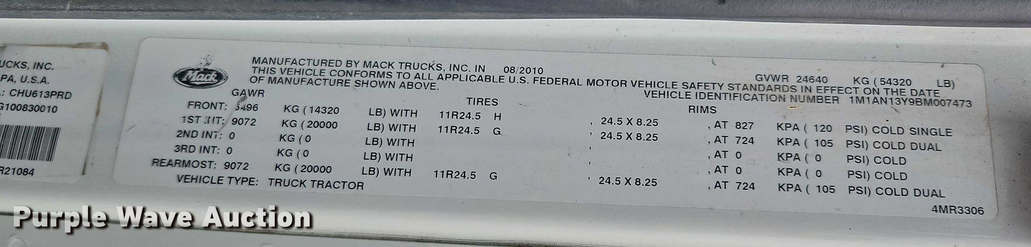 Purple Wave is selling a used Truck Tractor in Missouri. This item is a 2011 Mack CHU613 semi truck with the following: Miles: 317,541 on odometer, VIN: 1M1AN13Y9BM007473