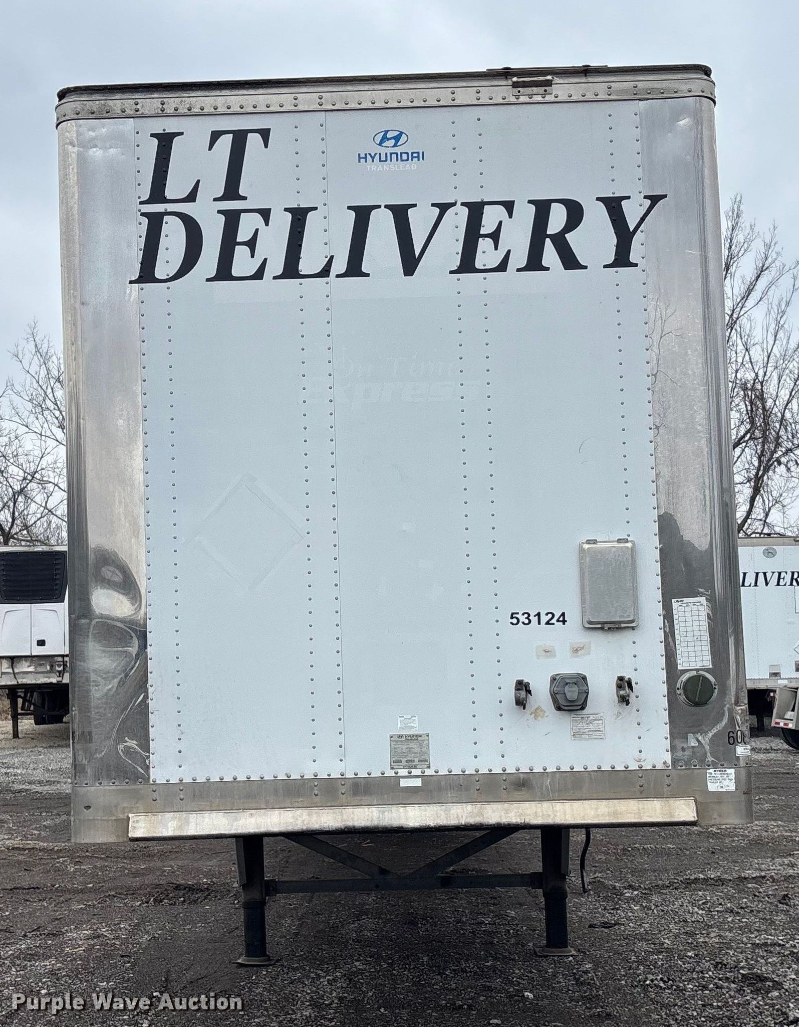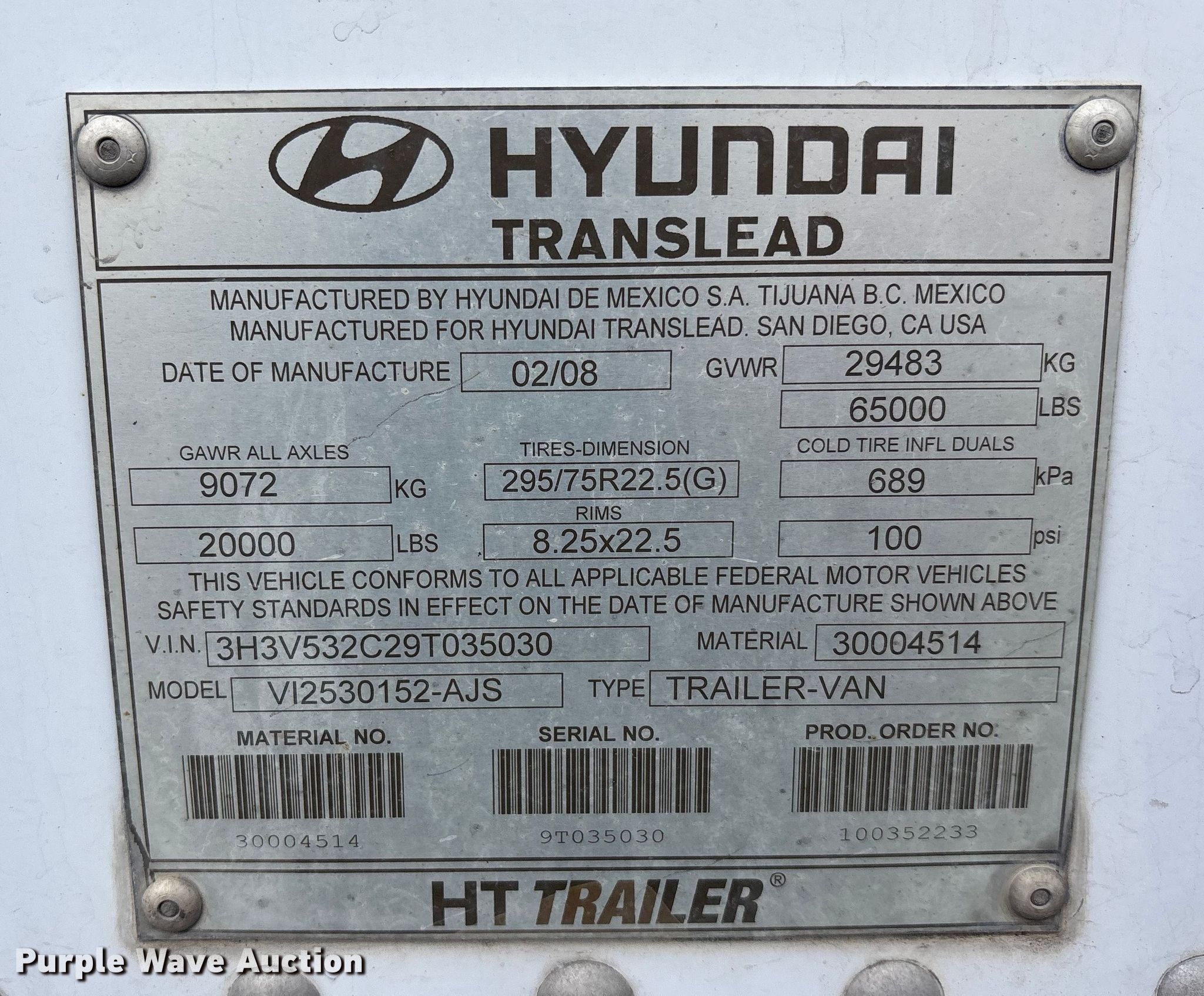 2009 Hyundai Translead VI2530152-AJS dry van trailer. VIN: 3H3V532C29T035030. Dimensions Overall Length: 53', Width: 104", Body Length: 52' 6", Width: 100". Features Deck type: Wood, E-track rail system. Chassis Landing gear: Dual, Suspension: Air, Brakes: Air, Axles: Tandem, GVWR: 65,000 lbs, GAWR: 20,000 lbs. Tires Steel wheels, Size: 295/75R22.5. Missouri title. Title distribution may be delayed up to 14 days from verification of funds. LT Delivery, Inc.. Northmoor, MO 64151