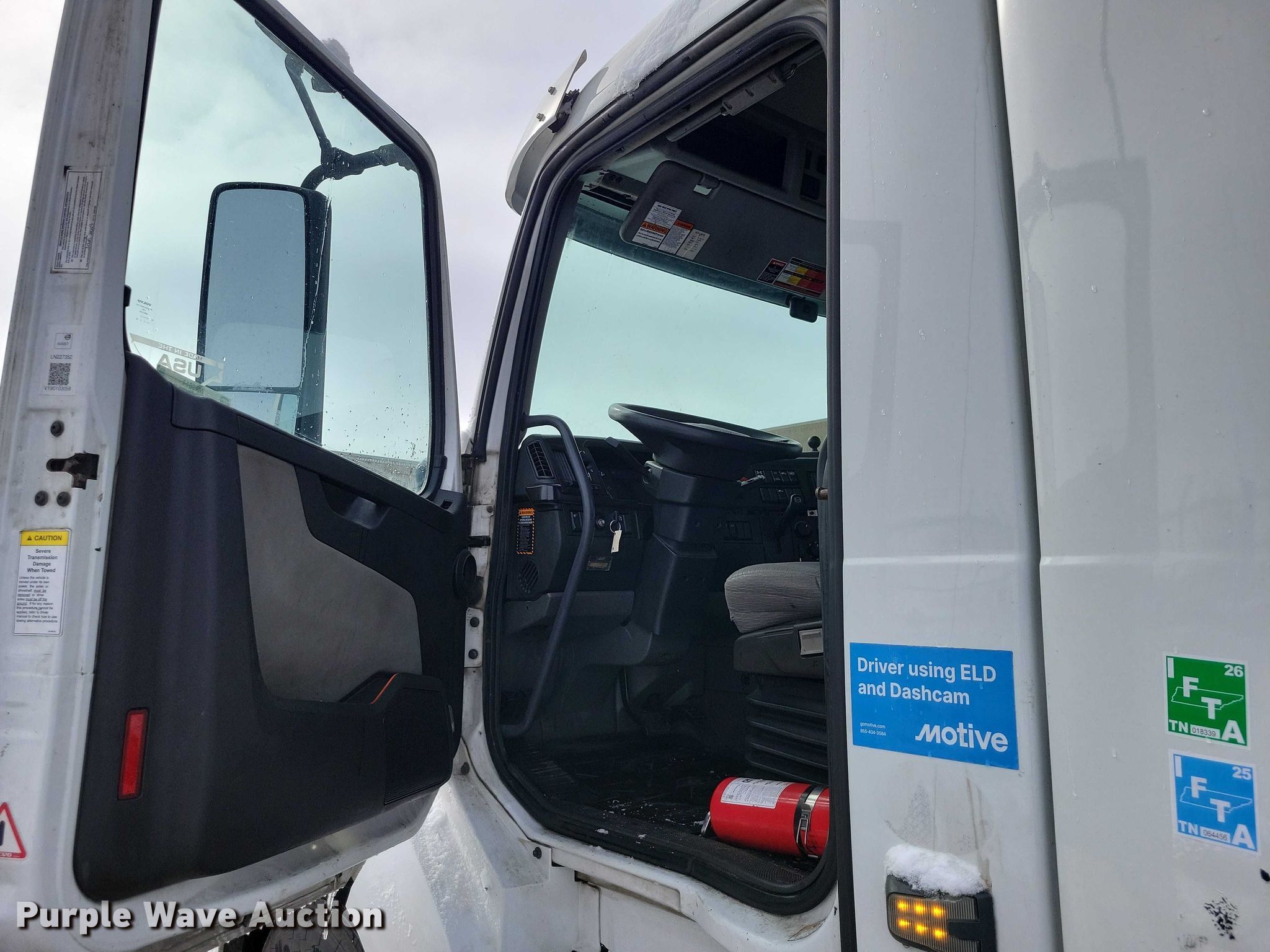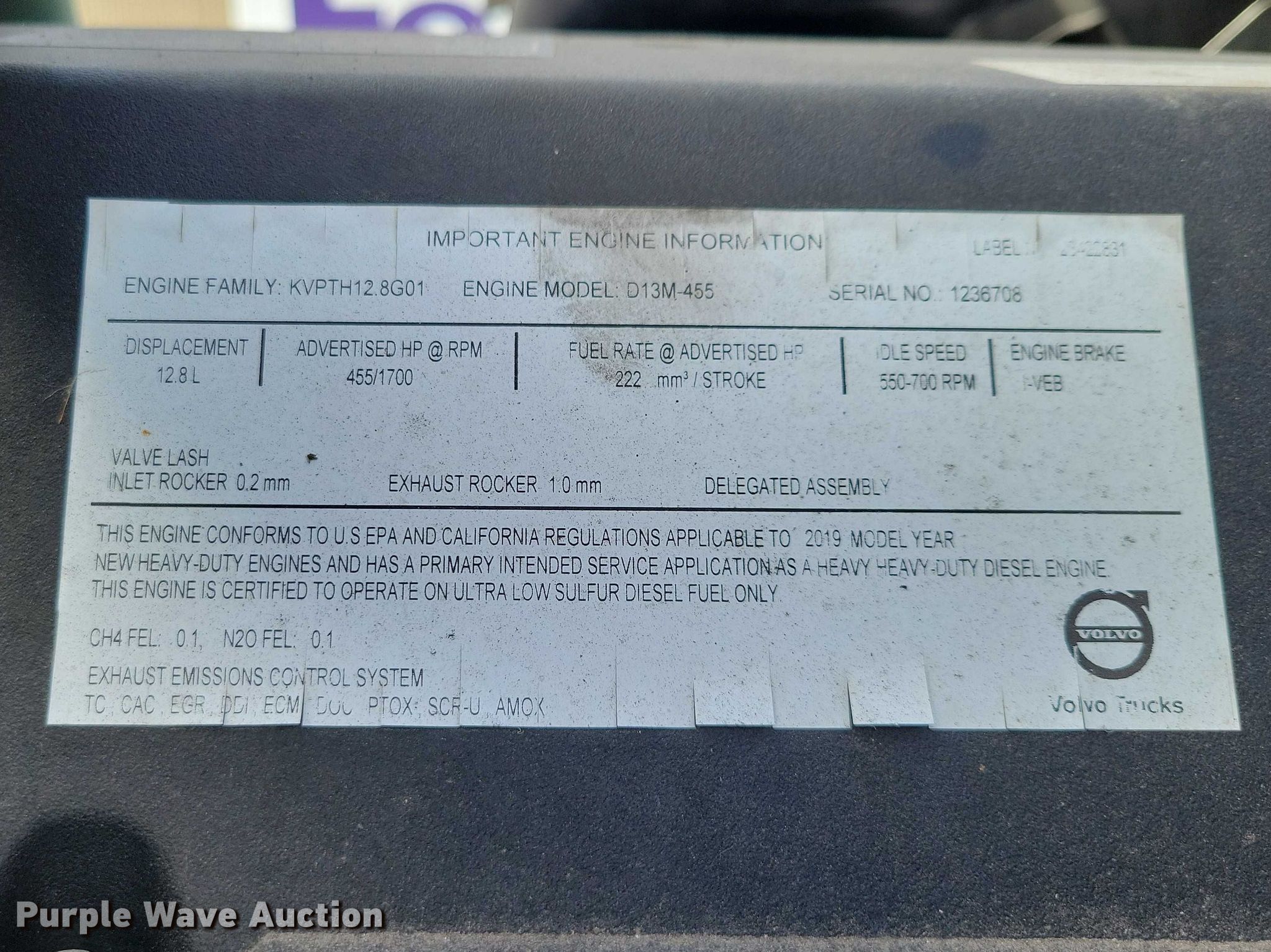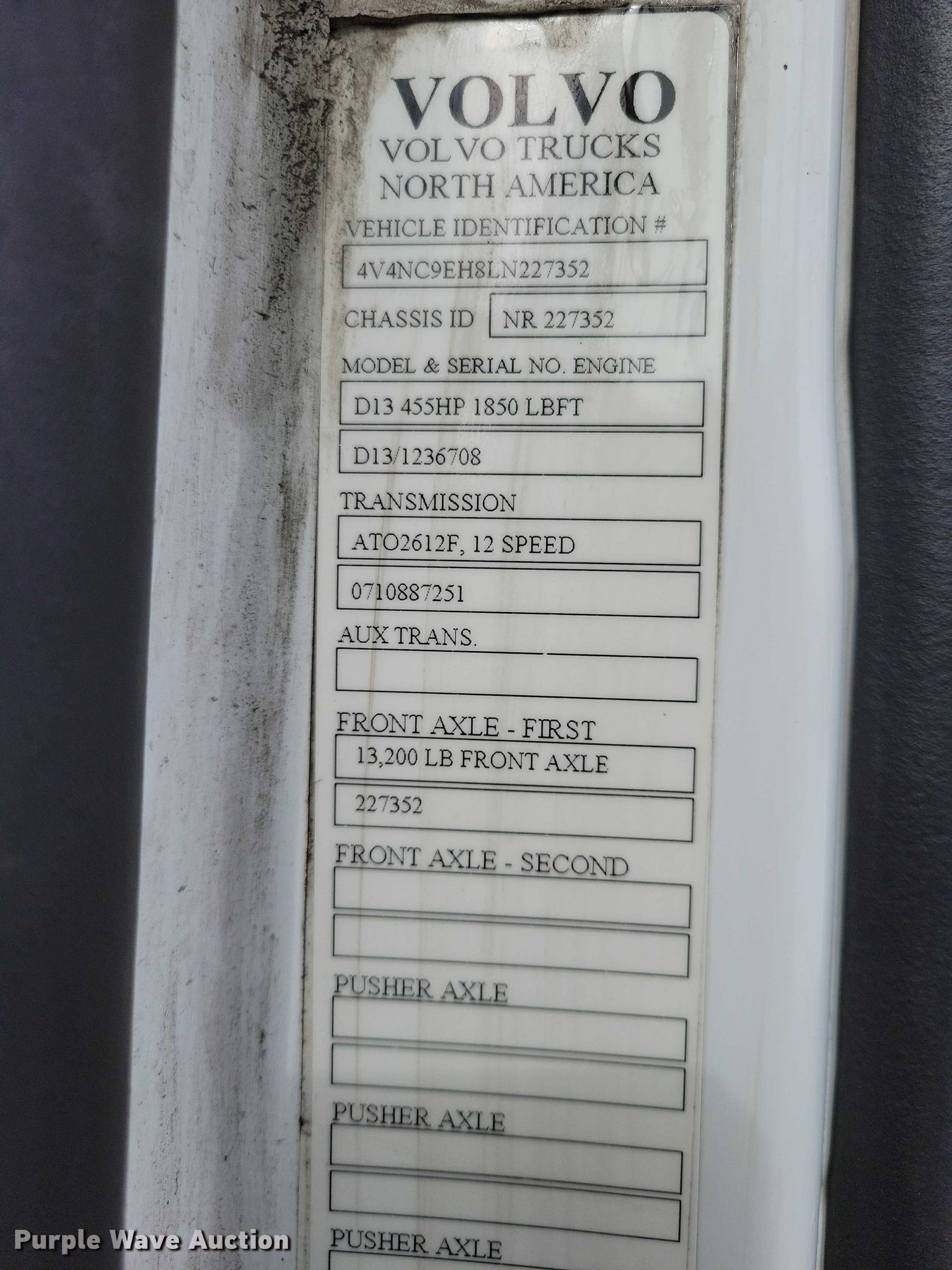 2020 Volvo VNL semi truck. Miles: 568,170 on odometer, Hours: 5,057 on meter, VIN: 4V4NC9EH8LN227352. Engine Volvo D13, Serial: 1236708, Displacement: 12.8L, Cylinders: 6, Fuel type: Diesel, HP: 455, Engine brake. Transmission Automated manual. Chassis Axles: Tandem, Differential lock: Inter-axle, Suspension: Air Dump valves, Brakes: Air, GVWR: 51,200 lbs FAWR: 13,200 lbs, IAWR: 19,000 lbs, RAWR: 19,000 lbs. Interior AC, Heat, Heated mirrors, Power windows, Power locks, Cruise control, Air ride cab. Features Deck plate: Aluminum, Fifth wheel type: Air operated, Sliding, Fuel tank: Dual. Tires Size: same. Notes Dash warning indicator: Check engine, ELD, camera, GPS, and radar detector not included. View repairs. Minnesota title. Title distribution may be delayed up to 14 days from verification of funds. KJD Inc. Mankato, MN 56001