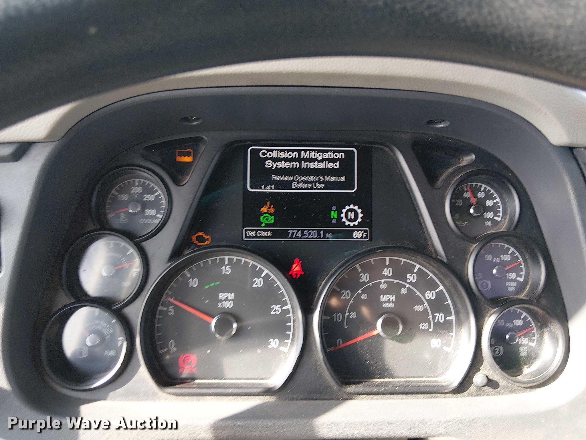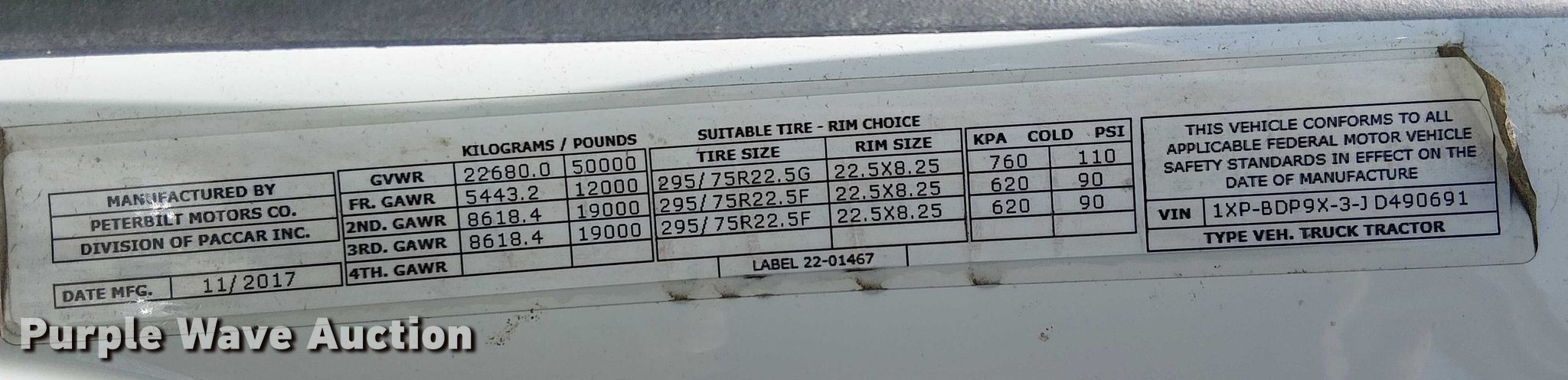 2018 Peterbilt 579 semi truck. Miles: 774,520 on odometer, VIN: 1XPBDP9X3JD490691, Unit #: 96095595. Engine Paccar MX-13, Serial: Y151924, Displacement: 12.9L, Cylinders: 6, Fuel type: Diesel, HP: 455, Engine brake. Transmission Automated manual. Chassis Axles: Tandem, Differential lock: Inter-axle, Suspension: Air Dump valves, Brakes: Air, GVWR: 50,000 lbs FAWR: 12,000 lbs, IAWR: 19,000 lbs, RAWR: 19,000 lbs. Interior AC, Heat, Power windows, Power locks, Cruise control, Air ride cab, Sleeper Sleeper length: 64", Beds: Double bunk, Refrigerator, Rear climate control. Features Fifth wheel type: Air operated, Sliding, Fuel tank: Dual. Tires Front: 295/75R22.5, Rear: 445/50R22.5. Notes Dash warning indicator: Check engine, Jump start required during on-site data collection. Repossessed item, stored at a secured facility. Please review REQUIRED REMOVAL INSTRUCTIONS. Buyer responsible for all aspects of state emissions compliance. Titles will be distributed after confirmation of payment and removal. California title. Title distribution may be delayed up to 30 days from verification of funds. Lender Owned. 2216 Coy Lane. Bakersfield, CA 93307