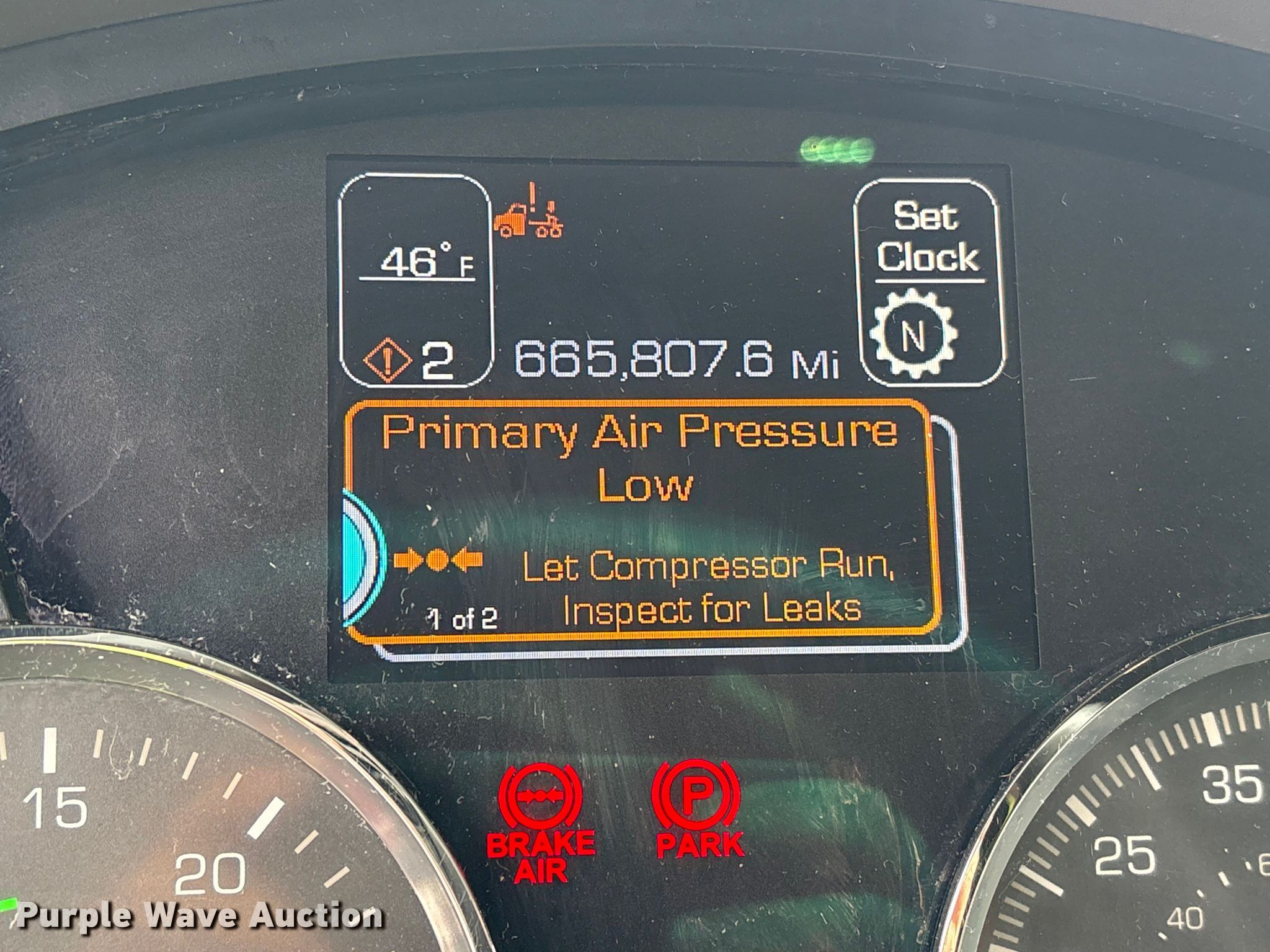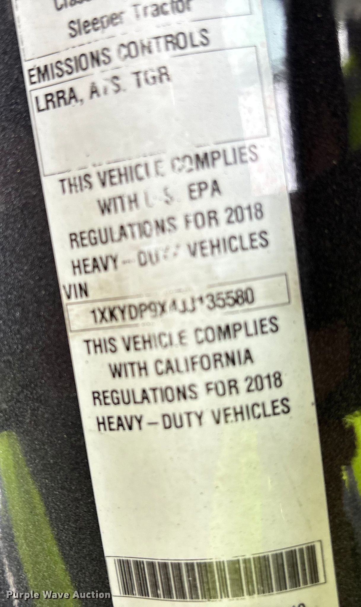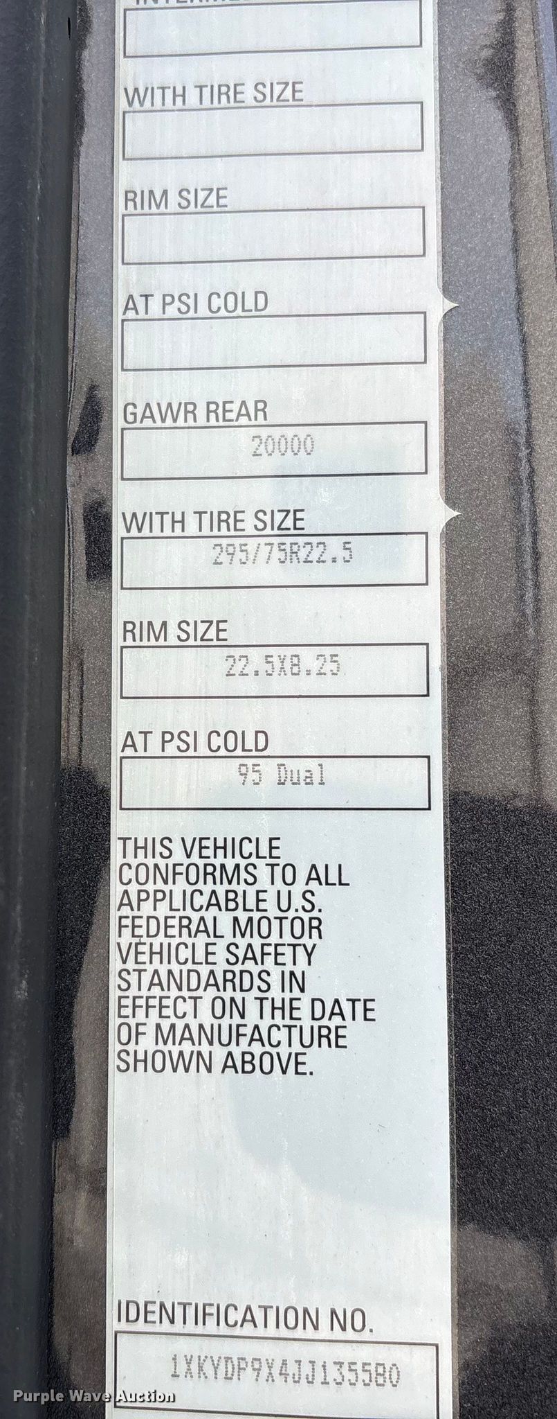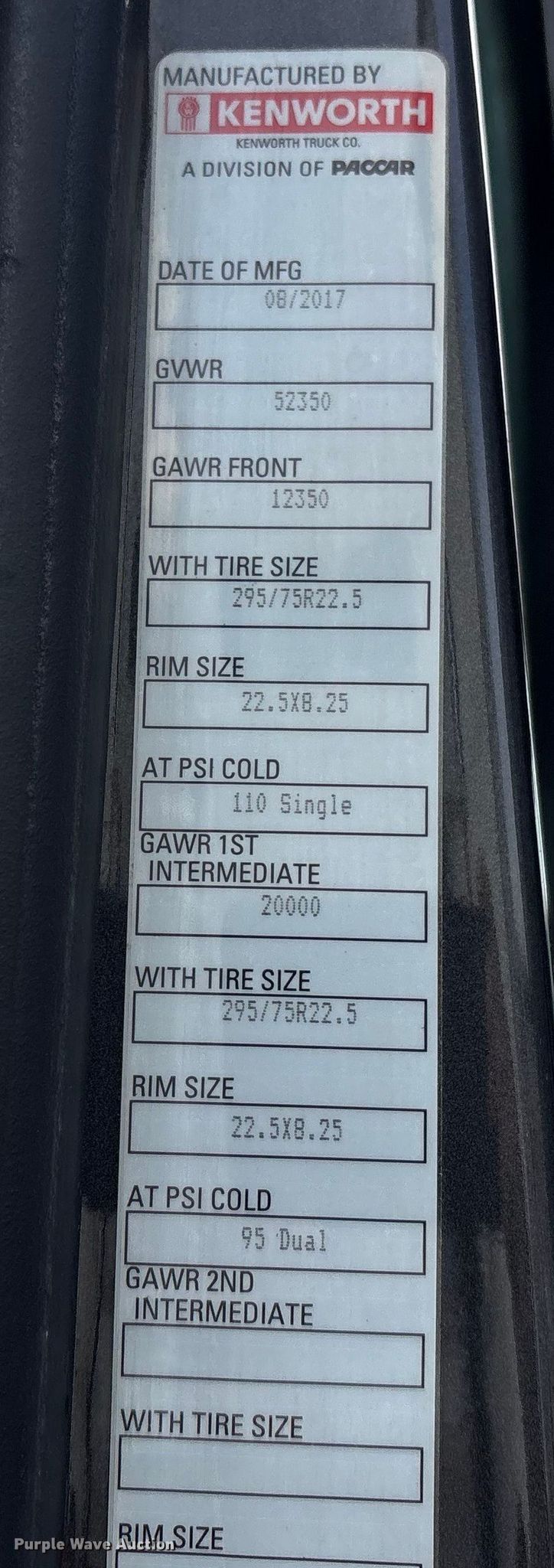 2018 Kenworth T680 semi truck. Miles: 665,808 on odometer, VIN: 1XKYDP9X4JJ135580, Unit #: 98205245. Engine Paccar MX-13, Displacement: 12.9L, Cylinders: 6, Fuel type: Diesel, Engine brake. Transmission Automatic. Chassis Axles: Tandem, Gear ratio: 2.46, Differential lock: Inter-axle, Suspension: Air Dump valves, Brakes: Air, GVWR: 52,350 lbs, Wheelbase: 228". Interior AC, Heat, Heated mirrors, Power windows, Power locks, Cruise control, Air ride cab, Sleeper Sleeper length: 53", Beds: Double bunk, Refrigerator, Rear climate control, Auxiliary power unit Tripac Evolution, Engine Yanmar D458.. Features Deck plate: Aluminum, Fifth wheel type: Air operated, Sliding, Fuel tank: Dual. Tires Front: 275/80R22.5, Rear: 295/75R22.5. Notes Dash warning indicator: Check engine, Windshield chipped or cracked, Driver door electrical controls missing, Non-operational unit Unit must be towed or hauled. Repossessed item, stored at a secured facility. Please review REQUIRED REMOVAL INSTRUCTIONS. Titles will be distributed after confirmation of payment and removal. Florida title. Title distribution may be delayed up to 30 days from verification of funds. Lender Owned. 4019 North Carolina Highway 72. Lumberton, NC 28360