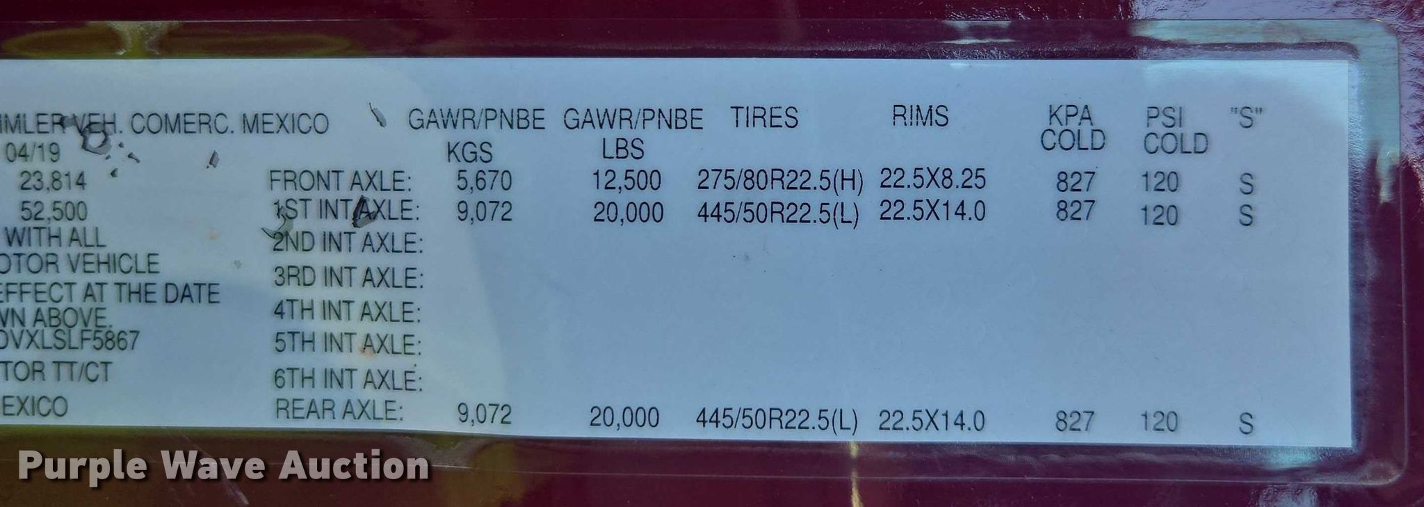 2020 Freightliner Cascadia semi truck. Miles: 661,772 on odometer, VIN: 3AKJHHDVXLSLF5867, Unit #: 74137315. Engine Detroit Diesel DD13, Displacement: 12.8L, Cylinders: 6, Fuel type: Diesel, Engine brake. Transmission Automated manual. Chassis Axles: Tandem, Differential lock: Inter-axle, Suspension: Air Dump valves, Brakes: Air, GVWR: 52,500 lbs FAWR: 12,500 lbs, IAWR: 20,000 lbs, RAWR: 20,000 lbs. Interior AC, Heat, Heated mirrors, Power windows, Power locks, Cruise control, Air ride cab, Sleeper Sleeper length: 60", Beds: Single, Rear climate control. Features Deck plate: Aluminum, Fifth wheel type: Air operated, Sliding, Fuel tank: Dual. Tires Front: 275/80R22.5, Rear: 295/75R22.5. Repossessed item, stored at a secured facility. Please review REQUIRED REMOVAL INSTRUCTIONS. Titles will be distributed after confirmation of payment and removal. New York title. Title distribution may be delayed up to 30 days from verification of funds. Lender Owned. 10428 U.S. 84. Newton, AL 36352