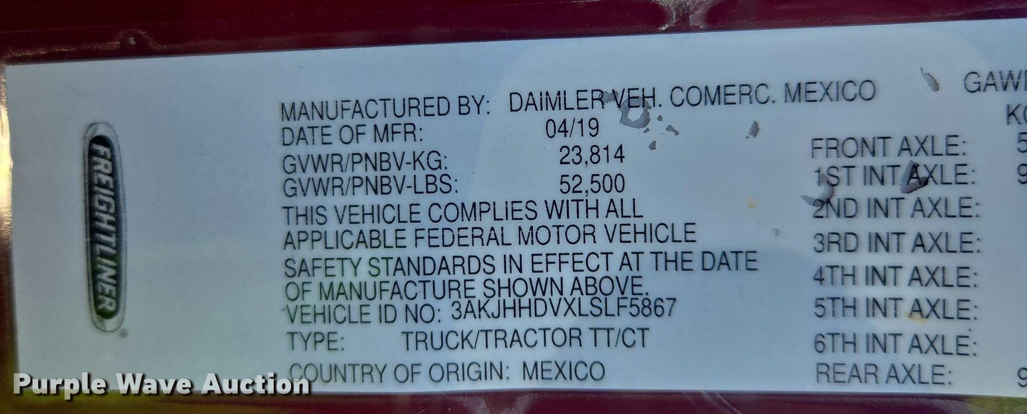 Purple Wave is selling a used Truck Tractor in Alabama. This item is a 2020 Freightliner Cascadia semi truck with the following: Miles: 661,772 on odometer, VIN: 3AKJHHDVXLSLF5867, Unit #: 74137315