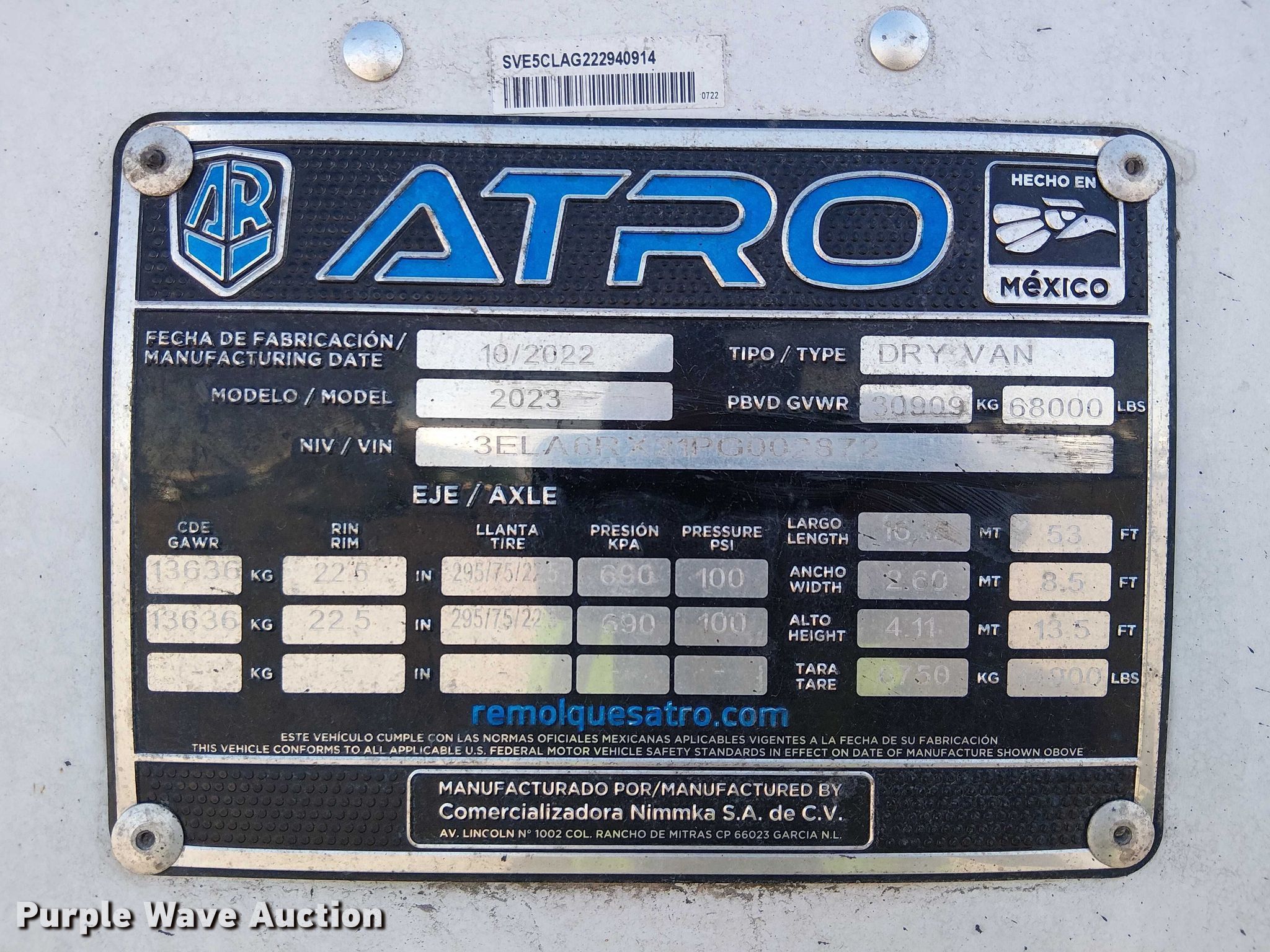 Purple Wave is selling a used Dry Van Trailer in Arizona. This item is a 2023 Atro dry van trailer with the following: VIN: 3ELA6RX21PG002872, Unit #: 77045715