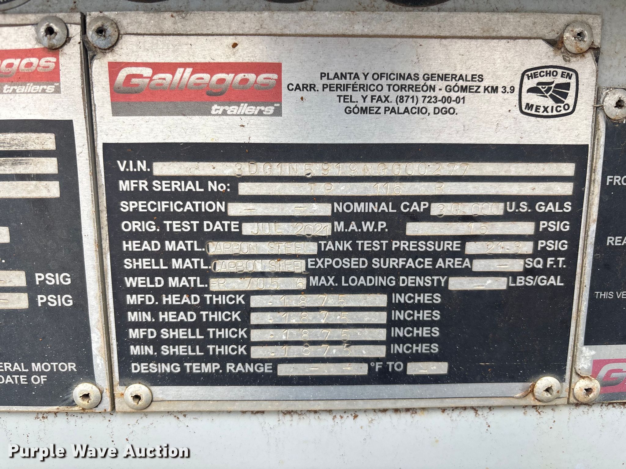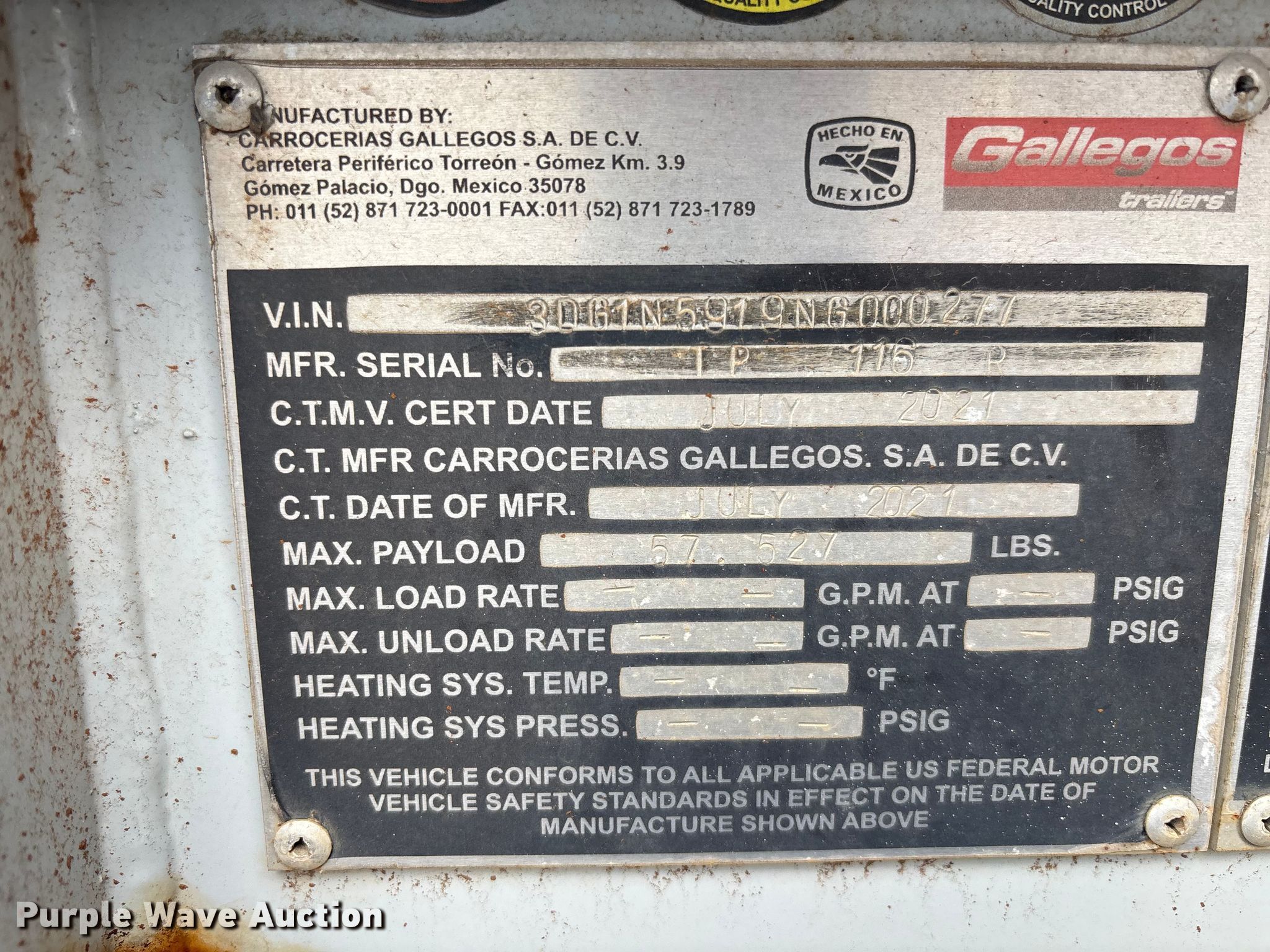 Purple Wave is selling a used Tank Trailer in Florida. This item is a 2022 Gallegos pneumatic dry bulk trailer with the following: VIN: 3DG1N5919NG000277, Unit #: 65870045