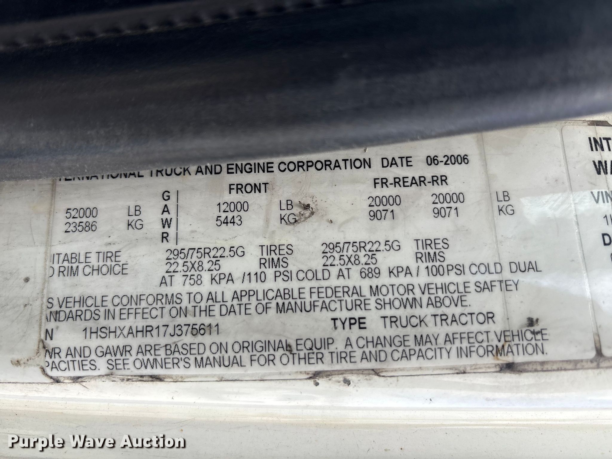 Purple Wave is selling a used Truck Tractor in Texas. This item is a 2007 International 8600 semi truck with the following: Miles: 607,985 on odometer, VIN: 1HSHXAHR17J375611, Unit #: TN5611, Lot #: 77422575