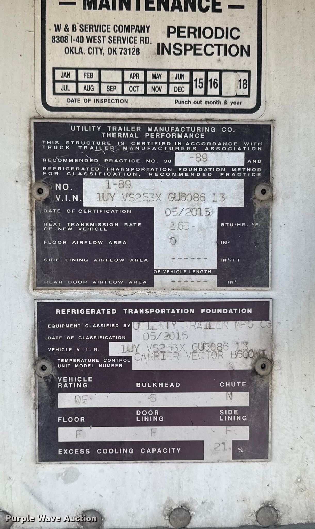 2016 Utility refrigerated van trailer. VIN: 1UYVS253XGU608613, Unit #: 78229795. Dimensions Overall Length: 53', Width: 102". Features Deck type: Aluminum, E-track rail system, Refrigeration unit Carrier Vector 8600 MT, Serial: 91424666. Chassis Landing gear: Dual, Suspension: Air, Brakes: Air, Axles: Tandem Sliding. Tires Steel wheels, Size: 275/80R22.5. Notes Jump start required during on-site data collection. Fleet inventory reduction, stored at a secured facility. Please review REQUIRED REMOVAL INSTRUCTIONS. Titles will be distributed after confirmation of payment and removal. Georgia title. Title distribution may be delayed up to 30 days from verification of funds. Lazer Logistics. Big Lake, MN 55309