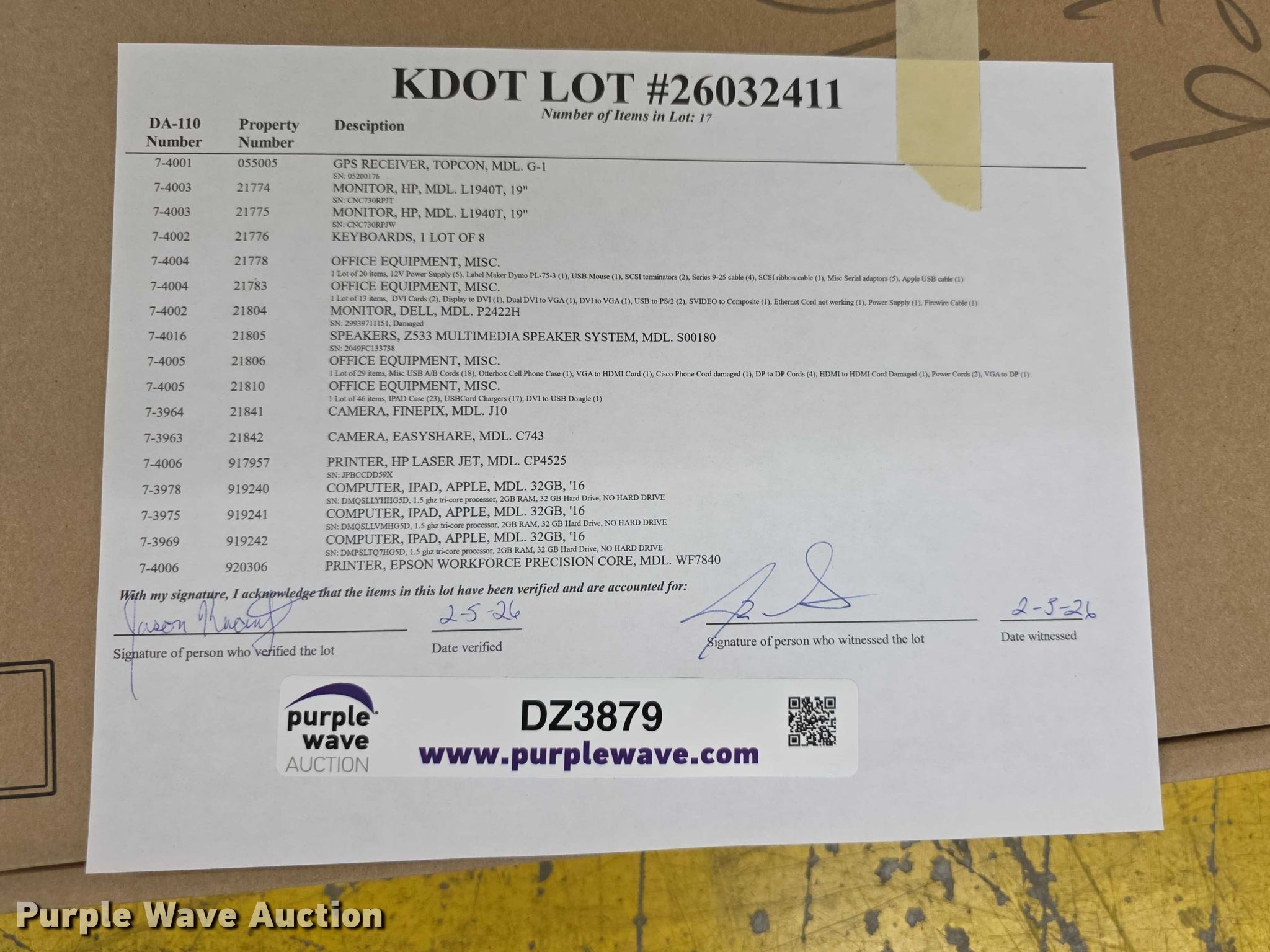 Purple Wave is selling a used Electronics in Kansas. This item is a Electronics with the following: (2) cameras, (3) Apple iPads, Hard drives have been reformatted and no operating system installed, TopCon GPS receiver, (3) monitors, Office equipment, (2) printers, Speakers, KDOT ID: 26032411