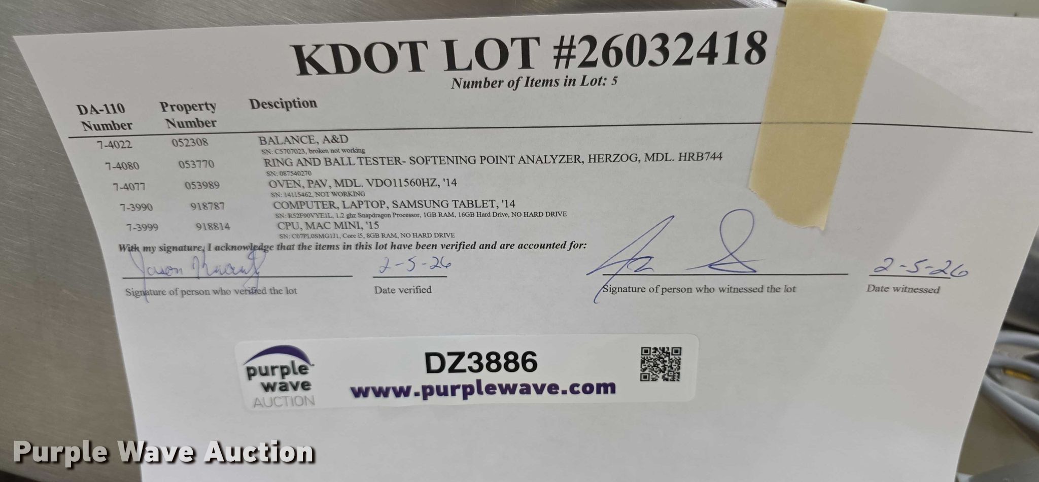 Purple Wave is selling a used Electronics in Kansas. This item is a Electronics with the following: Scale, Samsung tablet, Mac Mini CPU, Hard drives have been reformatted and no operating system installed, Oven, Ring and ball tester, KDOT ID: 26032418