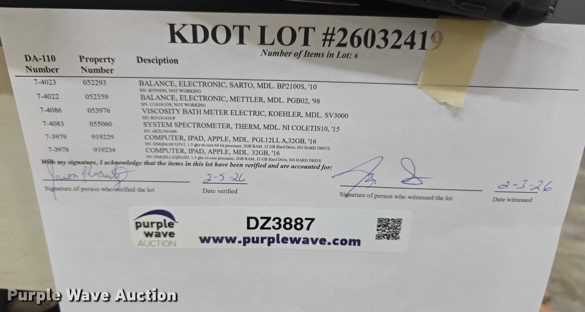 Purple Wave is selling a used Electronics in Kansas. This item is a Electronics with the following: (2) Apple iPads, Hard drives have been reformatted and no operating system installed, (2) Scales, System spectrometer, Viscosity bath meter, KDOT ID: 26032419