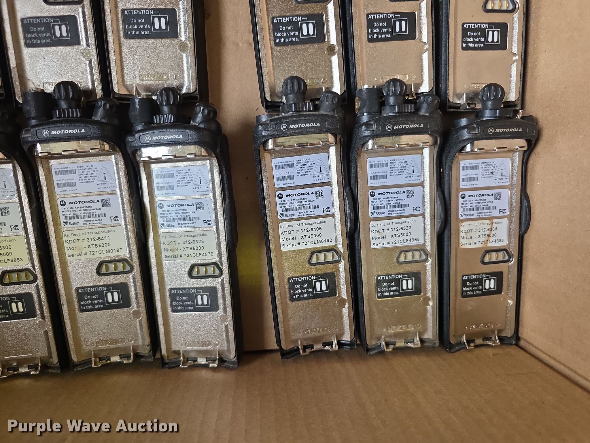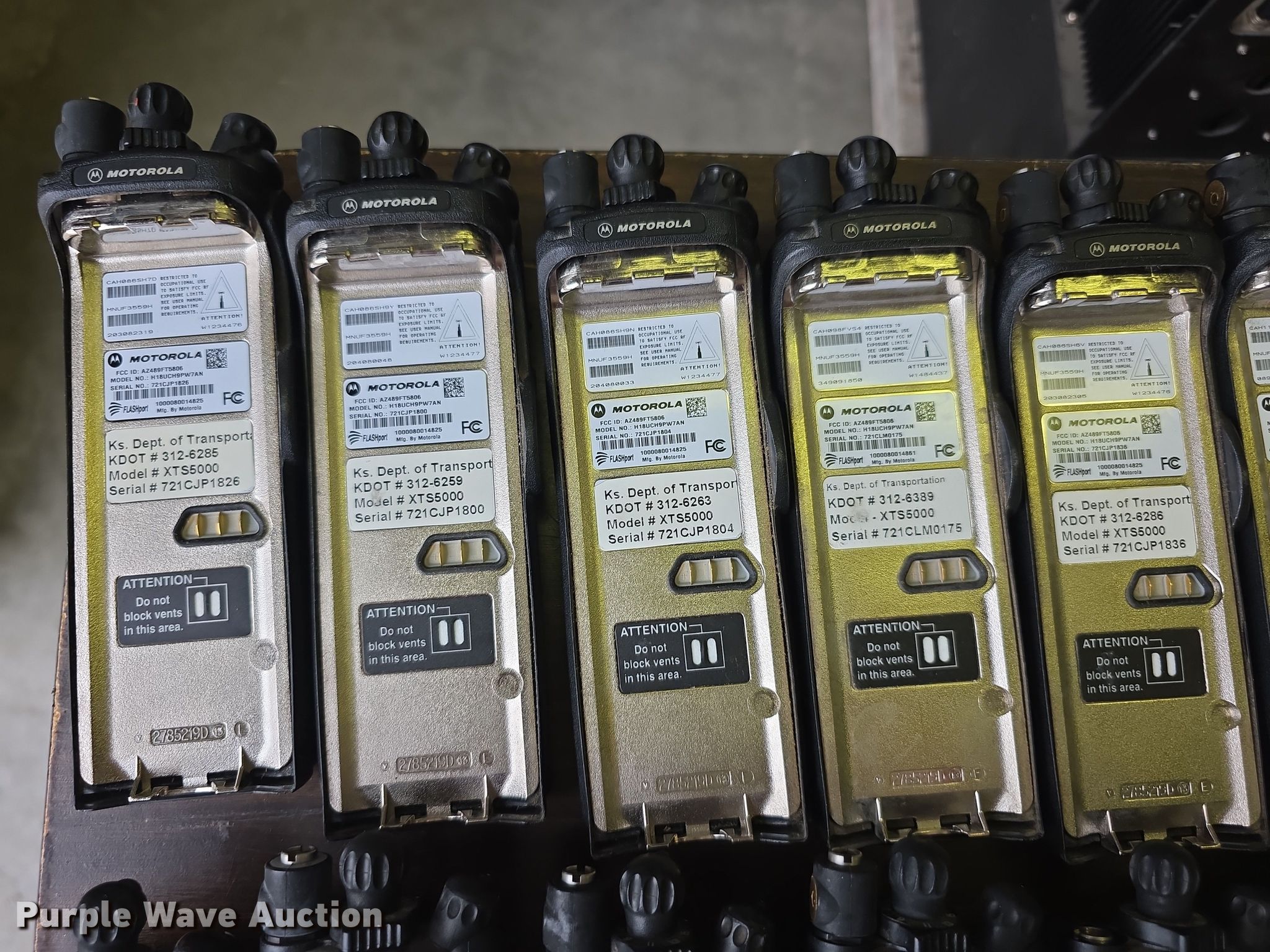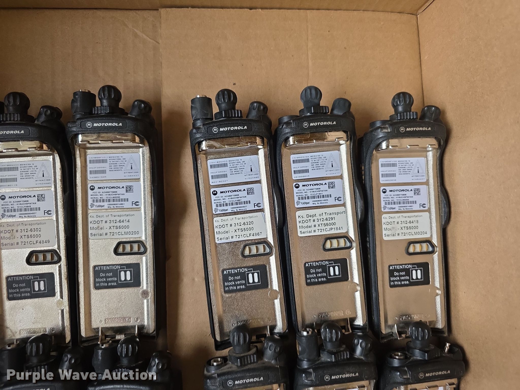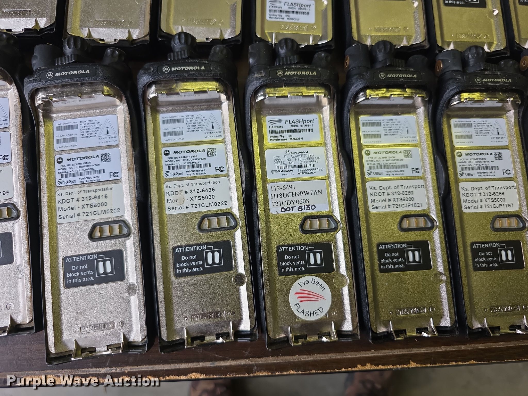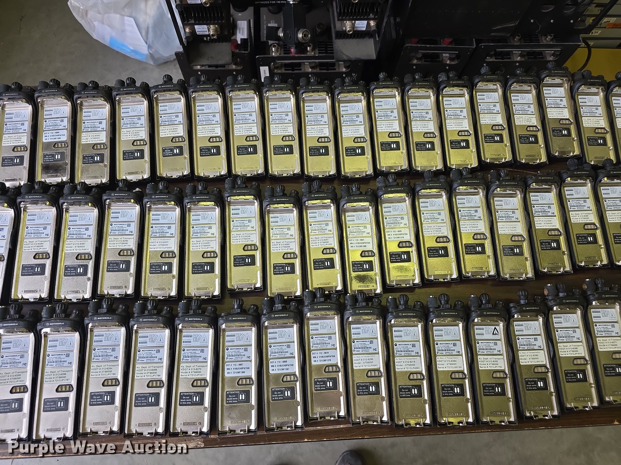 Purple Wave is selling a used Electronics in Kansas. This item is a Approximately 105 Motorola XTS5000 radios with the following: KDOT ID: 1816, 0726754, 1126491, 1126606, 1126607, 1126608, 1126619, 1126620, 1126621, 2126245, 2126246, 2126247, 2126248, 2126249, 2126251, 2126252, 2126253, 2126254, 2126387, 2126415, 3126246, 3126249, 3126250, 3126251, 3126252, 3126254, 3126255, 3126256, 3126257, 3126258, 3126259, 3126260, 3126261, 3126263, 3126264, 3126265, 3126266, 3126267, 3126268, 3126269, 3126270, 3126271, 3126273, 3126279, 3126280, 3126281, 3126285, 3126286, 3126288, 3126290, 3126291, 3126294, 3126295, 3126296, 3126297, 3126298, 3126301, 3126302, 3126305, 3126306, 3126307, 3126314, 3126316, 3126317, 3126319, 3126320, 3126321, 3126322, 3126323, 3126324, 3126325, 3126336, 3126340, 3126352, 3126354, 3126355, 3126356, 3126357, 3126358, 3126361, 3126364, 3126366, 3126367, 3126389, 3126392, 3126393, 3126394, 3126398, 3126406, 3126408, 3126409, 3126410, 3126411, 3126414, 3126415, 3126416, 3126418, 3126427, 3126432, 3126434, 3126436, 3126437, 3126248