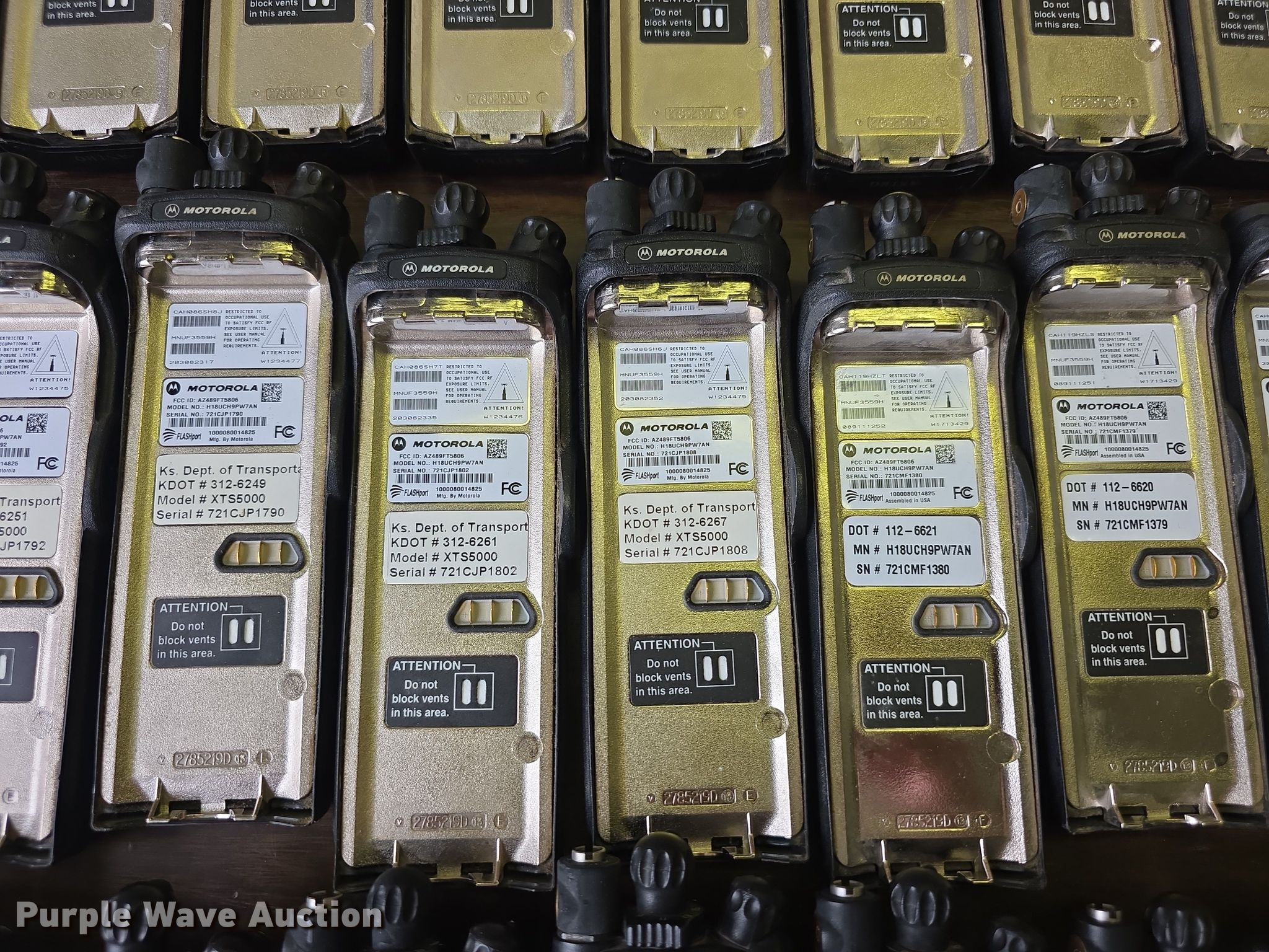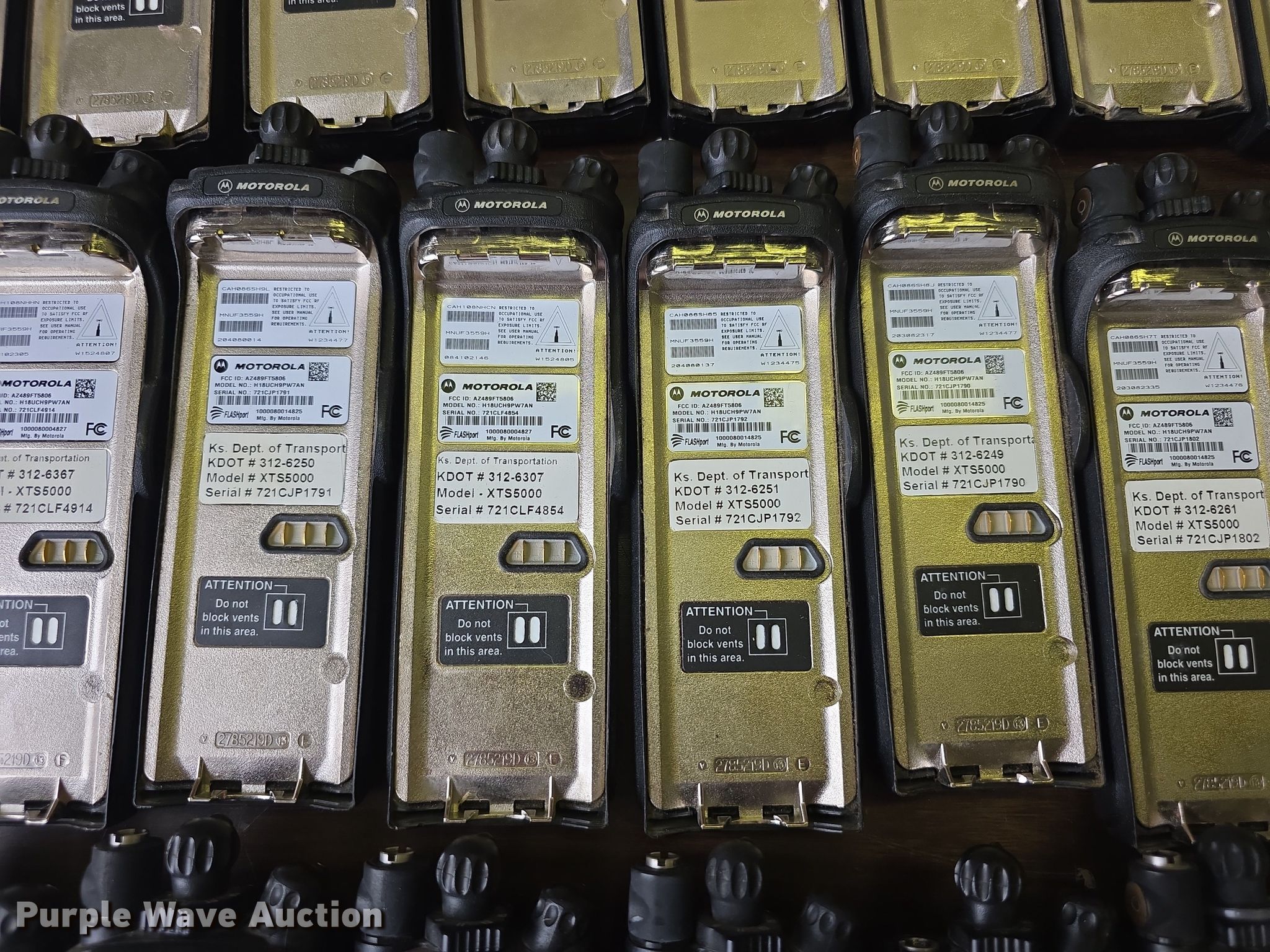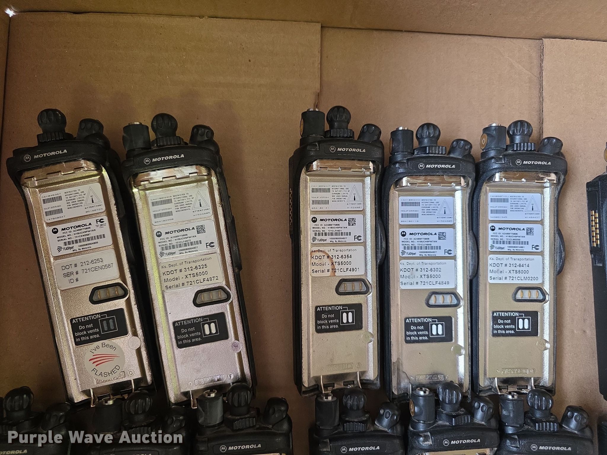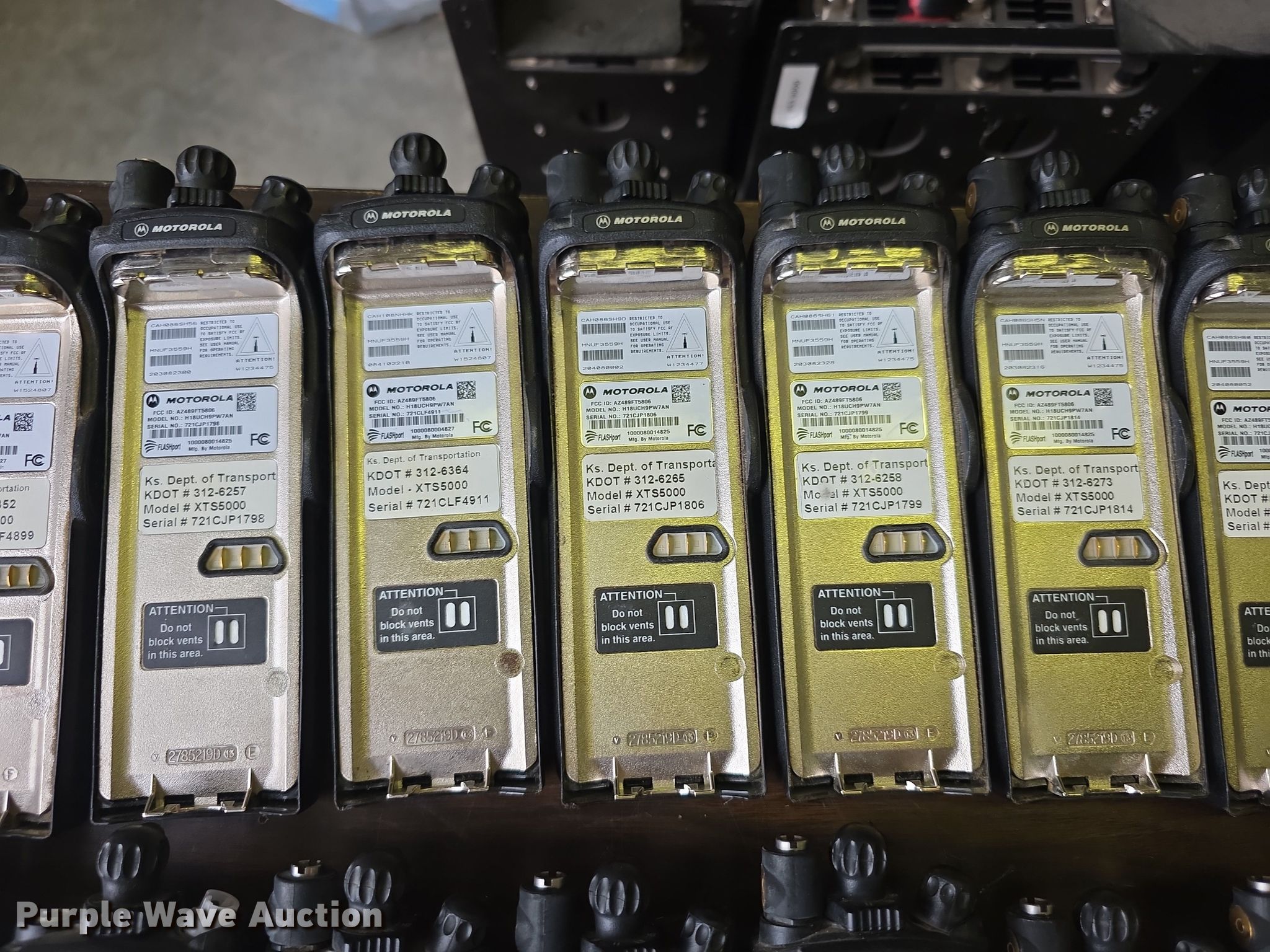 Purple Wave is selling a used Electronics in Kansas. This item is a Approximately 105 Motorola XTS5000 radios with the following: KDOT ID: 1816, 0726754, 1126491, 1126606, 1126607, 1126608, 1126619, 1126620, 1126621, 2126245, 2126246, 2126247, 2126248, 2126249, 2126251, 2126252, 2126253, 2126254, 2126387, 2126415, 3126246, 3126249, 3126250, 3126251, 3126252, 3126254, 3126255, 3126256, 3126257, 3126258, 3126259, 3126260, 3126261, 3126263, 3126264, 3126265, 3126266, 3126267, 3126268, 3126269, 3126270, 3126271, 3126273, 3126279, 3126280, 3126281, 3126285, 3126286, 3126288, 3126290, 3126291, 3126294, 3126295, 3126296, 3126297, 3126298, 3126301, 3126302, 3126305, 3126306, 3126307, 3126314, 3126316, 3126317, 3126319, 3126320, 3126321, 3126322, 3126323, 3126324, 3126325, 3126336, 3126340, 3126352, 3126354, 3126355, 3126356, 3126357, 3126358, 3126361, 3126364, 3126366, 3126367, 3126389, 3126392, 3126393, 3126394, 3126398, 3126406, 3126408, 3126409, 3126410, 3126411, 3126414, 3126415, 3126416, 3126418, 3126427, 3126432, 3126434, 3126436, 3126437, 3126248