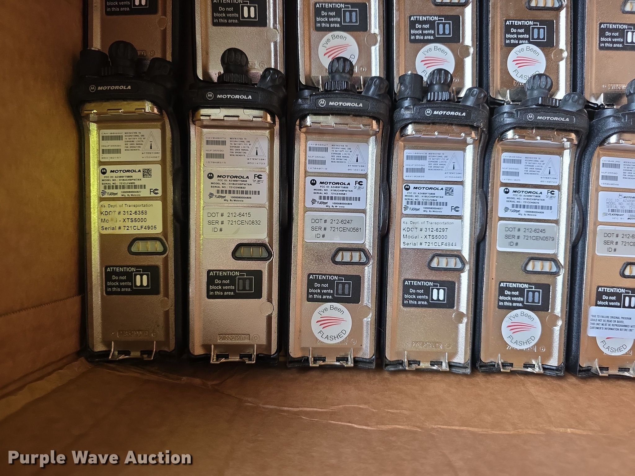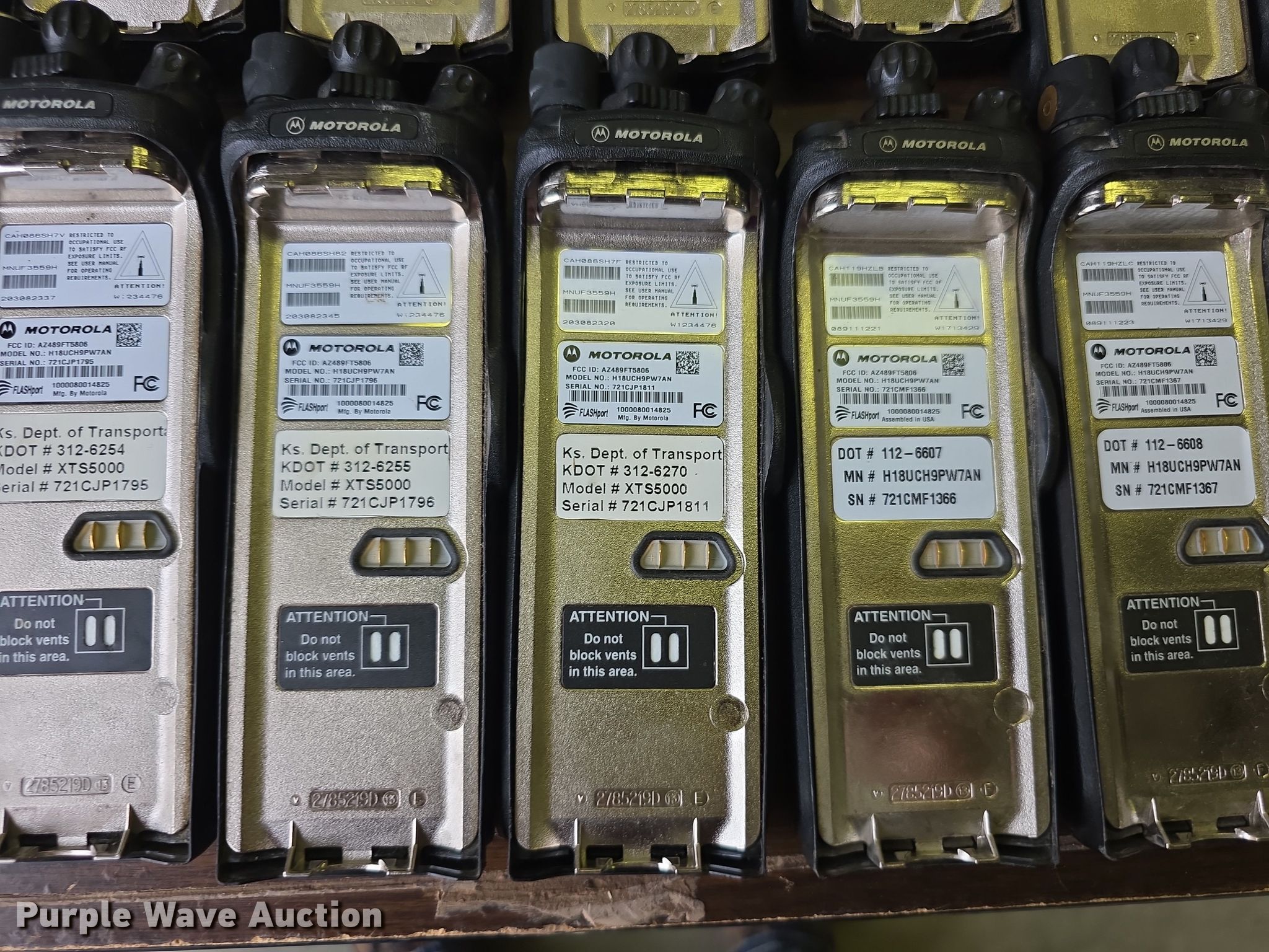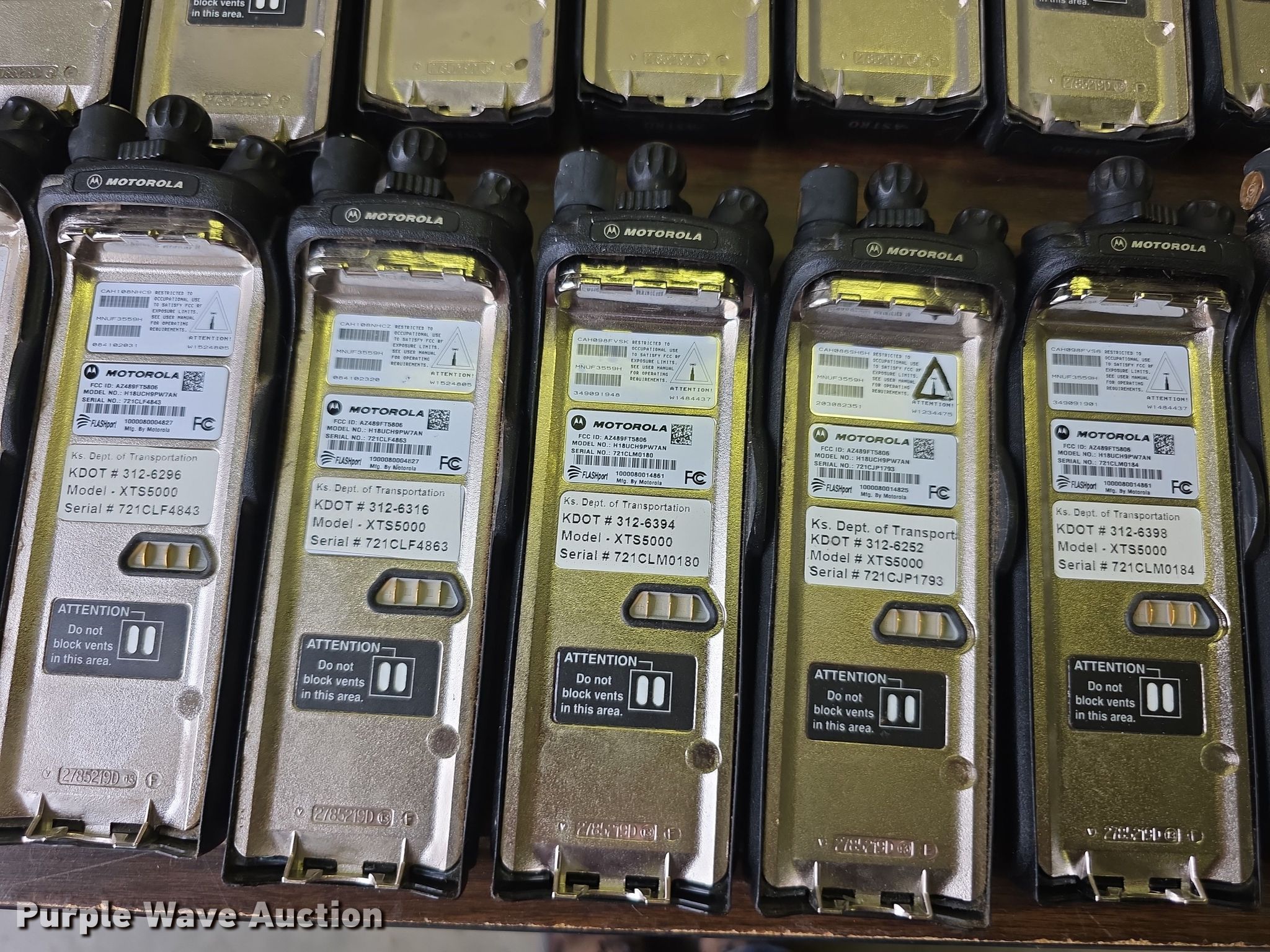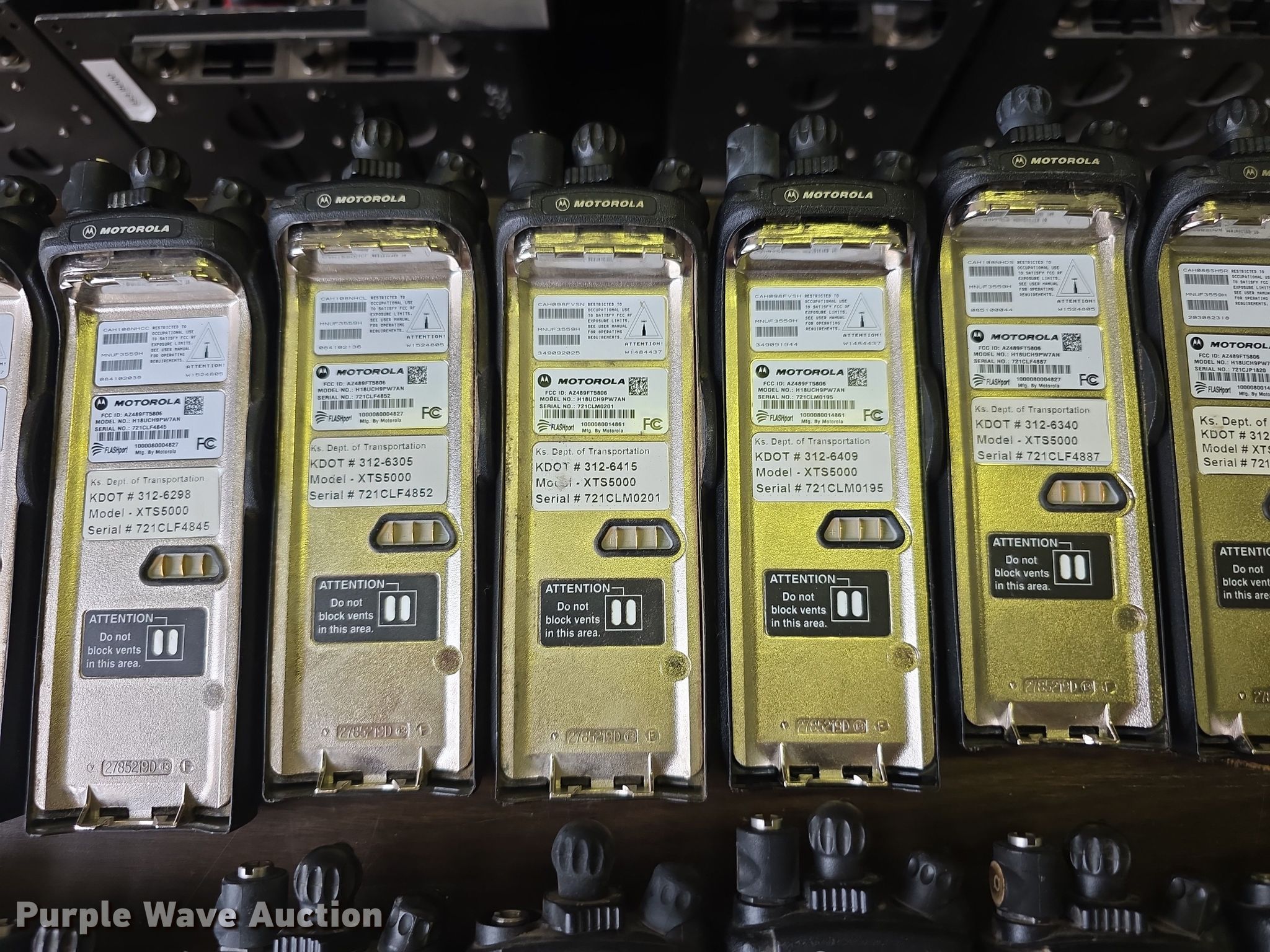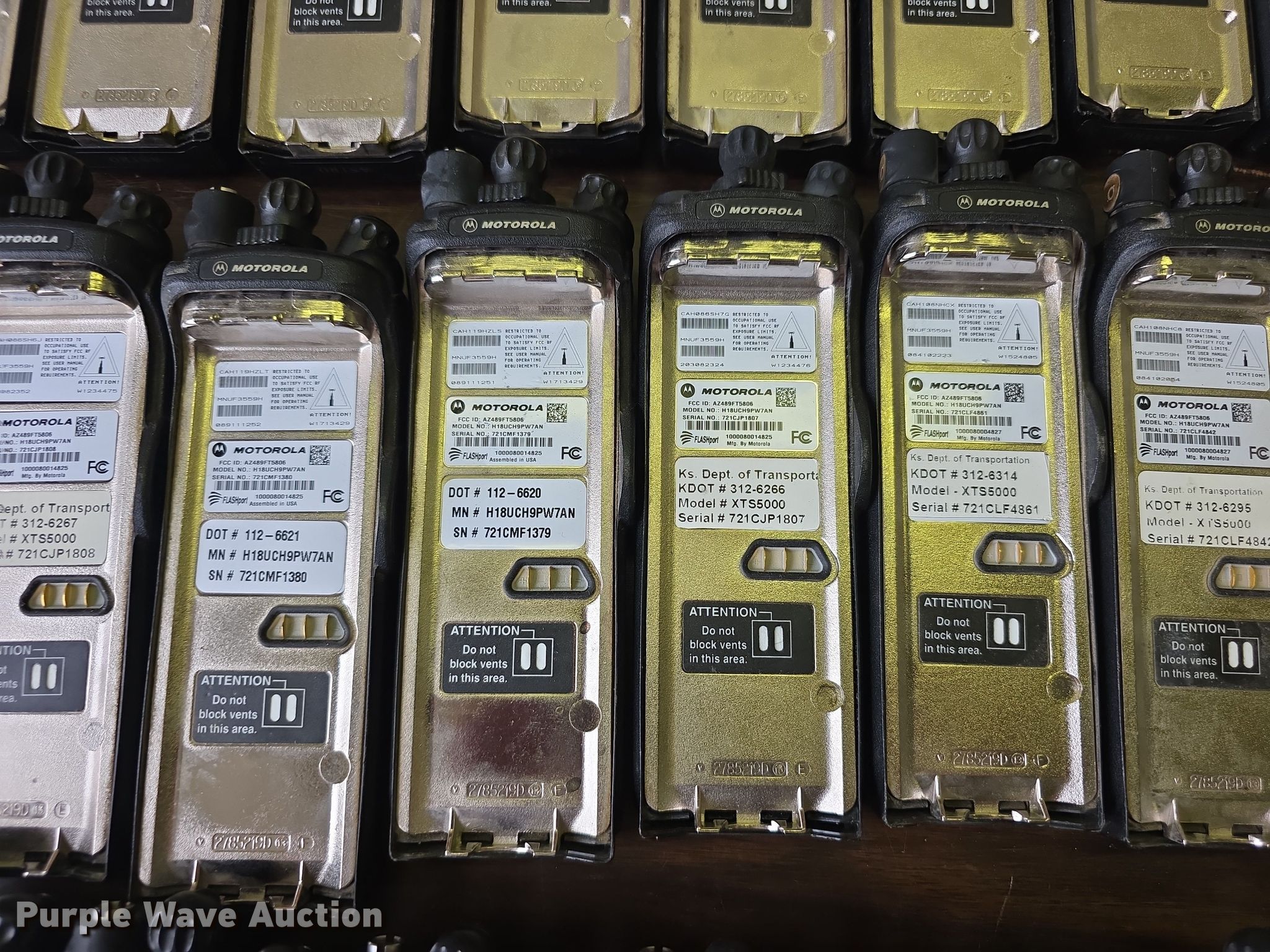 Purple Wave is selling a used Electronics in Kansas. This item is a Approximately 105 Motorola XTS5000 radios with the following: KDOT ID: 1816, 0726754, 1126491, 1126606, 1126607, 1126608, 1126619, 1126620, 1126621, 2126245, 2126246, 2126247, 2126248, 2126249, 2126251, 2126252, 2126253, 2126254, 2126387, 2126415, 3126246, 3126249, 3126250, 3126251, 3126252, 3126254, 3126255, 3126256, 3126257, 3126258, 3126259, 3126260, 3126261, 3126263, 3126264, 3126265, 3126266, 3126267, 3126268, 3126269, 3126270, 3126271, 3126273, 3126279, 3126280, 3126281, 3126285, 3126286, 3126288, 3126290, 3126291, 3126294, 3126295, 3126296, 3126297, 3126298, 3126301, 3126302, 3126305, 3126306, 3126307, 3126314, 3126316, 3126317, 3126319, 3126320, 3126321, 3126322, 3126323, 3126324, 3126325, 3126336, 3126340, 3126352, 3126354, 3126355, 3126356, 3126357, 3126358, 3126361, 3126364, 3126366, 3126367, 3126389, 3126392, 3126393, 3126394, 3126398, 3126406, 3126408, 3126409, 3126410, 3126411, 3126414, 3126415, 3126416, 3126418, 3126427, 3126432, 3126434, 3126436, 3126437, 3126248
