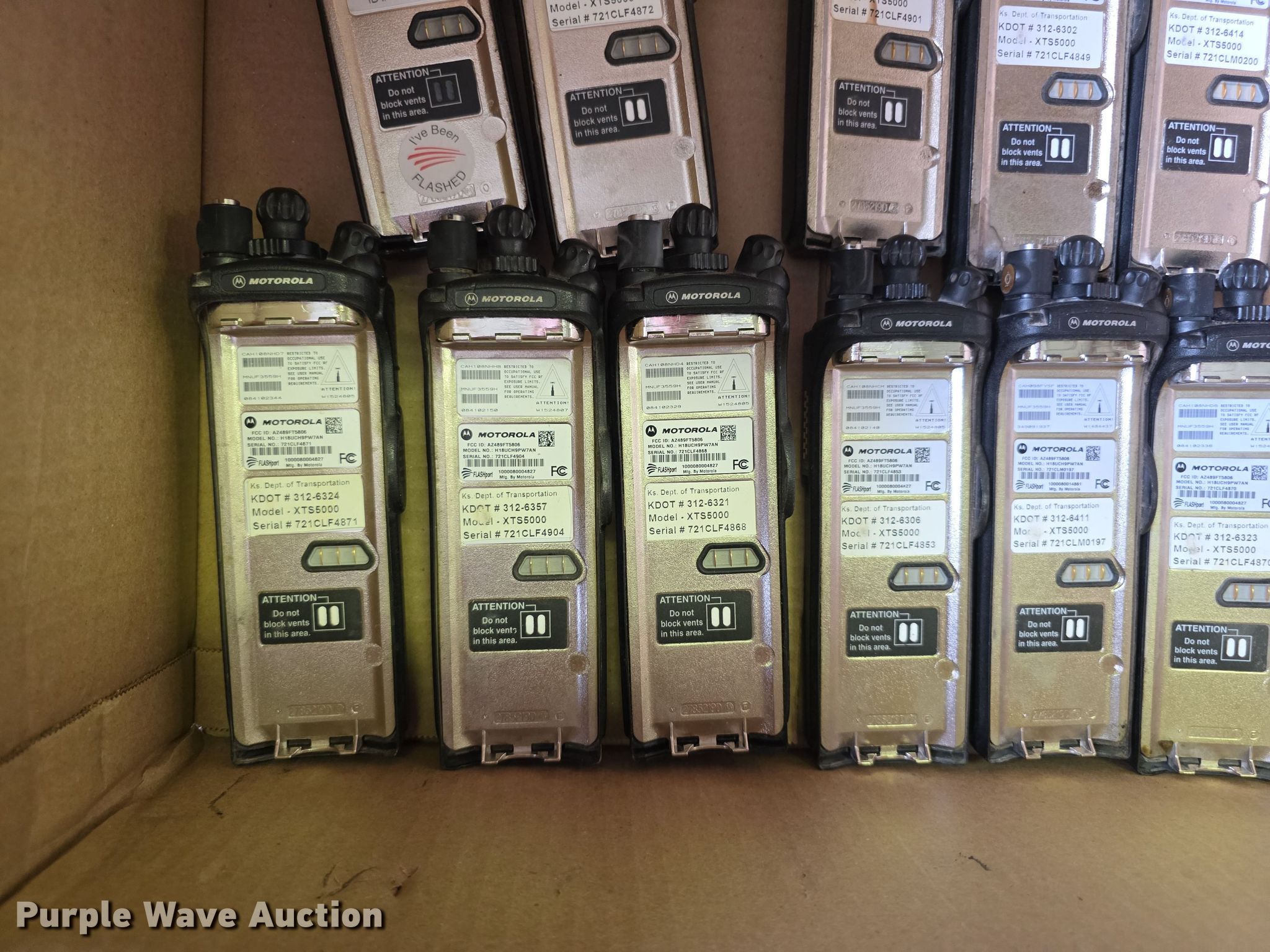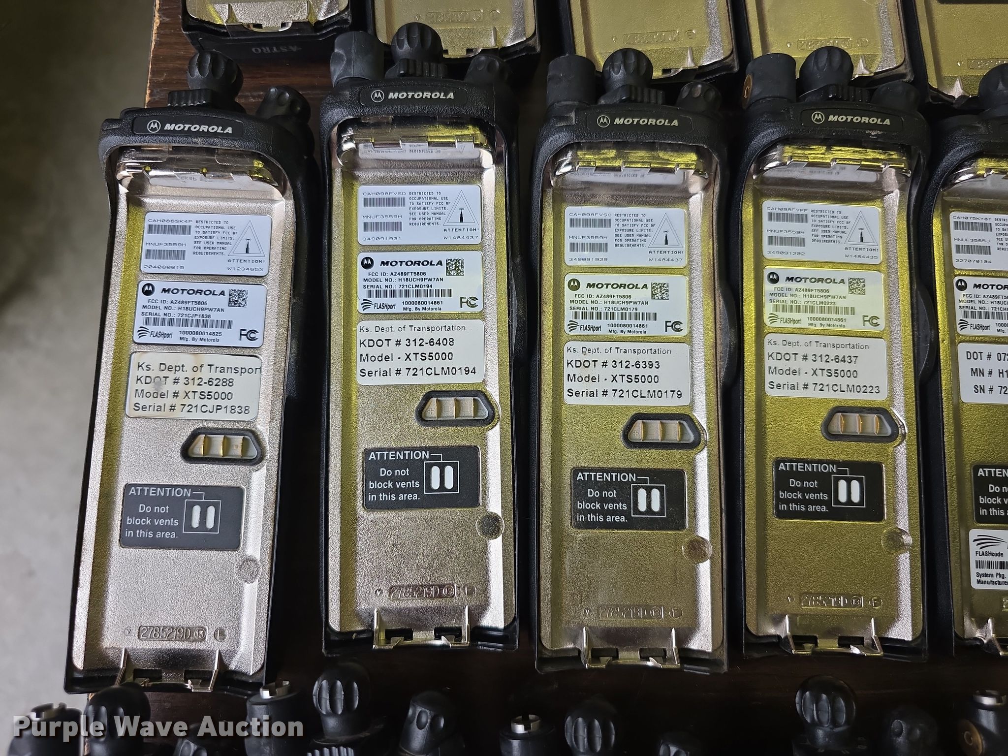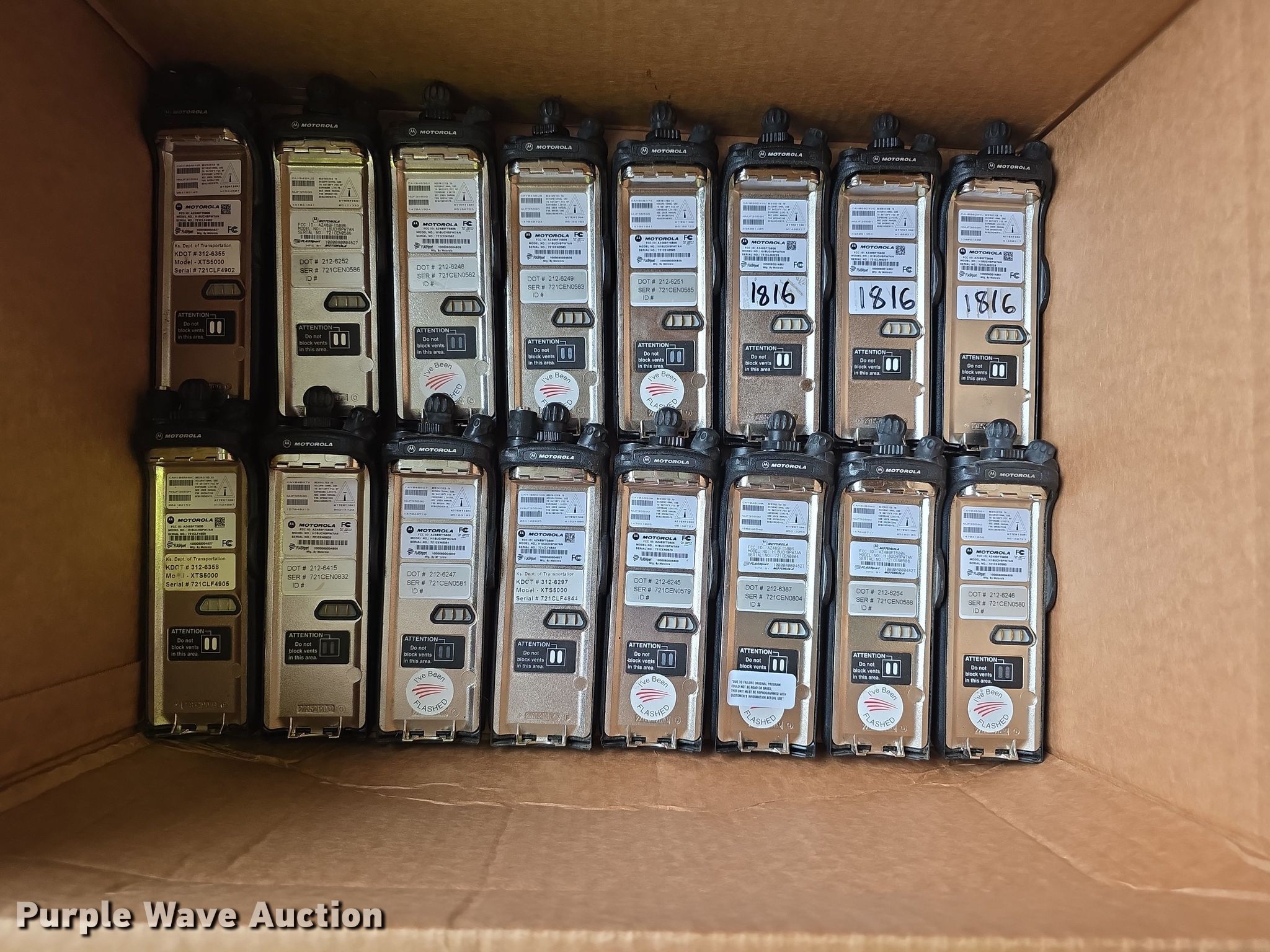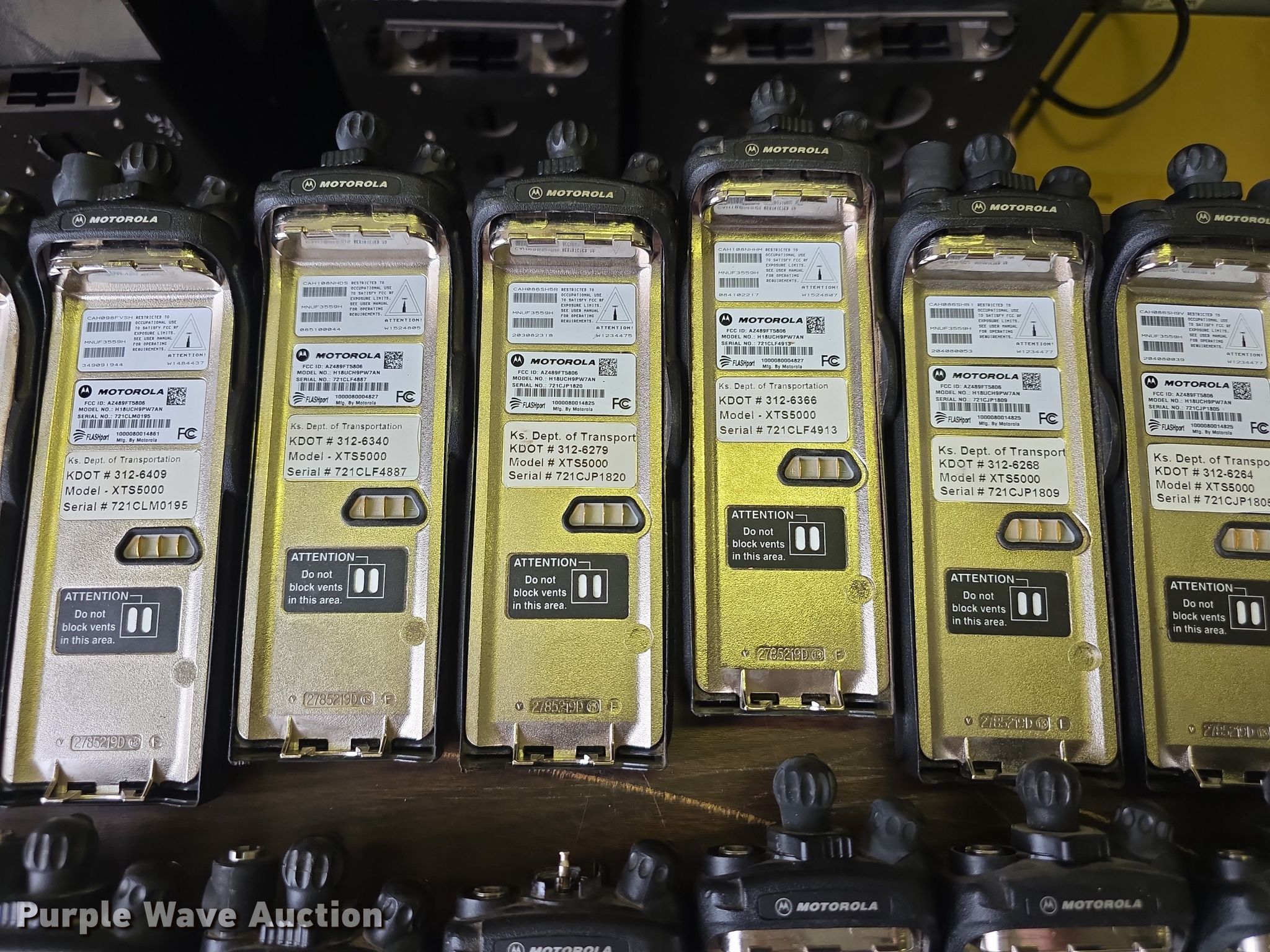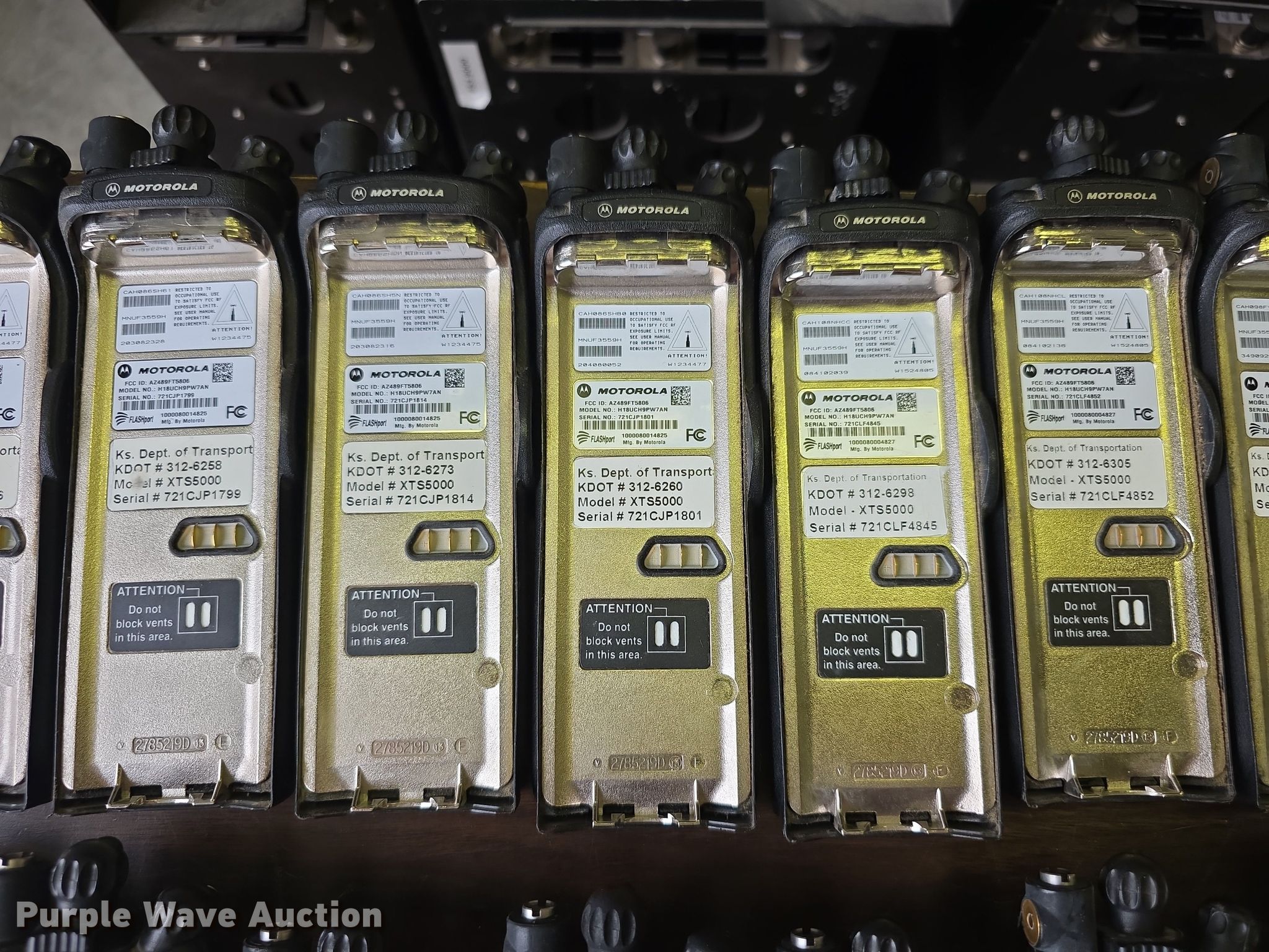 Purple Wave is selling a used Electronics in Kansas. This item is a Approximately 105 Motorola XTS5000 radios with the following: KDOT ID: 1816, 0726754, 1126491, 1126606, 1126607, 1126608, 1126619, 1126620, 1126621, 2126245, 2126246, 2126247, 2126248, 2126249, 2126251, 2126252, 2126253, 2126254, 2126387, 2126415, 3126246, 3126249, 3126250, 3126251, 3126252, 3126254, 3126255, 3126256, 3126257, 3126258, 3126259, 3126260, 3126261, 3126263, 3126264, 3126265, 3126266, 3126267, 3126268, 3126269, 3126270, 3126271, 3126273, 3126279, 3126280, 3126281, 3126285, 3126286, 3126288, 3126290, 3126291, 3126294, 3126295, 3126296, 3126297, 3126298, 3126301, 3126302, 3126305, 3126306, 3126307, 3126314, 3126316, 3126317, 3126319, 3126320, 3126321, 3126322, 3126323, 3126324, 3126325, 3126336, 3126340, 3126352, 3126354, 3126355, 3126356, 3126357, 3126358, 3126361, 3126364, 3126366, 3126367, 3126389, 3126392, 3126393, 3126394, 3126398, 3126406, 3126408, 3126409, 3126410, 3126411, 3126414, 3126415, 3126416, 3126418, 3126427, 3126432, 3126434, 3126436, 3126437, 3126248