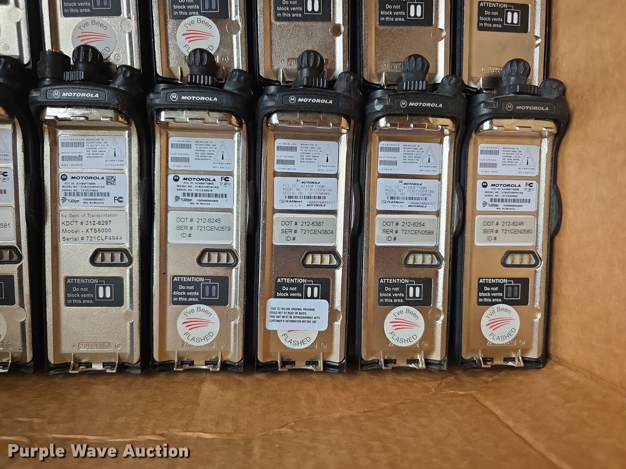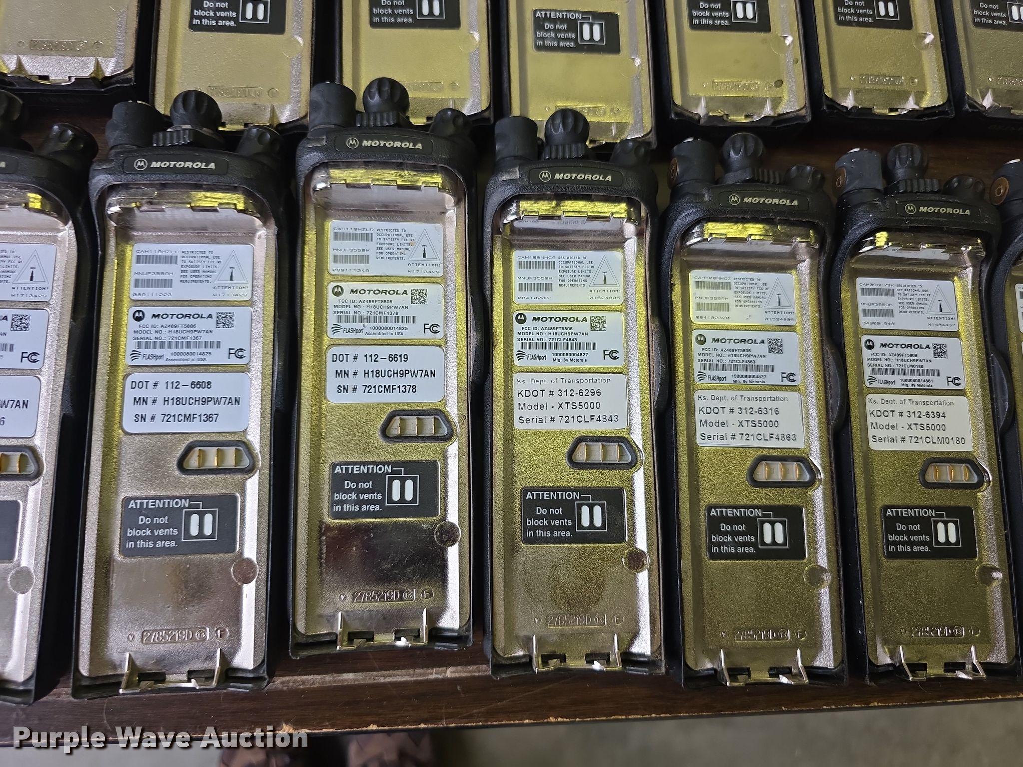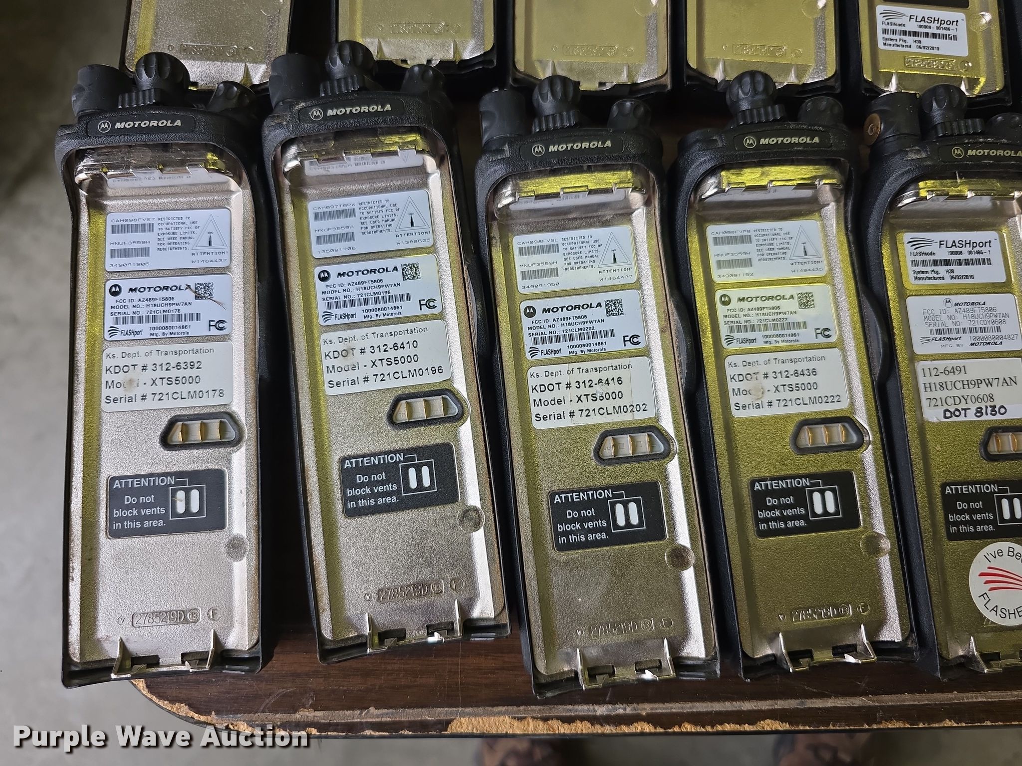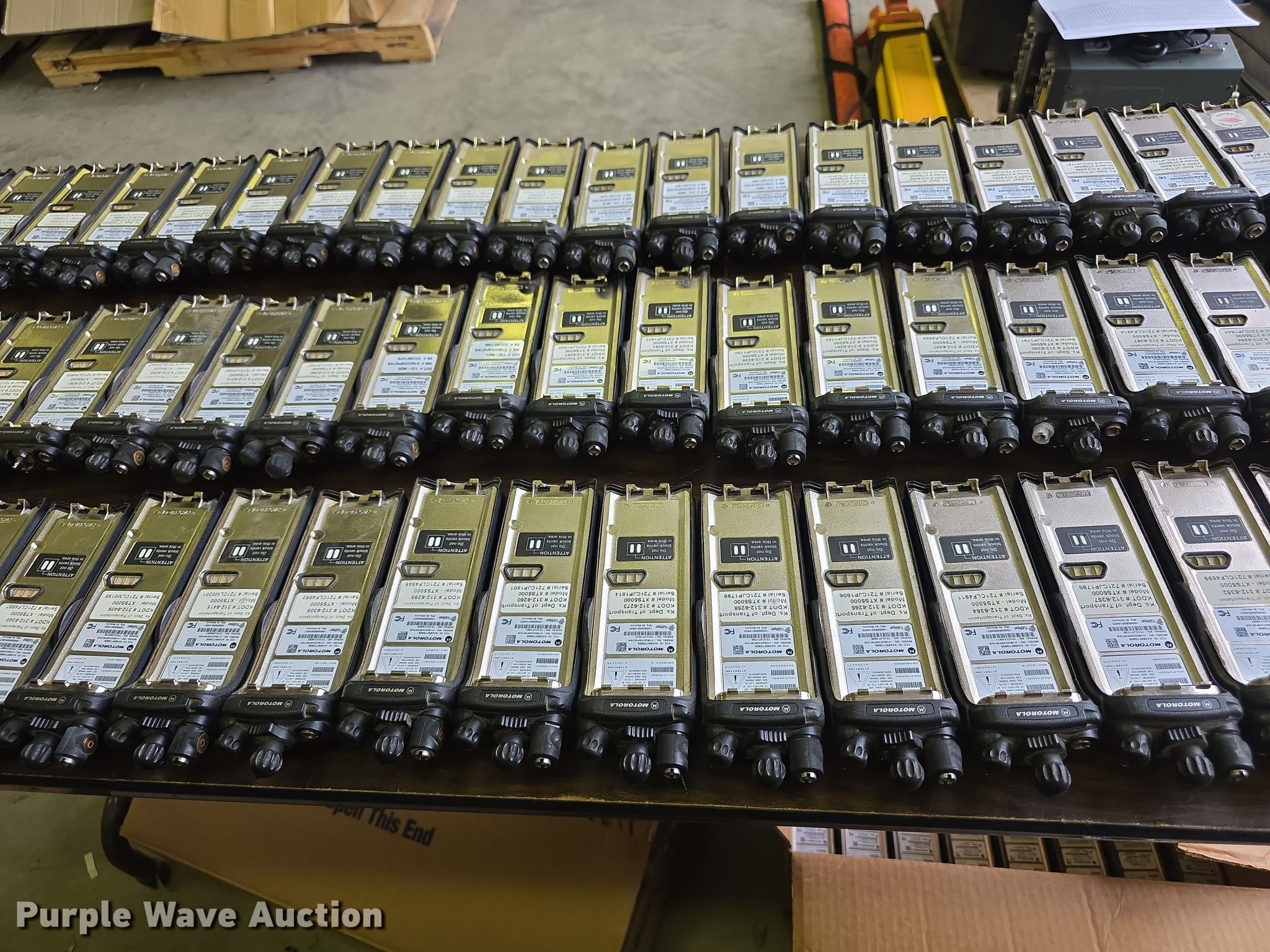 Purple Wave is selling a used Electronics in Kansas. This item is a Approximately 105 Motorola XTS5000 radios with the following: KDOT ID: 1816, 0726754, 1126491, 1126606, 1126607, 1126608, 1126619, 1126620, 1126621, 2126245, 2126246, 2126247, 2126248, 2126249, 2126251, 2126252, 2126253, 2126254, 2126387, 2126415, 3126246, 3126249, 3126250, 3126251, 3126252, 3126254, 3126255, 3126256, 3126257, 3126258, 3126259, 3126260, 3126261, 3126263, 3126264, 3126265, 3126266, 3126267, 3126268, 3126269, 3126270, 3126271, 3126273, 3126279, 3126280, 3126281, 3126285, 3126286, 3126288, 3126290, 3126291, 3126294, 3126295, 3126296, 3126297, 3126298, 3126301, 3126302, 3126305, 3126306, 3126307, 3126314, 3126316, 3126317, 3126319, 3126320, 3126321, 3126322, 3126323, 3126324, 3126325, 3126336, 3126340, 3126352, 3126354, 3126355, 3126356, 3126357, 3126358, 3126361, 3126364, 3126366, 3126367, 3126389, 3126392, 3126393, 3126394, 3126398, 3126406, 3126408, 3126409, 3126410, 3126411, 3126414, 3126415, 3126416, 3126418, 3126427, 3126432, 3126434, 3126436, 3126437, 3126248