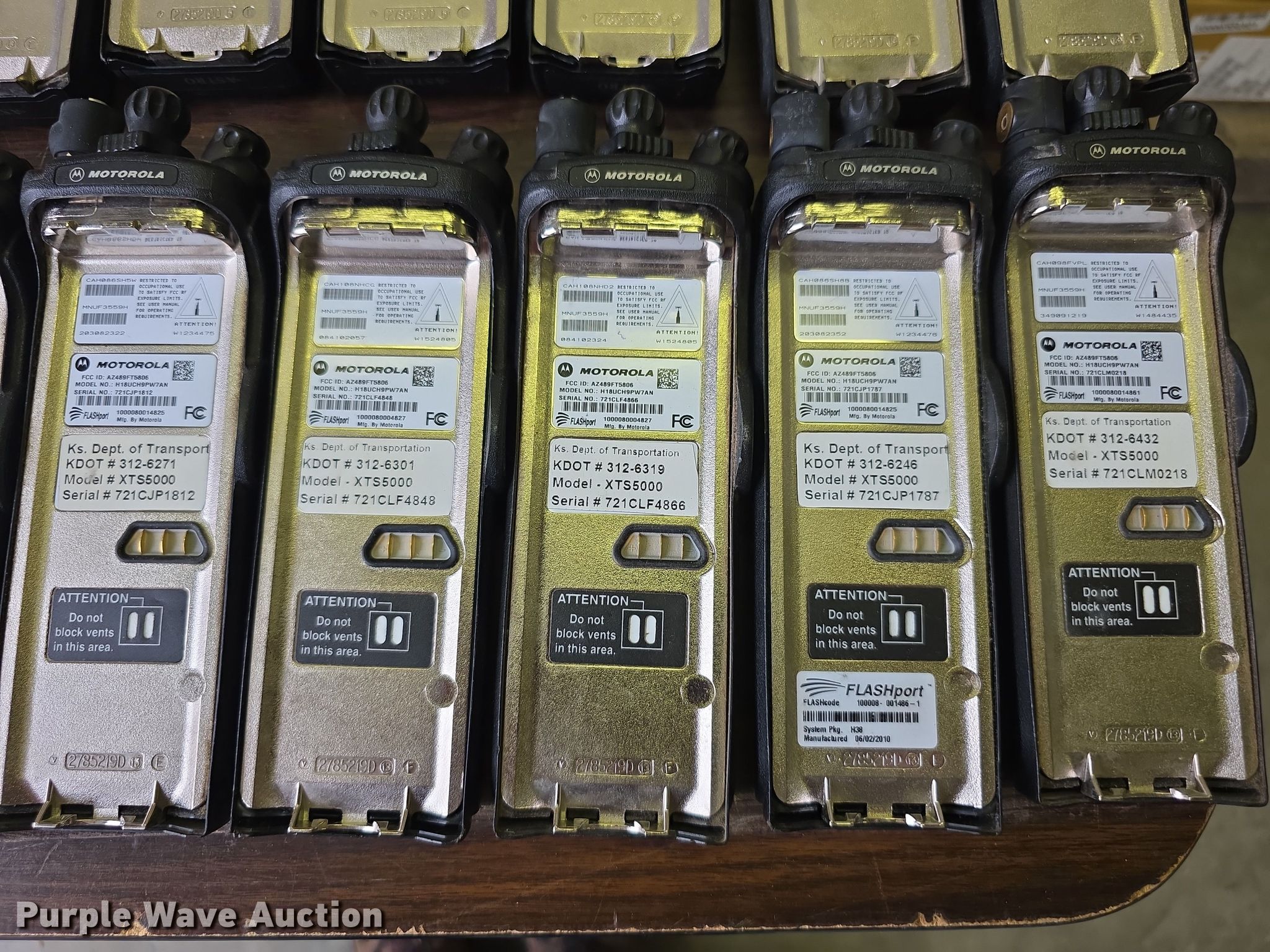 Approximately 105 Motorola XTS5000 radios. KDOT ID: 1816, 0726754, 1126491, 1126606, 1126607, 1126608, 1126619, 1126620, 1126621, 2126245, 2126246, 2126247, 2126248, 2126249, 2126251, 2126252, 2126253, 2126254, 2126387, 2126415, 3126246, 3126249, 3126250, 3126251, 3126252, 3126254, 3126255, 3126256, 3126257, 3126258, 3126259, 3126260, 3126261, 3126263, 3126264, 3126265, 3126266, 3126267, 3126268, 3126269, 3126270, 3126271, 3126273, 3126279, 3126280, 3126281, 3126285, 3126286, 3126288, 3126290, 3126291, 3126294, 3126295, 3126296, 3126297, 3126298, 3126301, 3126302, 3126305, 3126306, 3126307, 3126314, 3126316, 3126317, 3126319, 3126320, 3126321, 3126322, 3126323, 3126324, 3126325, 3126336, 3126340, 3126352, 3126354, 3126355, 3126356, 3126357, 3126358, 3126361, 3126364, 3126366, 3126367, 3126389, 3126392, 3126393, 3126394, 3126398, 3126406, 3126408, 3126409, 3126410, 3126411, 3126414, 3126415, 3126416, 3126418, 3126427, 3126432, 3126434, 3126436, 3126437, 3126248. View inventory for more information. Kansas Department of Transportation. Topeka, KS 66614