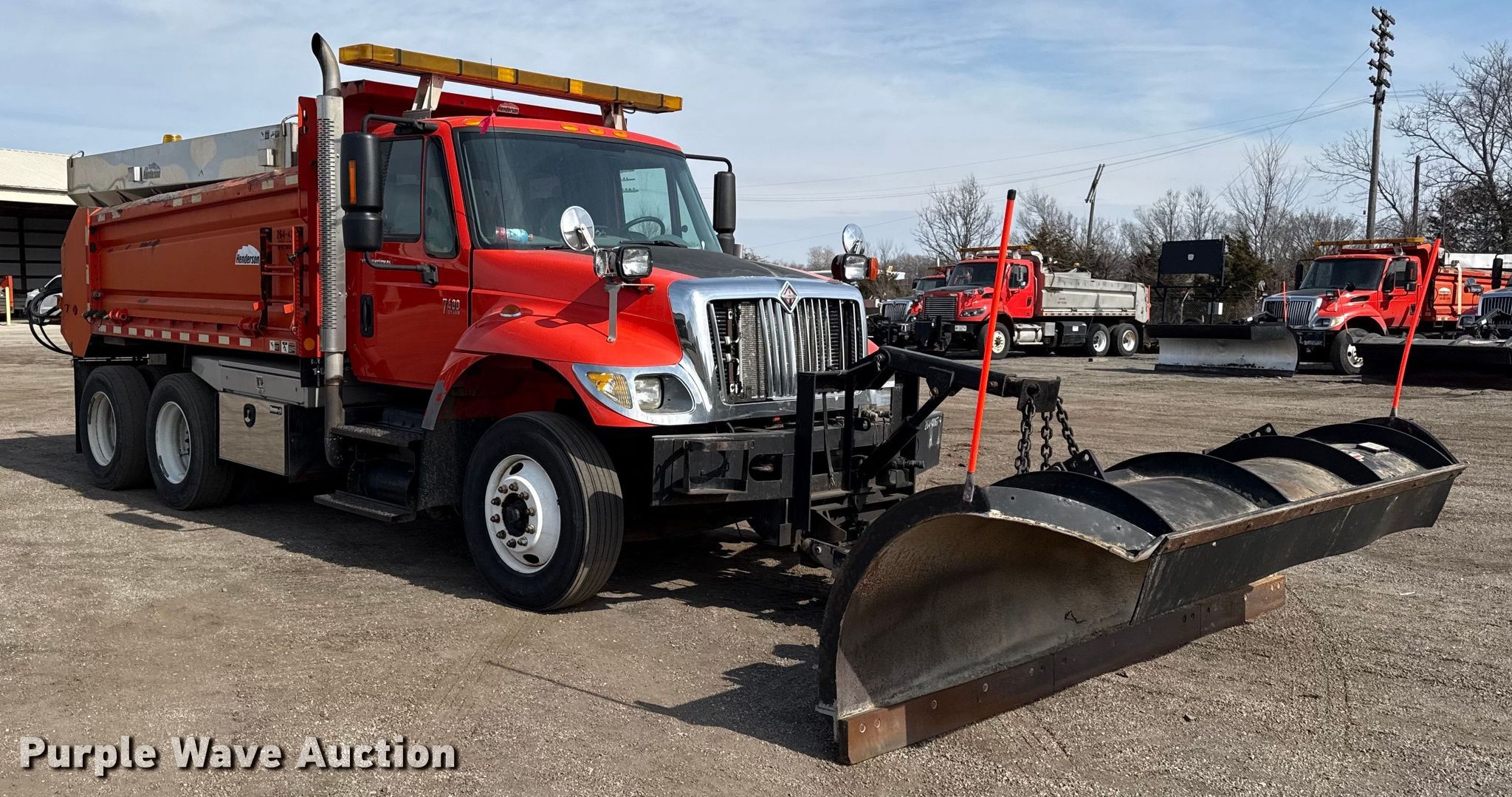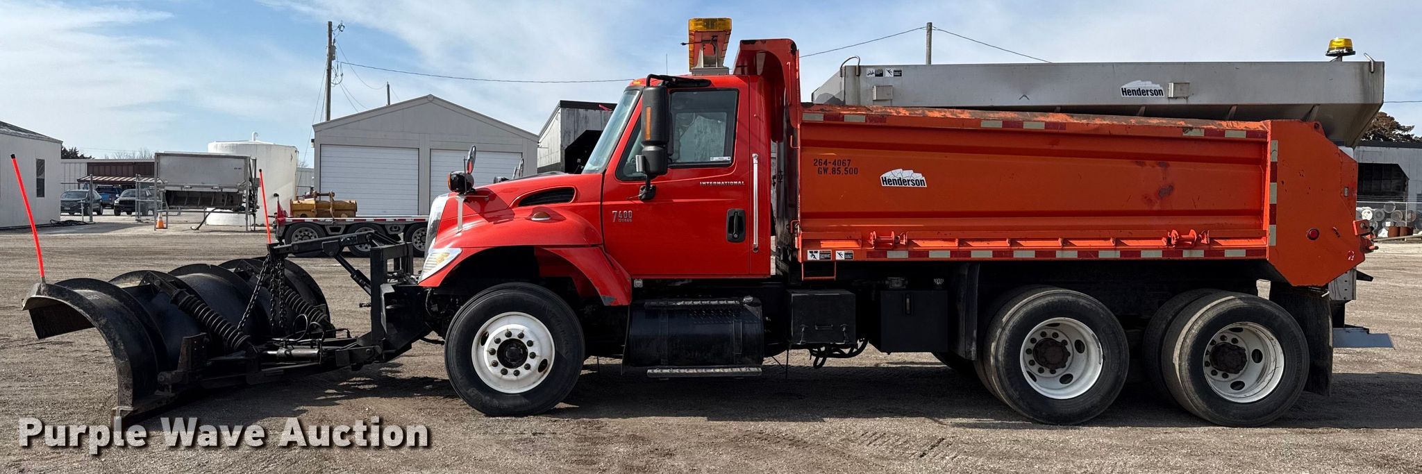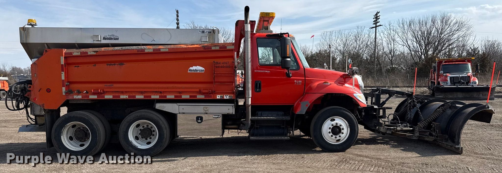2007 International 7400 dump truck. Miles: 214,755 on odometer, Hours: 11,750 on meter, VIN: 1HTWHAAR37J443286, KDOT ID: 264-4067. Engine International DT466, Displacement: 7.6L, Cylinders: 6, Fuel type: Diesel. Transmission Allison, Automatic. Chassis Axles: Tandem, Differential lock: Inter-axle, Suspension: Spring over walking beam, Brakes: Air, Front mount PTO. Interior AC, Heat, Cruise control. Features Bed Dump bed, Henderson, Length: 13' 6", Width: 96", Side height: 32", Bed type: Steel, Ram: Single, End gate: Air operated, Spreader Henderson, Plow Henderson, Width: 132", Wing plow Henderson, Width: 96". Tires Size: 295/75R22.5. Notes Driver side mirror broken, Rust damage. Titles will be distributed after confirmation of payment and removal. Kansas title. Title distribution may be delayed up to 30 days from verification of funds. Kansas Department of Transportation - Chanute. Chanute, KS 66720