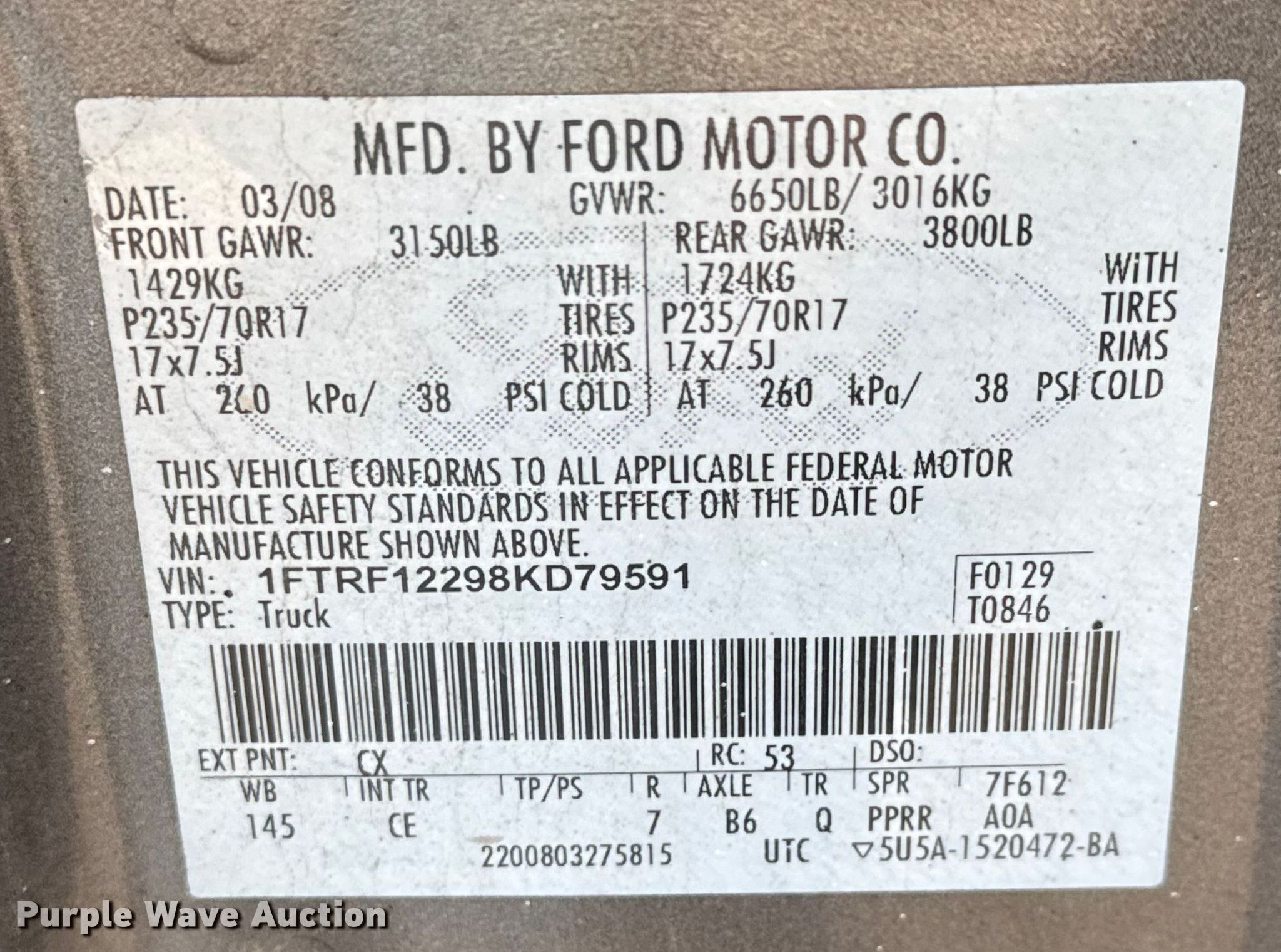 Purple Wave is selling a used 1/2 Ton Pickup or Van in Kansas. This item is a 2008 Ford F150 pickup truck with the following: Miles: 148,551 on odometer, VIN: 1FTRF12298KD79591, KDOT ID: 053-5038