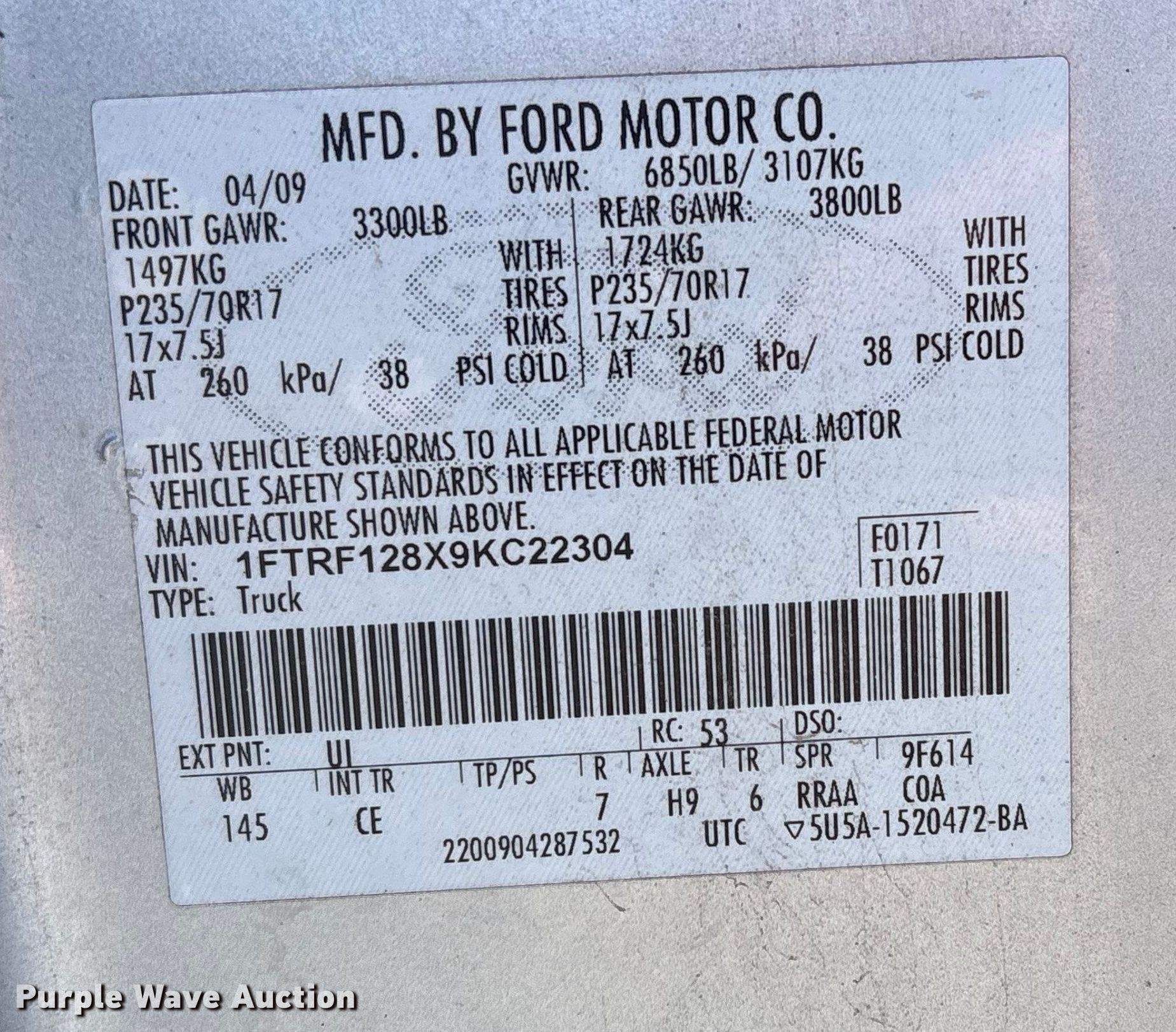 • VIN: 1FTRF128X9KC22304