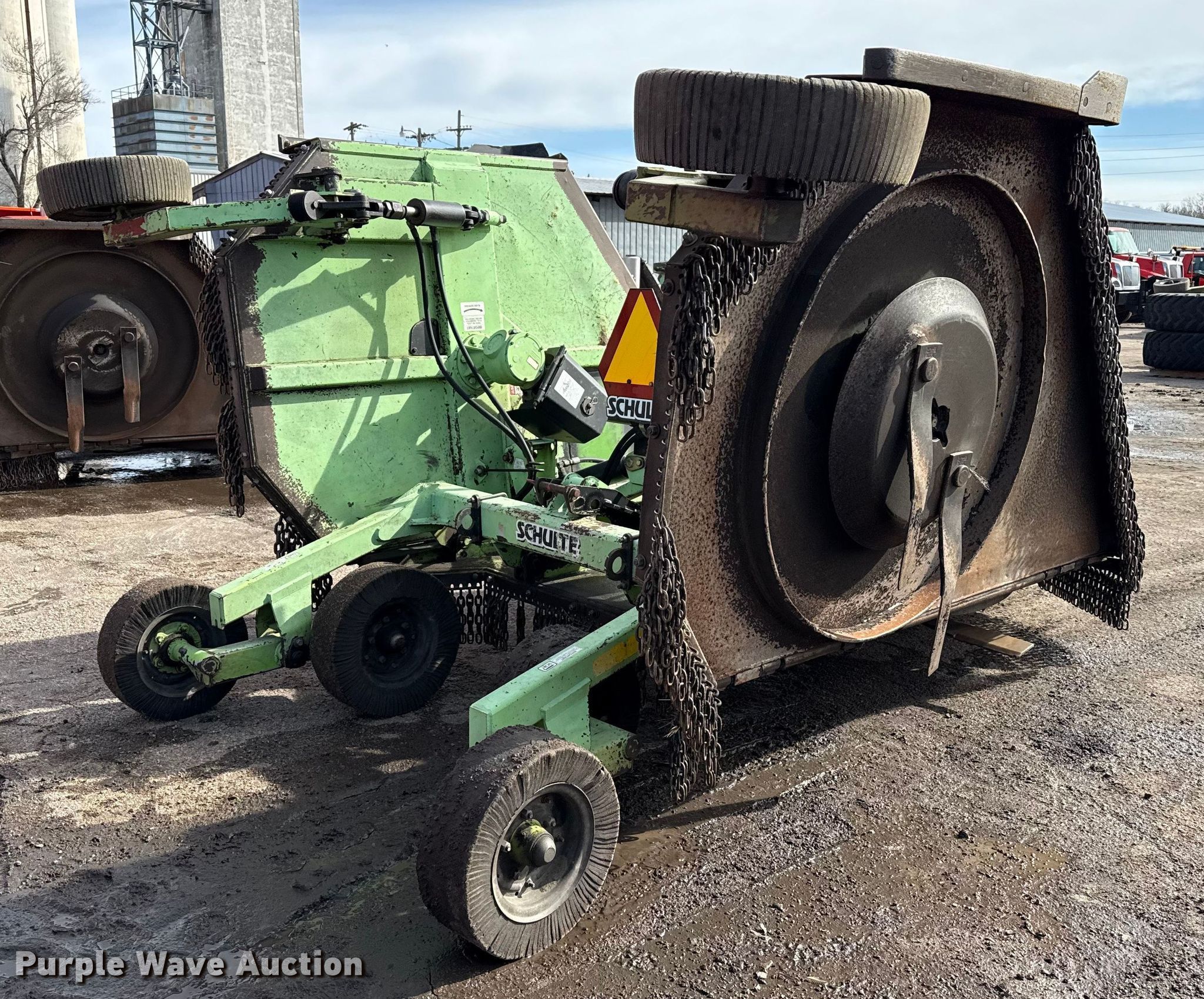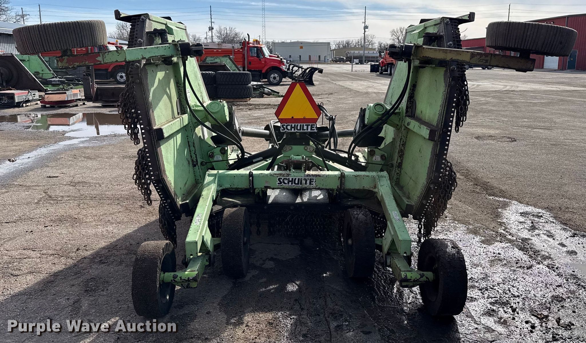 2008 Schulte XH1500 batwing rotary mower. Serial: C30103515712, KDOT ID: 397-5098. Features Width: 15', Hydraulic lift, Hydraulic fold, PTO: 540. Tires Solid. Notes Holes in middle deck, Left side deck patch repairs. Kansas Department of Transportation-Shop. Hutchinson, KS 67504