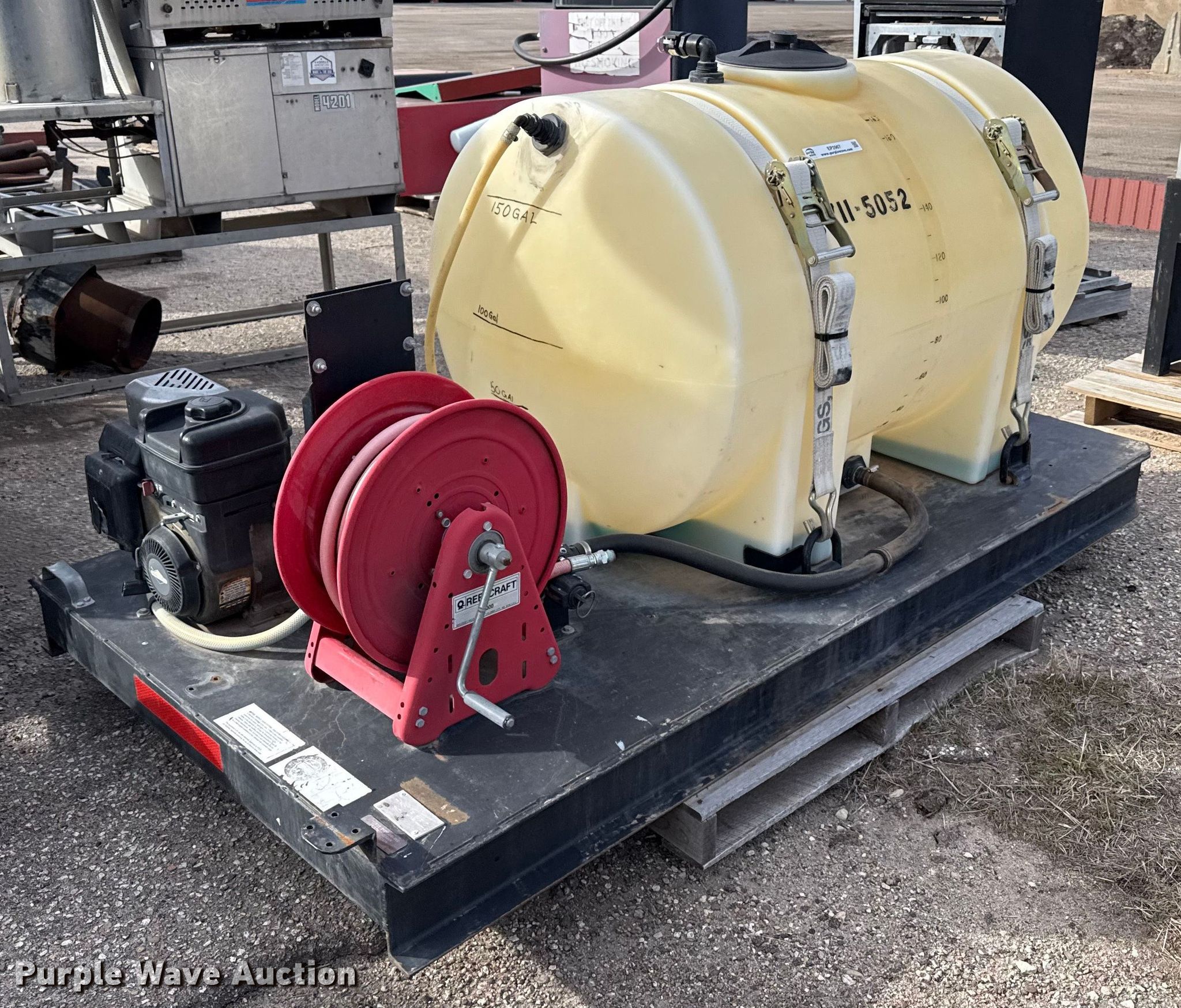 Monroe sprayer. KDOT ID: 711-5052. Engine Briggs & Stratton Fuel type: Gas. Features Solution tank Capacity: 165 gallons, Type: Poly, Hose reel. Notes Unknown operating condition. Kansas Department of Transportation-Shop. Hutchinson, KS 67504