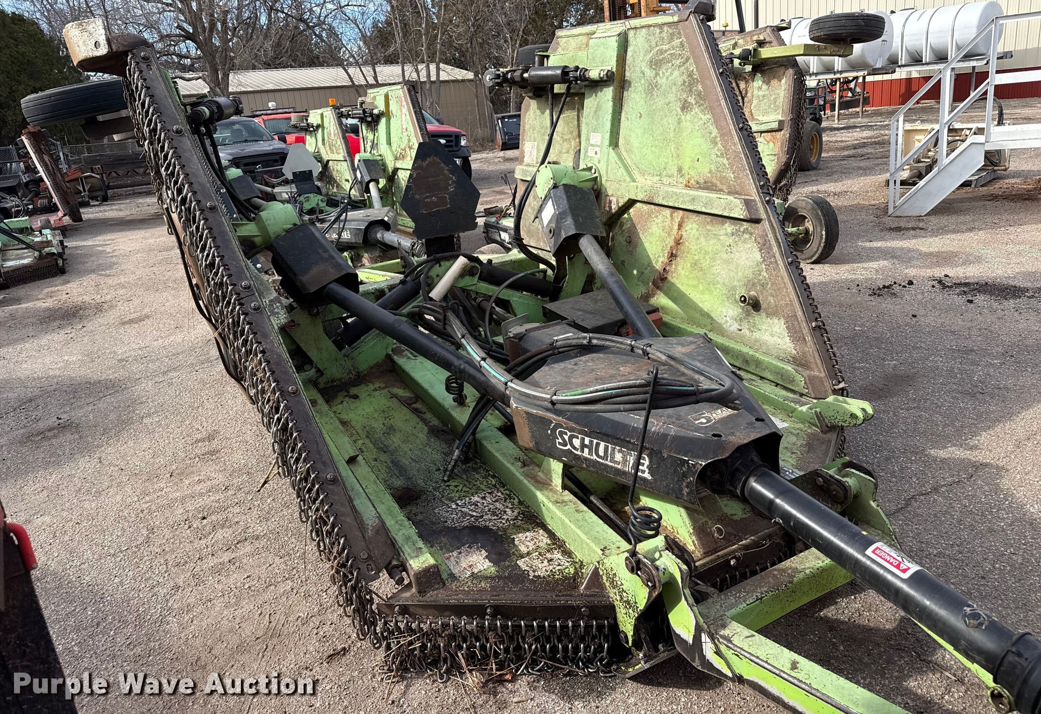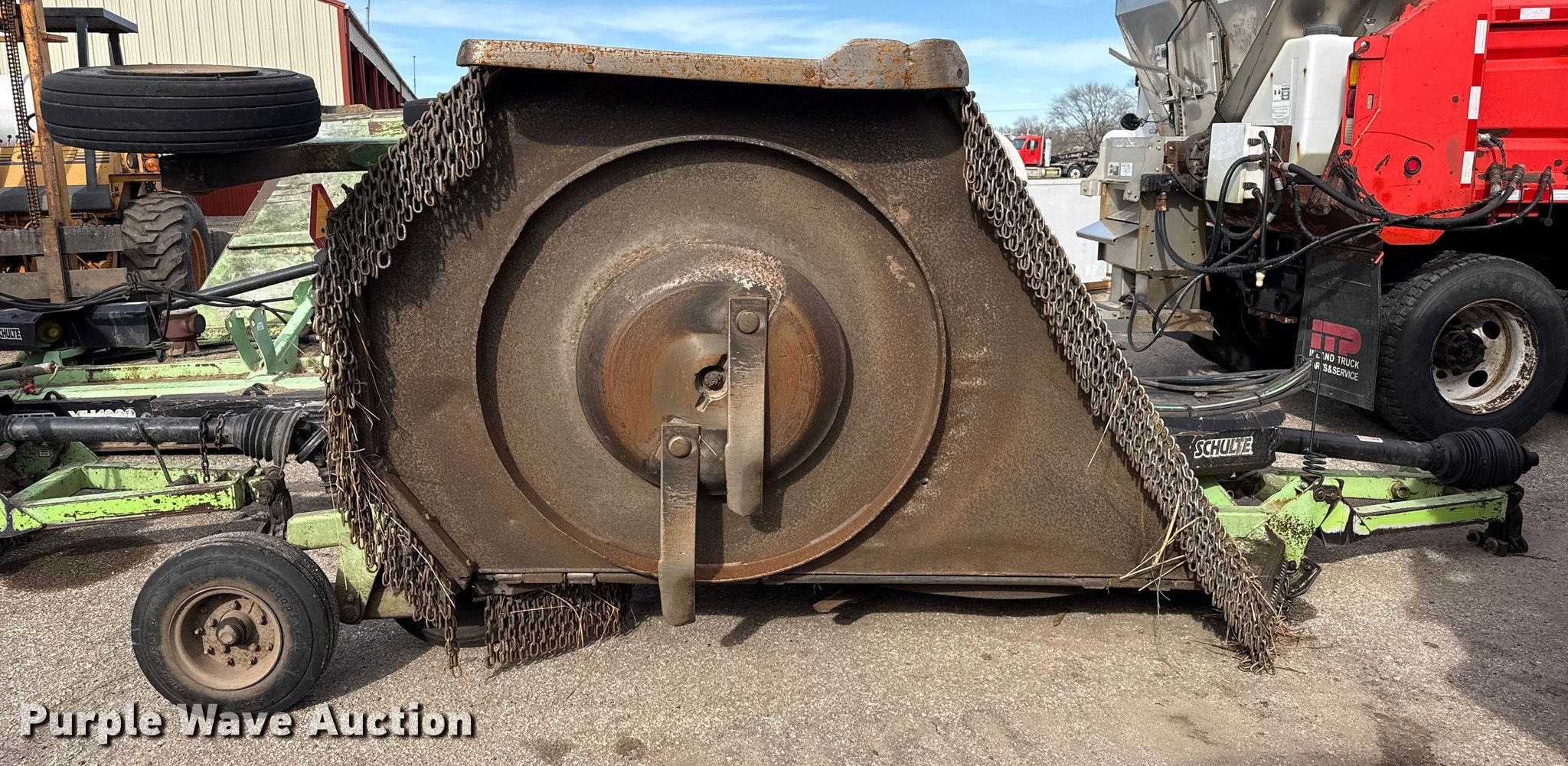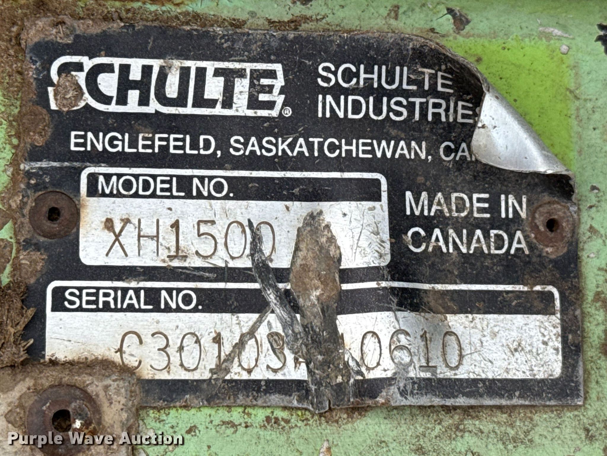 2008 Schulte XH1500 batwing rotary mower. Serial: C30103410610, KDOT ID: 397-5107. Features Width: 15', Hydraulic lift, Hydraulic fold, PTO: 540. Tires Solid. Notes Hole in deck, Hydraulic cylinders leak. Kansas Department of Transportation-Shop. Hutchinson, KS 67504