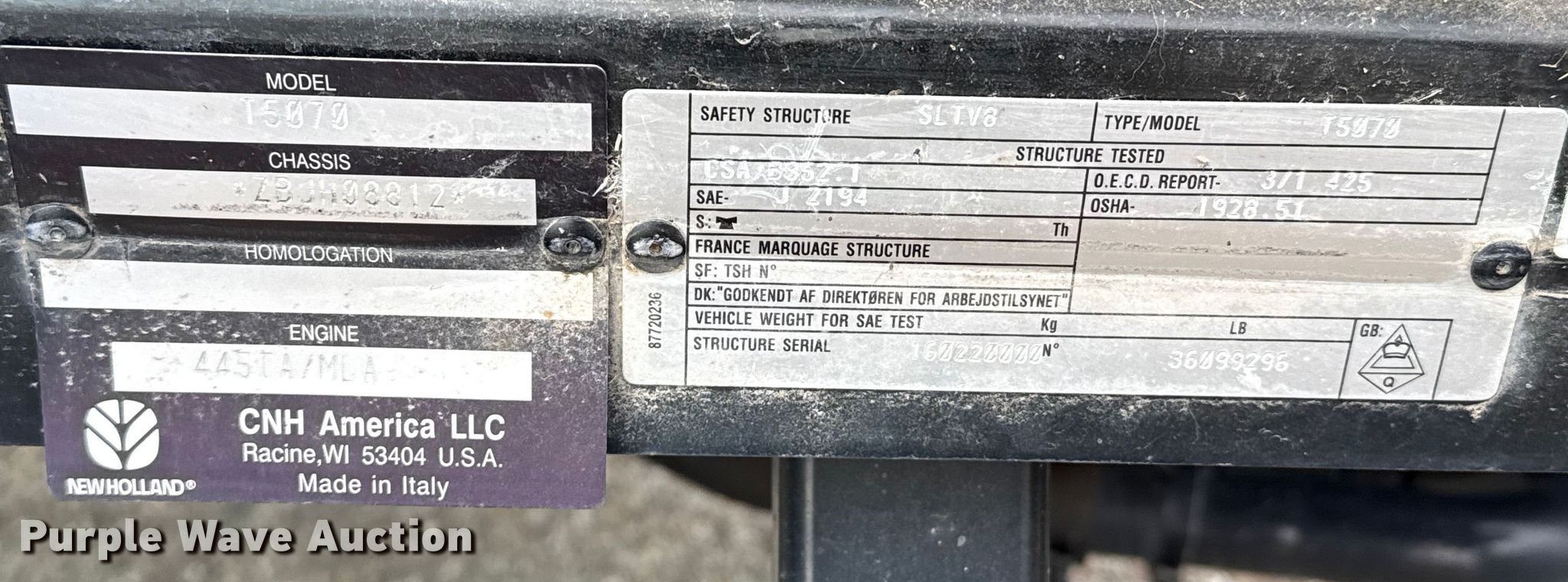 2011 New Holland T5070 MFWD tractor. Hours: 2,652 on meter, Serial: ZBJH08812, KDOT ID: 352-6021. Engine FPT, Cylinders: 4, Fuel type: Diesel. Transmission Synchro, 12F - 12R, Left-hand reverser, Differential lock. Operators station AC, Heat. Features PTO: 540, Seven pin outlet, Hydraulic remote sets Rear: 3, Suitcase weights: 10. Tires Front: 14.9R24, Rear: 18.4R34. Notes Hydraulic leak. Kansas Department of Transportation - Garden City. Garden City, KS 67846