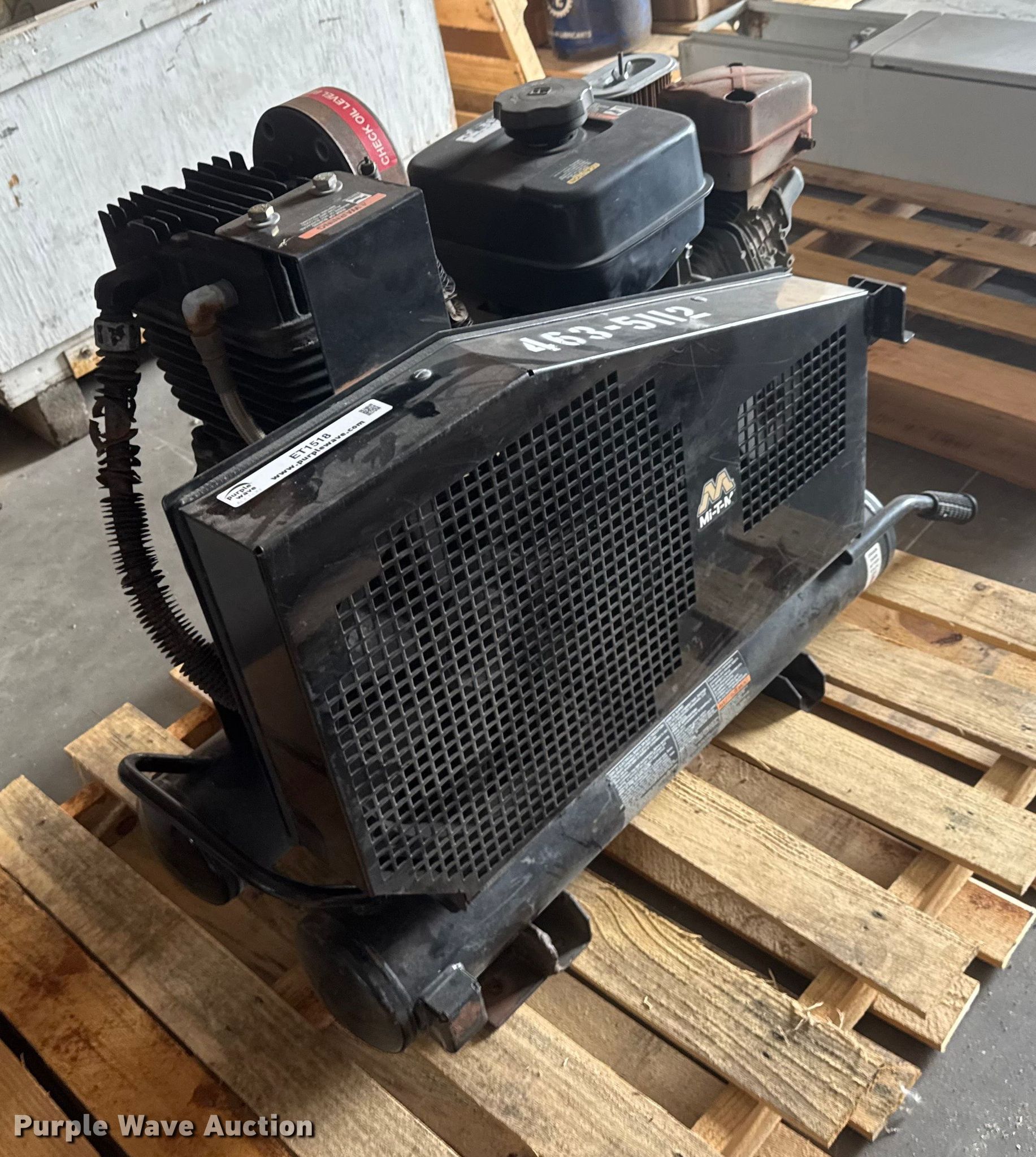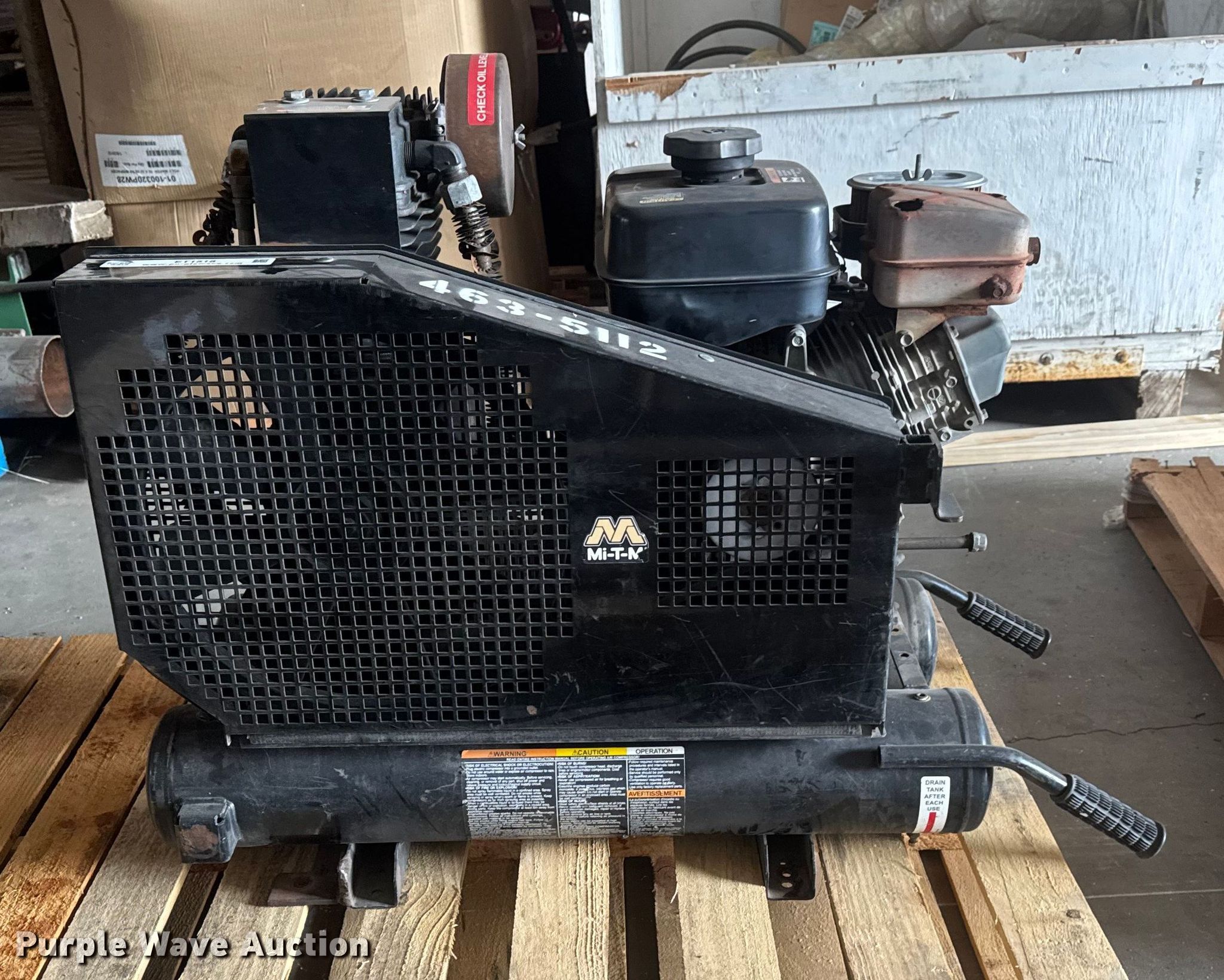 Purple Wave is selling a used Air Compressor in Kansas. This item is a Mi-T-M AM2-PRO9-0 air compressor with the following: Serial: 20142874, KDOT ID: 463-5112