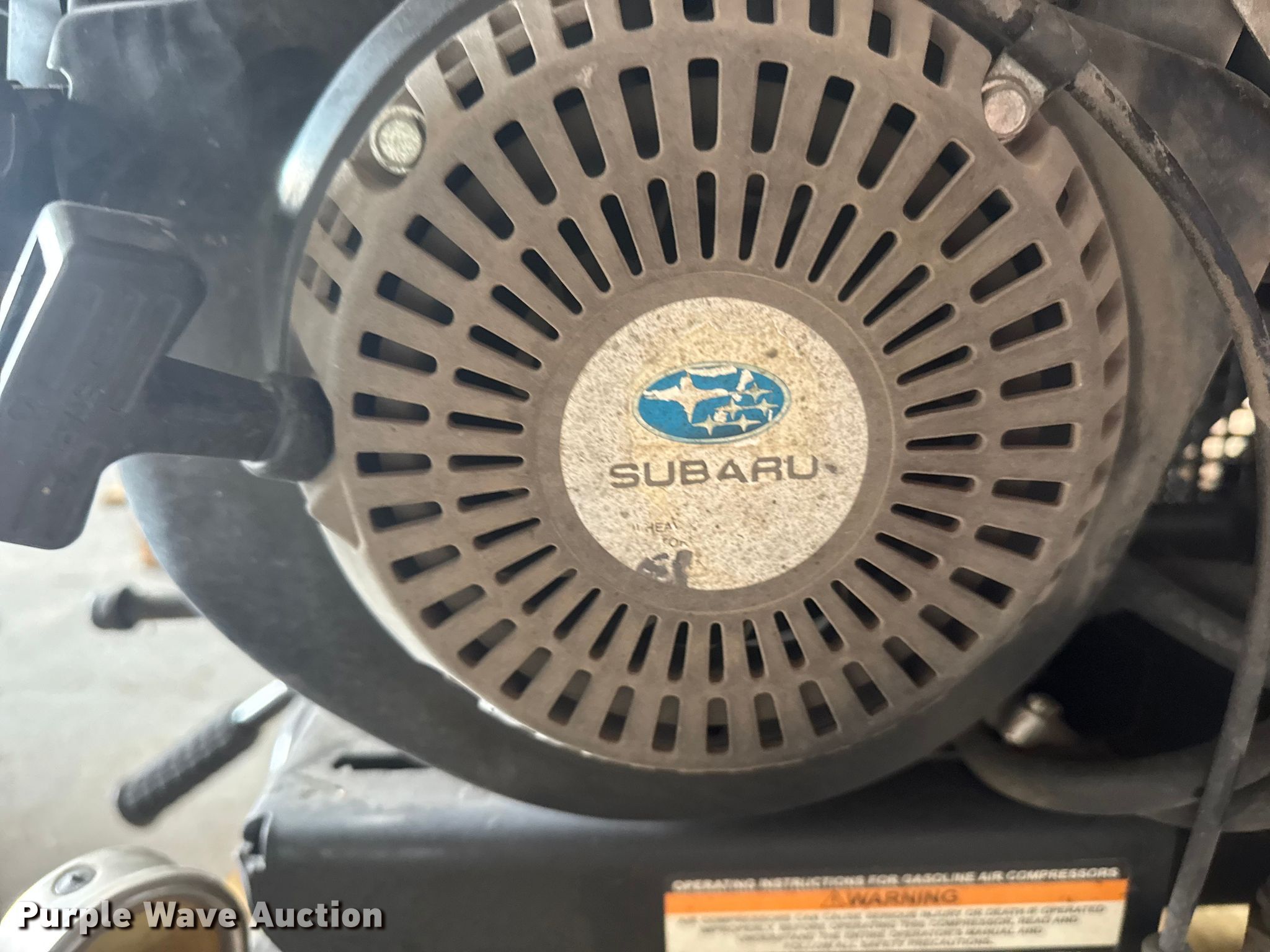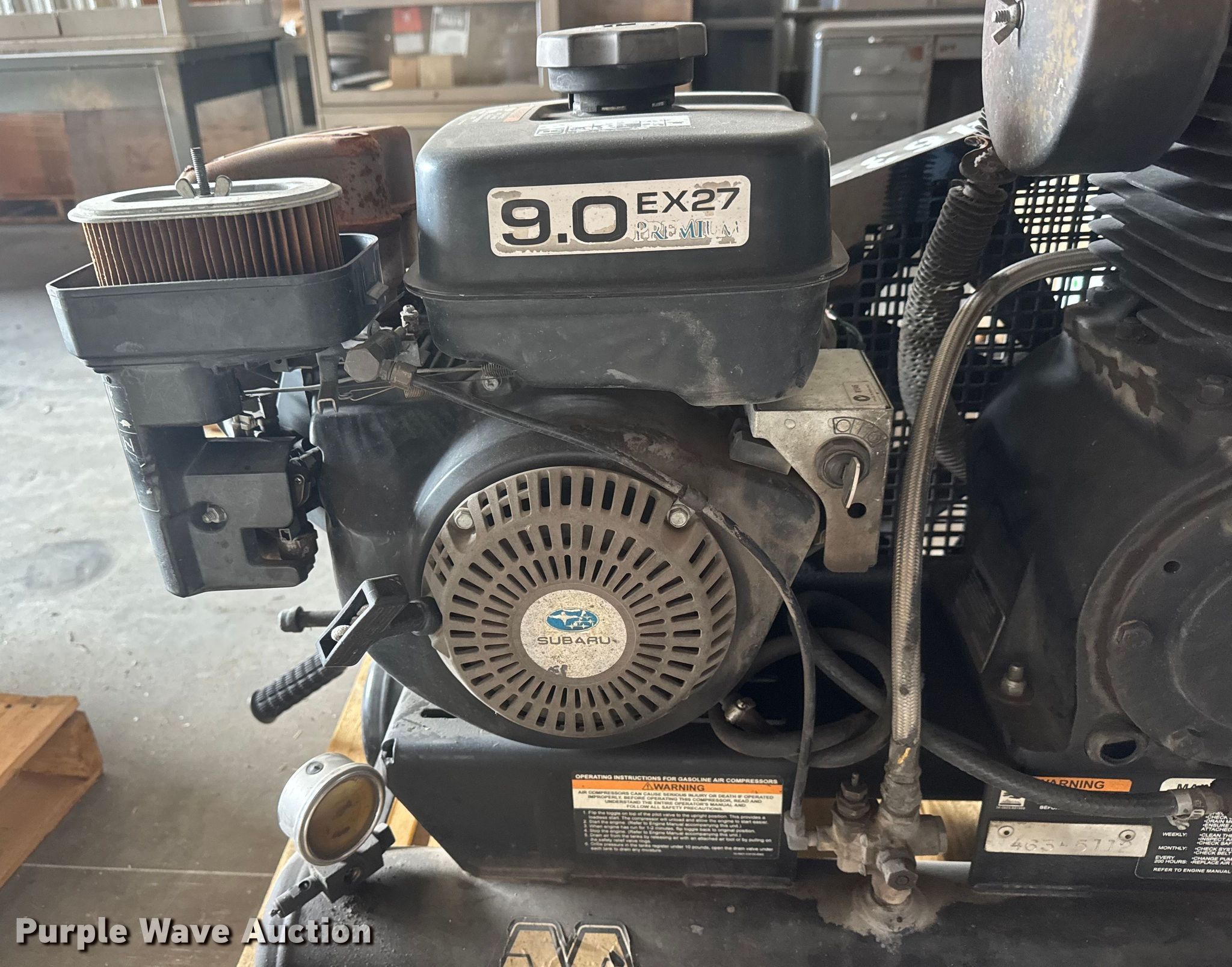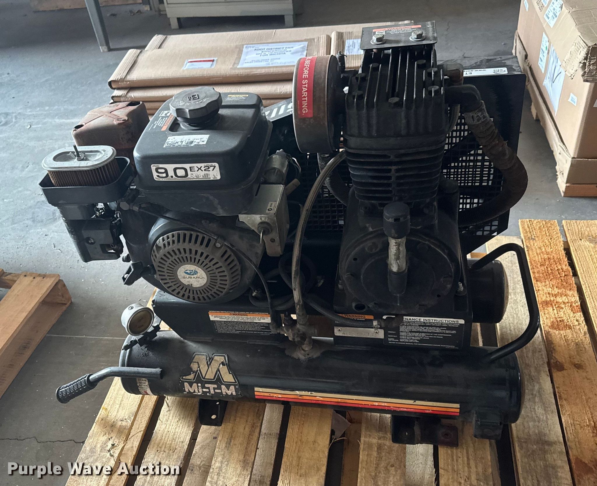 Mi-T-M AM2-PRO9-0 air compressor. Serial: 20142874, KDOT ID: 463-5112. Engine Subaru, Cylinders: 1, Fuel type: Gas. Notes Non-operational unit. Kansas Department of Transportation-Shop. Hutchinson, KS 67504